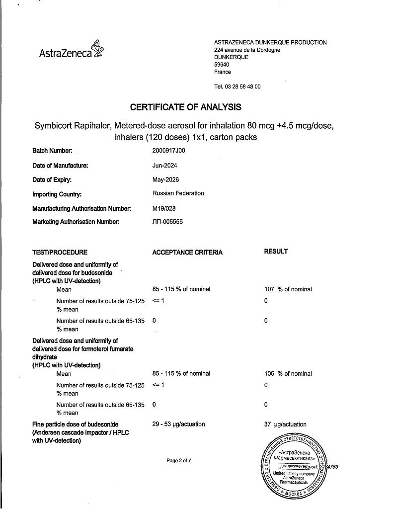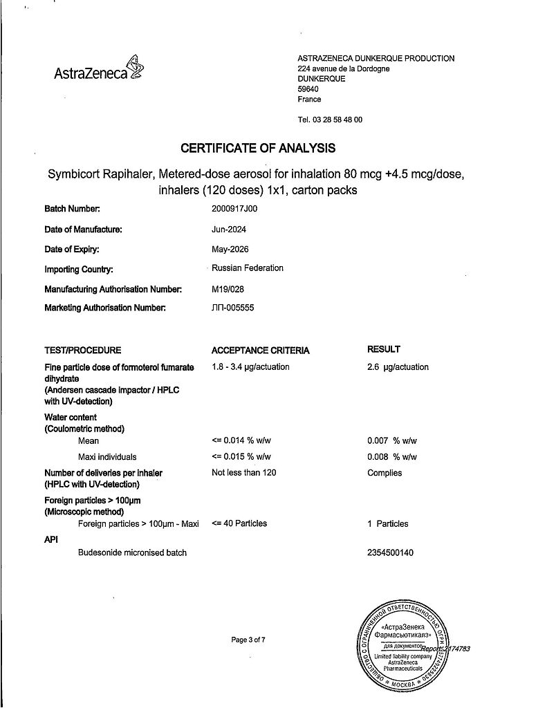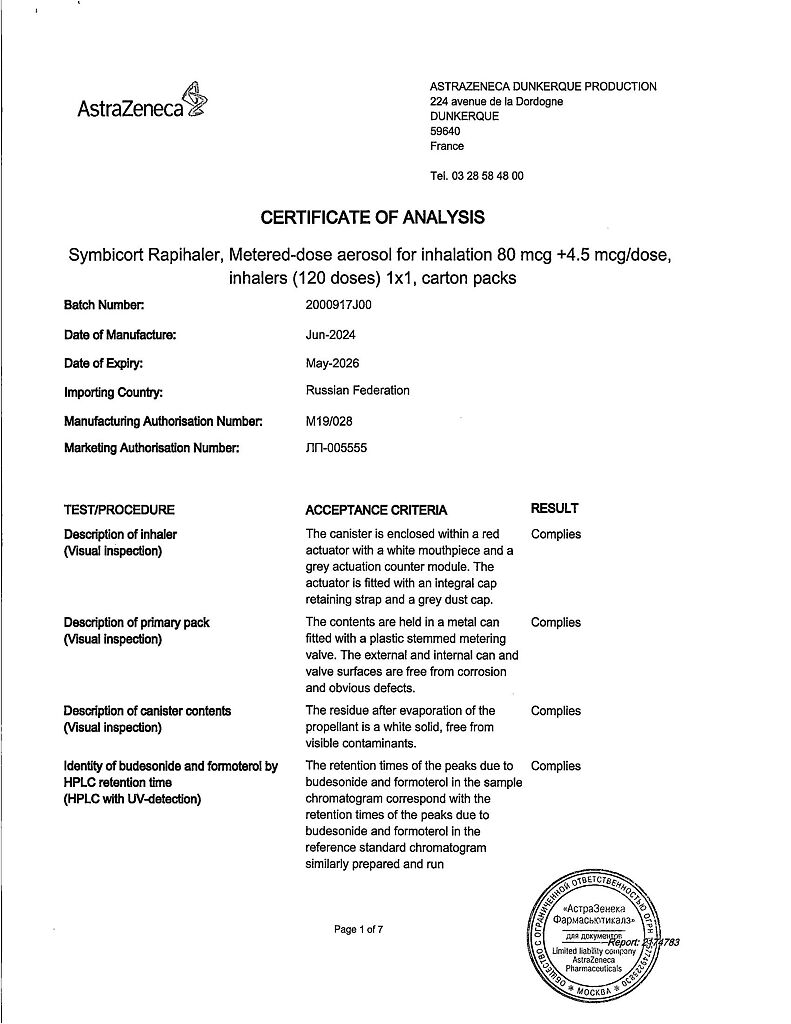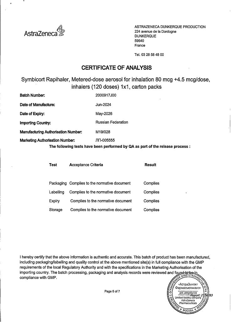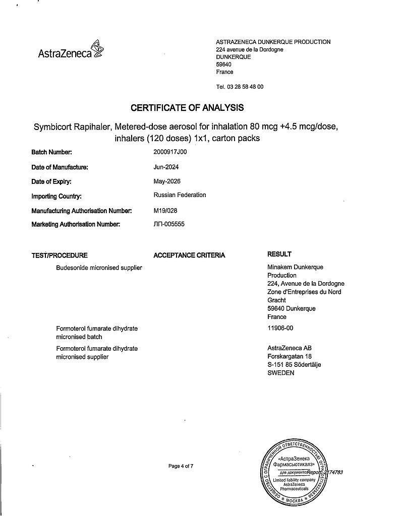 Производитель: АстраЗенека Дюнкерк Продакшн, Франция