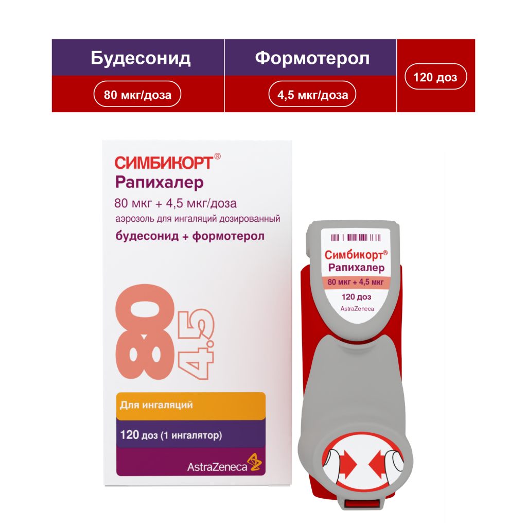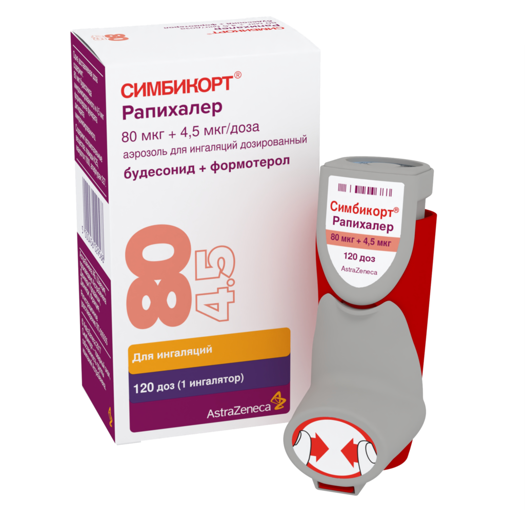 Взрослые в возрасте от 18 лет. Симбикорт® Рапихалер 80 мкг + 4,5 мкг/доза: 2 ингаляции 1–2 раза в сутки. В случае усиления симптомов можно увеличить дозу до 4 ингаляций 2 раза в сутки временно или в качестве поддерживающей дозы.