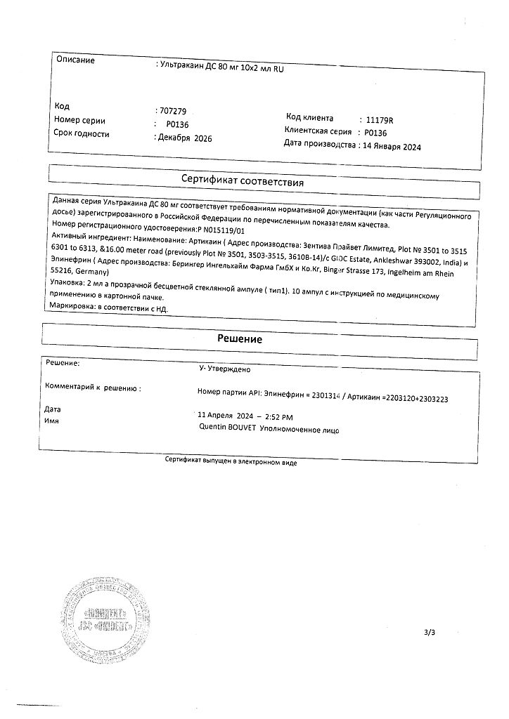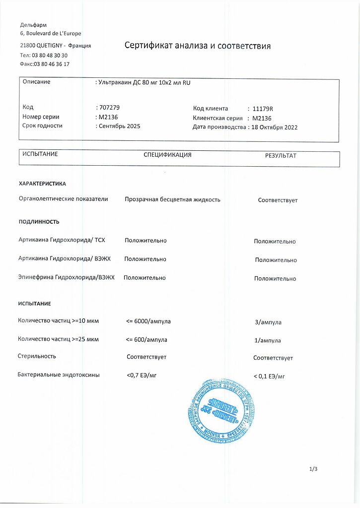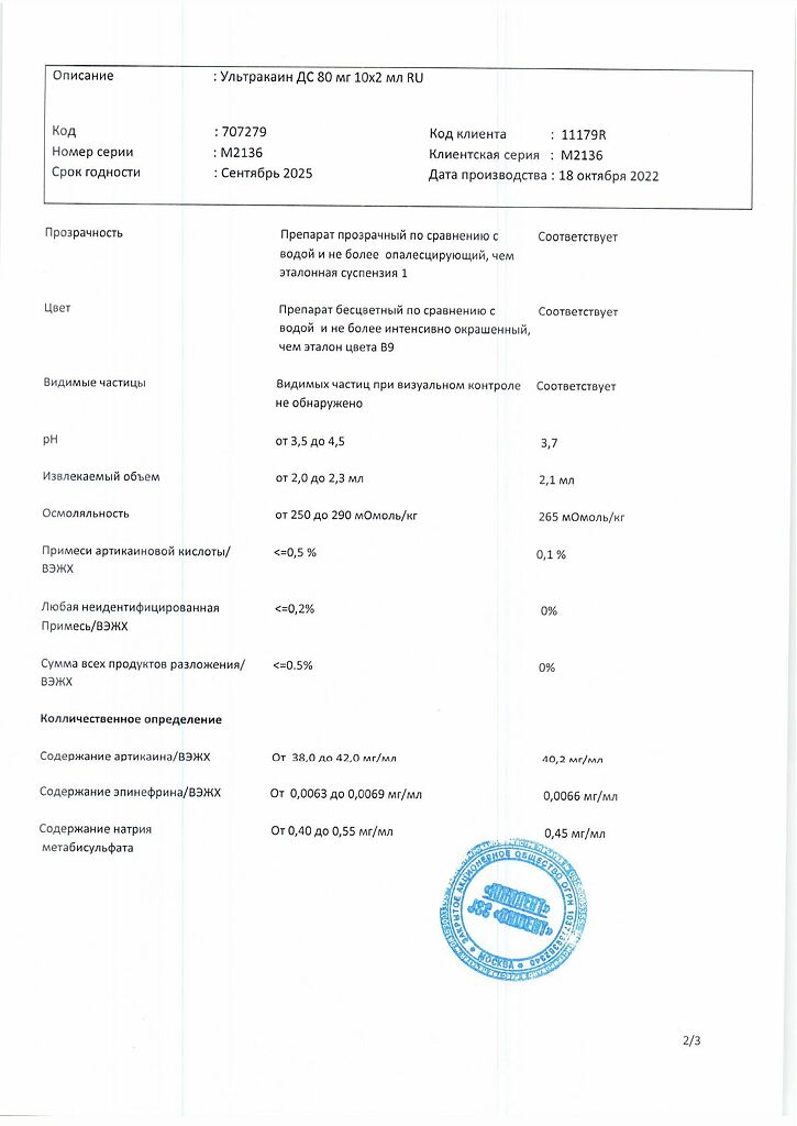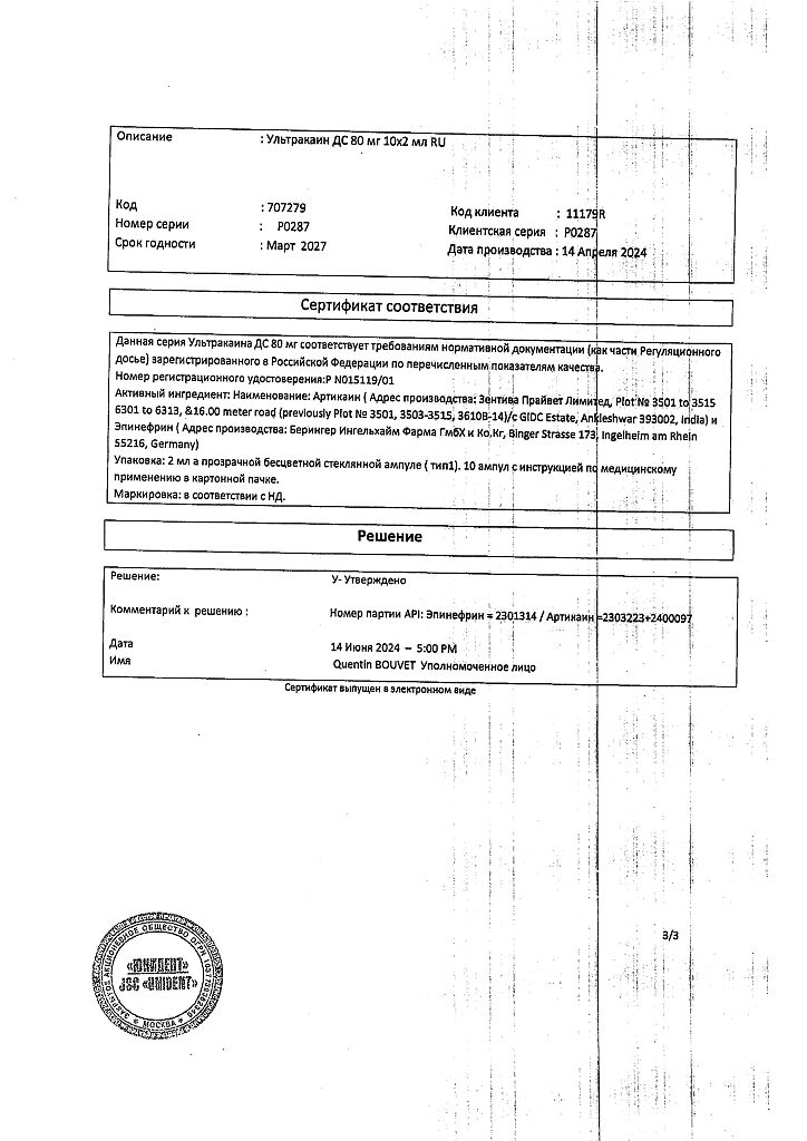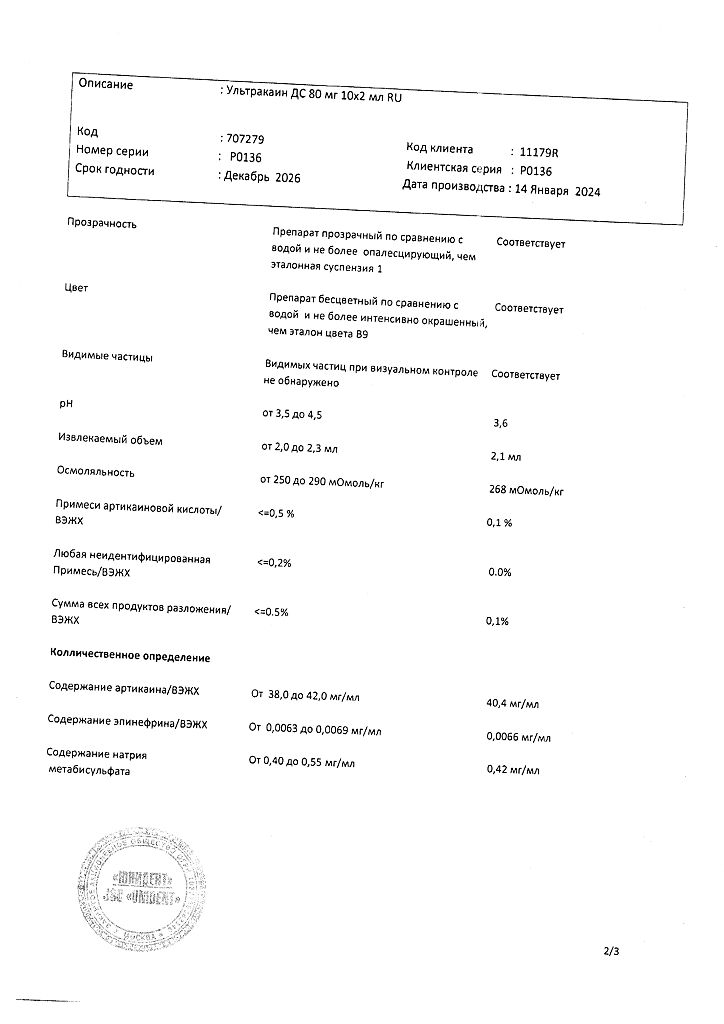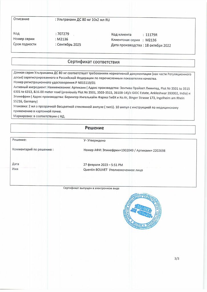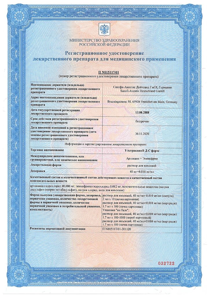 Документы Ультракаин Д-С раствор для инъекций 40 мг+0,005 мг/мл 2 мл амп 10 шт
