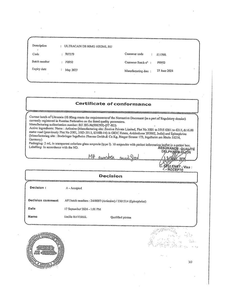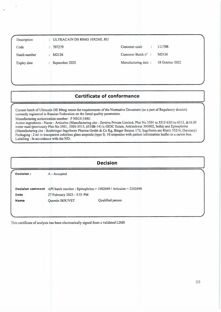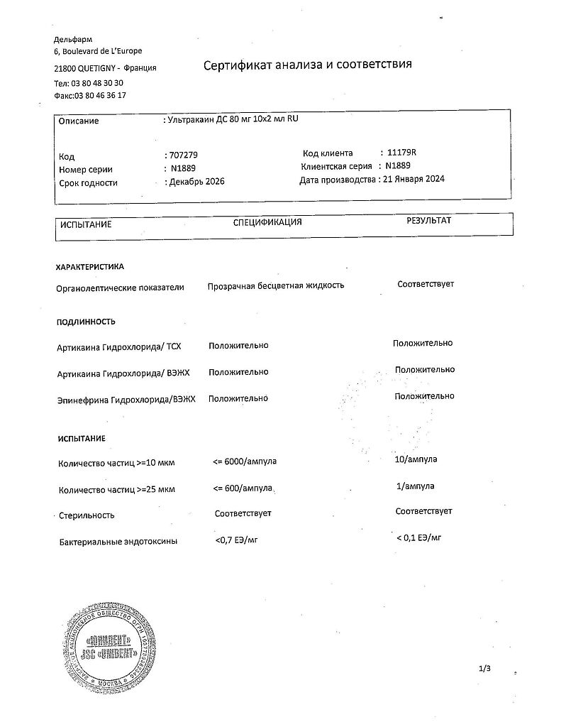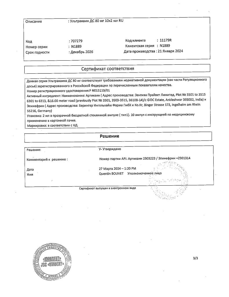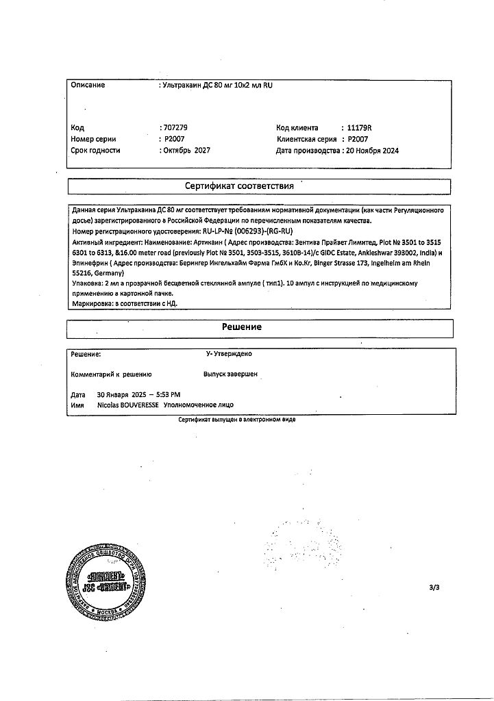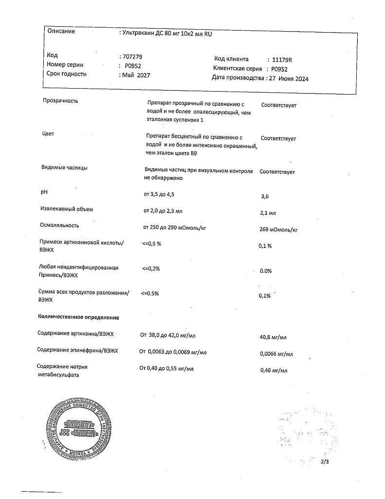Документы Ультракаин Д-С раствор для инъекций 40 мг+0,005 мг/мл 2 мл амп 10 шт