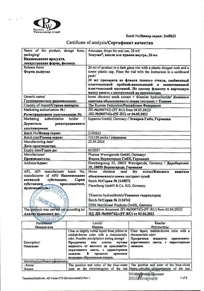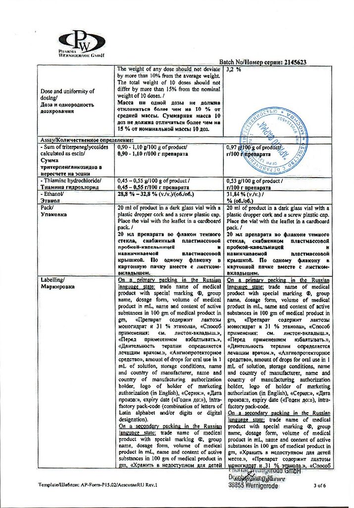 конского каштана семян экстракт сухой (Hippocastani extractum siccum normatum) 5–7:1 4,725 г (экстрагент — этанол 60% об/об), тиамина гидрохлорид 0,5 г,
