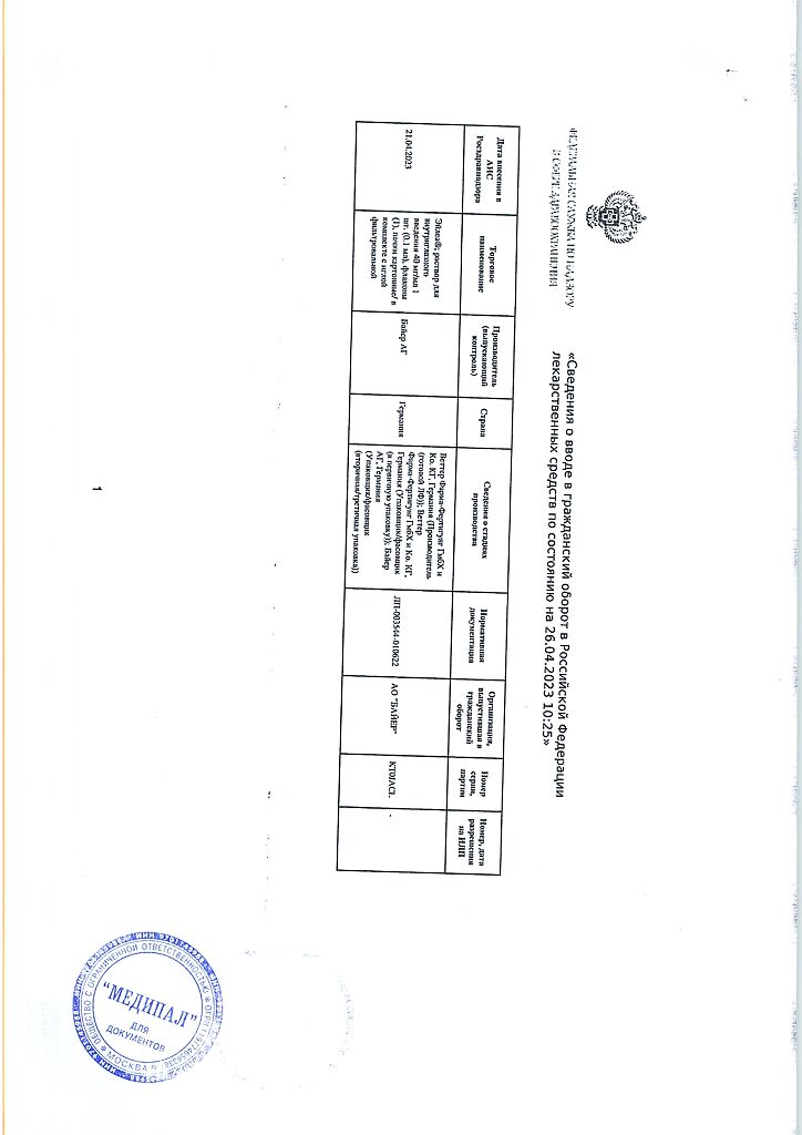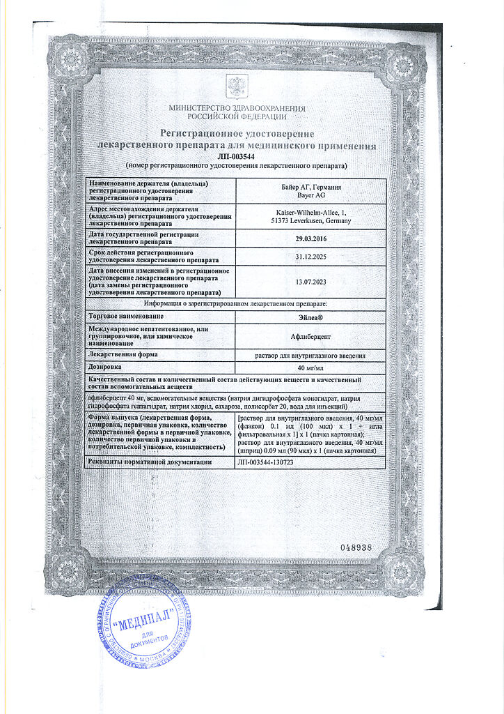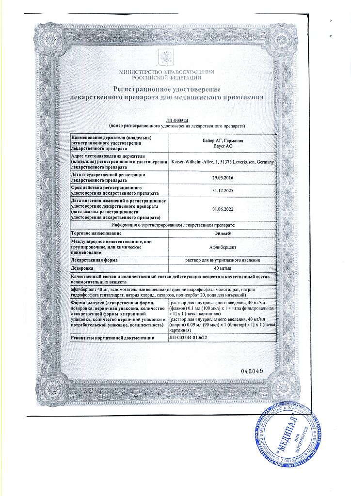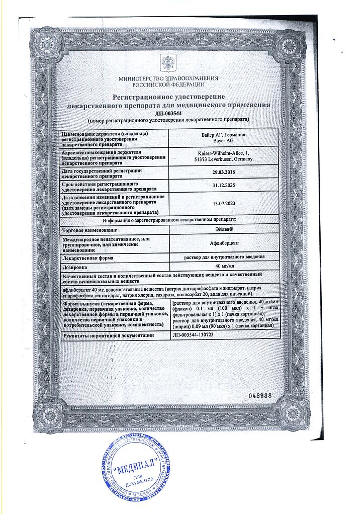 Один флакон содержит 100 мкл раствора, что эквивалентно 4 мг афлиберцепта.