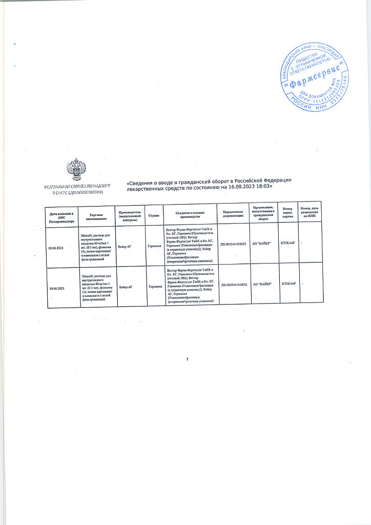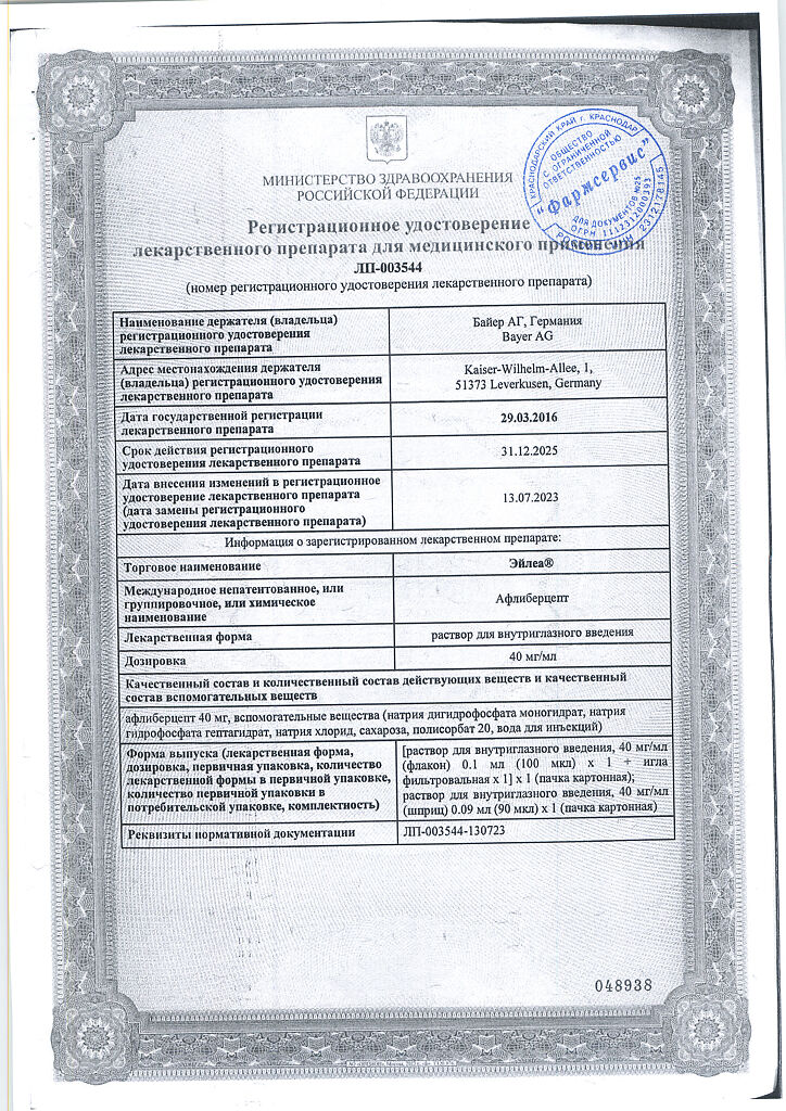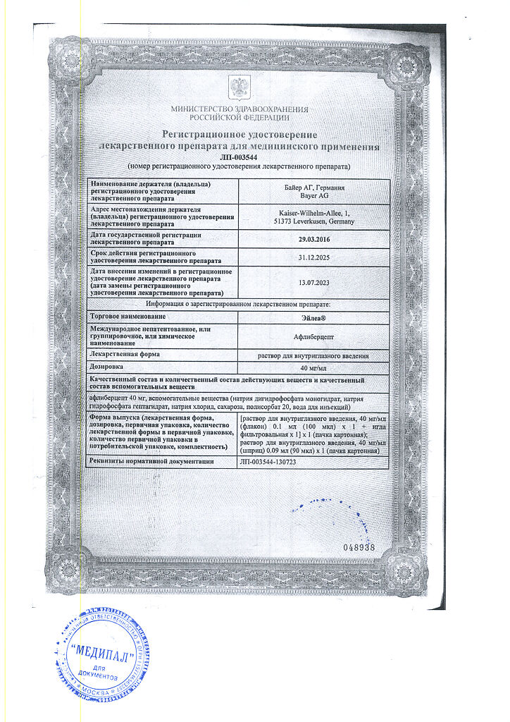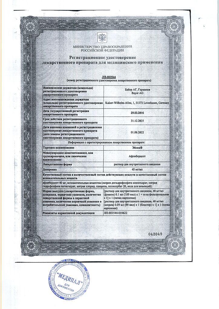 Рекомендованная доза препарата Эйлеа® составляет 2 мг афлиберцепта, что эквивалентно 50 мкл раствора.