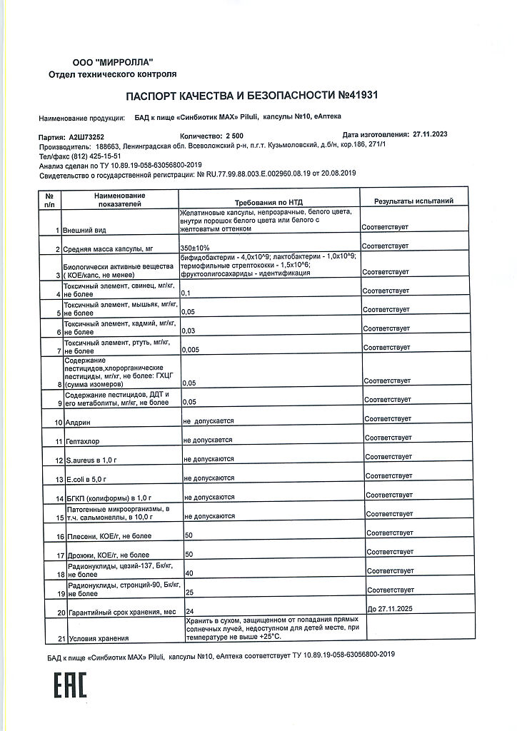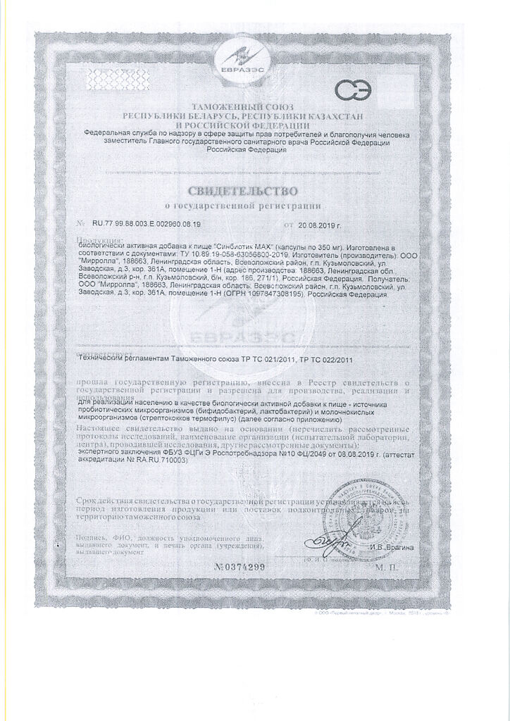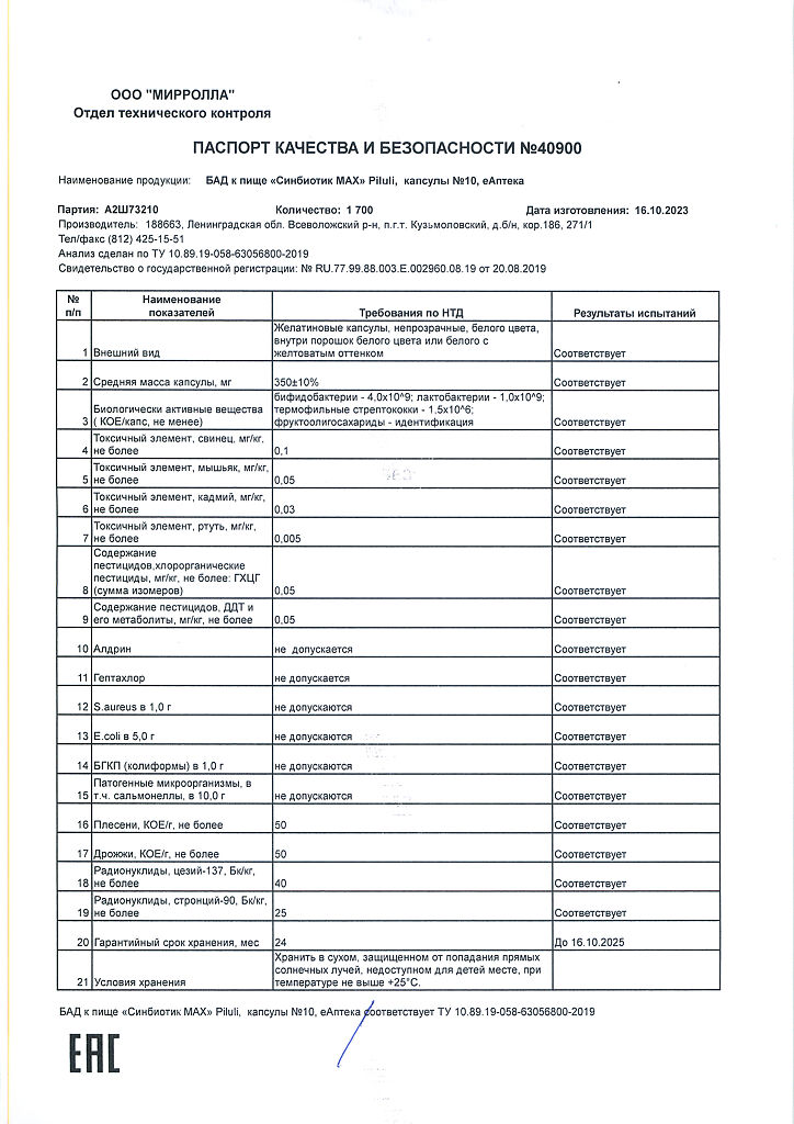 Содержание пробиотических микроорганизмов (КОЕ/капс, не менее): бифидобактерий – 4,0×10⁹, лактобактерий – 1,0×10⁹, термофильного стрептококка – 1,5×10⁶.