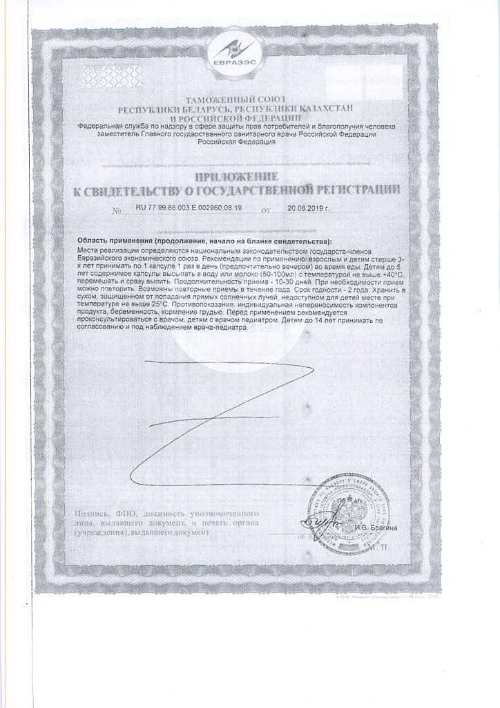 взрослым и детям старше 3-х лет принимать по 1 капсуле 1 раз в день (предпочтительно вечером) во время еды. Детям до 5 лет содержимое капсулы высыпать в воду или молоко (50-100 мл) с температурой не выше +40 °С, перемешать и сразу выпить.