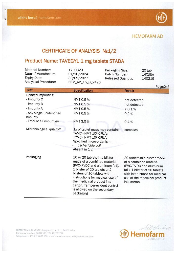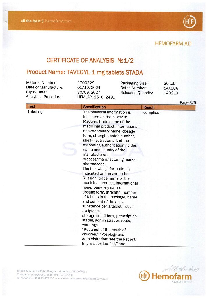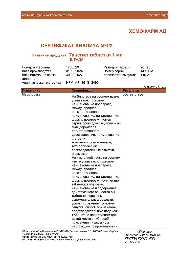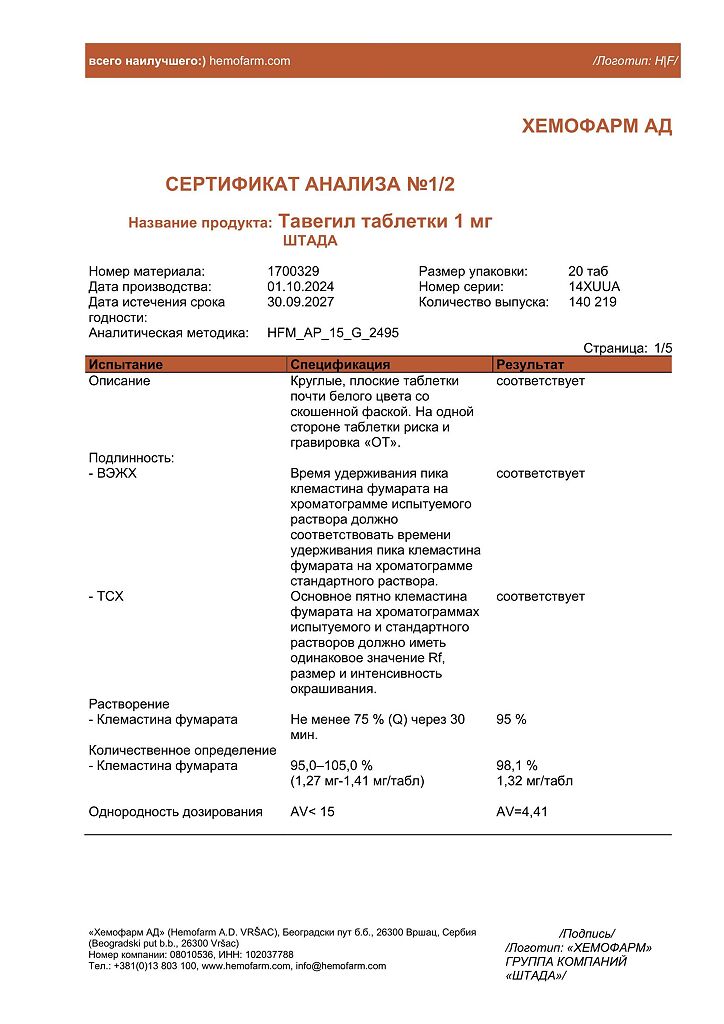 Действующее вещество – 1,340 мг клемастина фумарат (в пересчете на 1 мг клемастина).