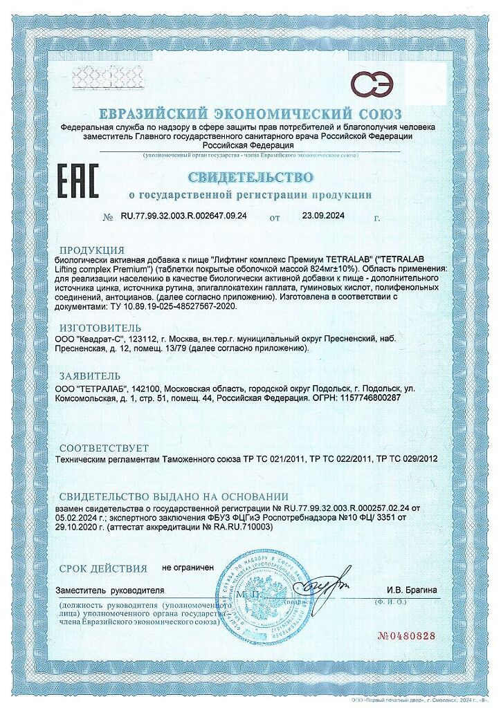 Документы Tetralab Лифтинг комплекс Премиум таблетки покрыт.об. массой 824 мг 60 шт