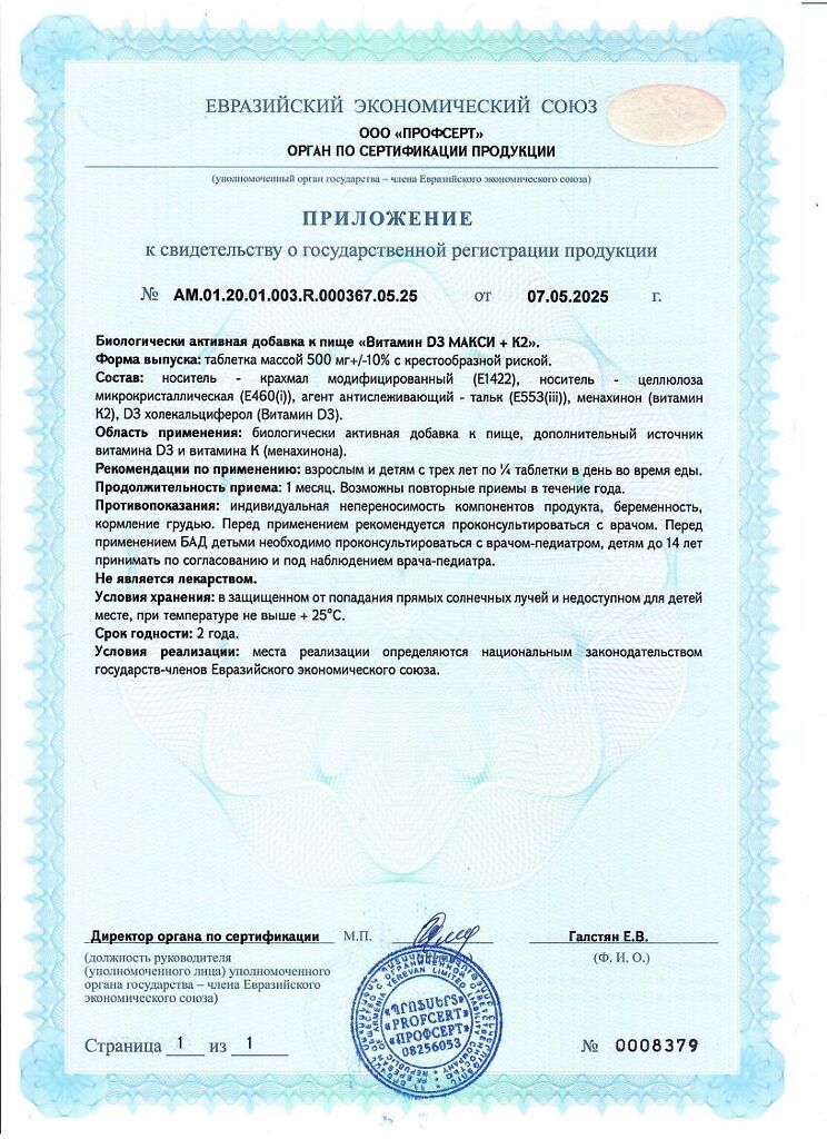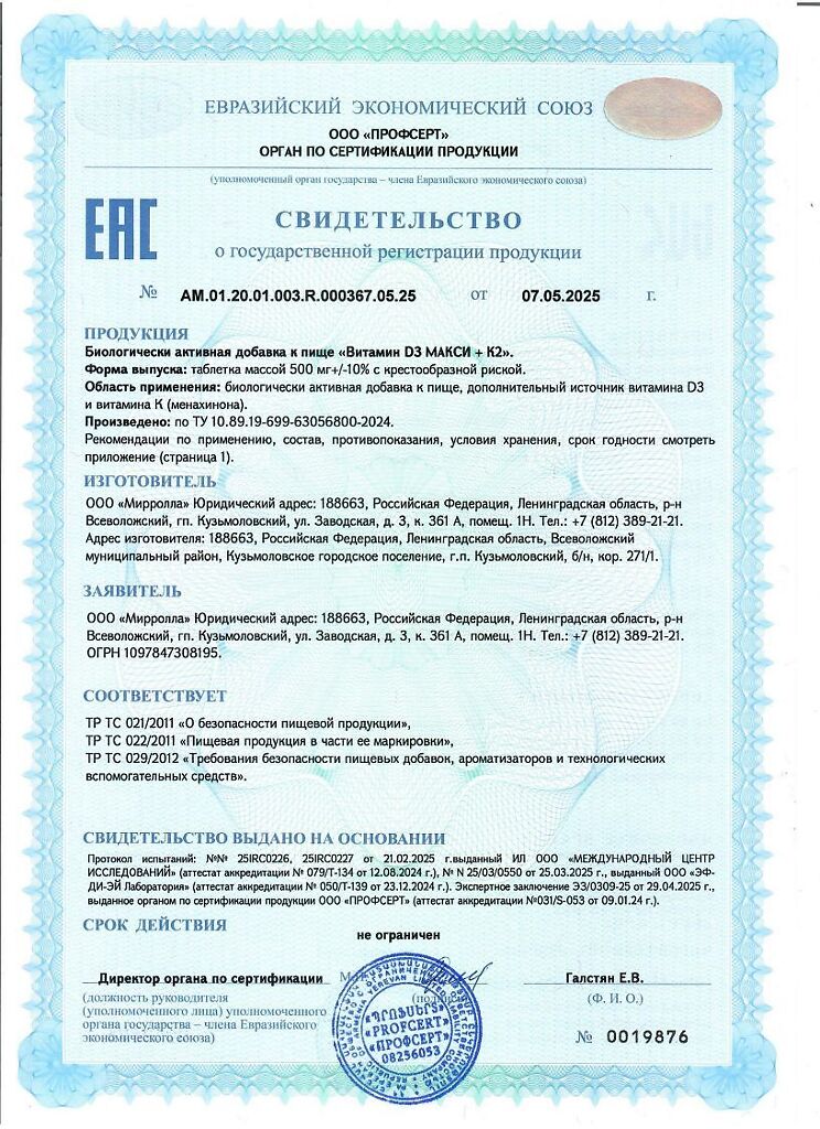 Документы Mirrolla Витамин D3 МАКСИ+К2 таблетки массой 500 мг 60 шт