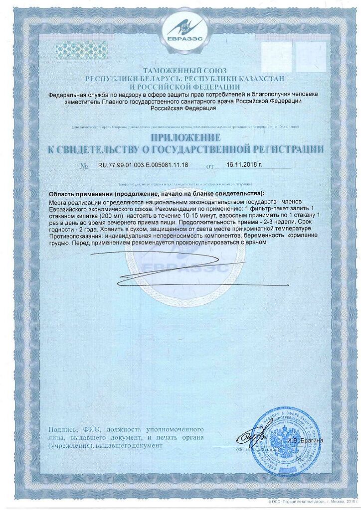 1 фильтр-пакет залить 1 стаканом кипятка (200 мл), настоять в течение 10-15 минут. Взрослым принимать по 1 стакану 1 раз в день во время вечернего приема пищи. Продолжительность приема - 2-3 недели.