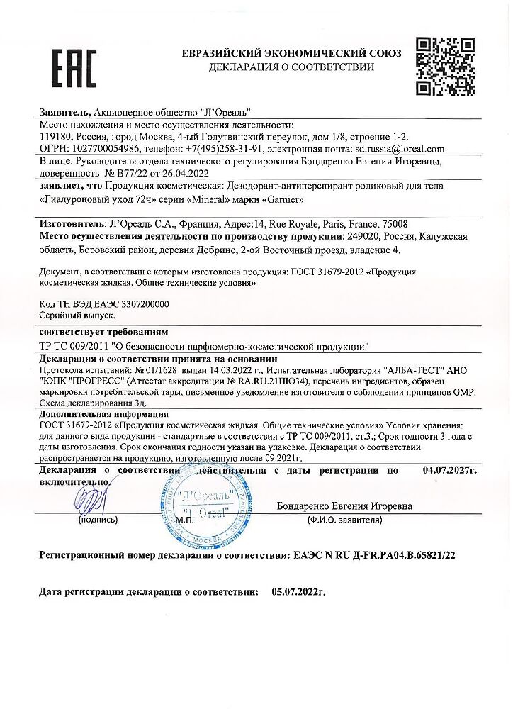 Документы Garnier Mineral Дезодорант-антиперспирант роликовый для тела Гиалуроновый уход 72ч женский 50 мл 1 шт