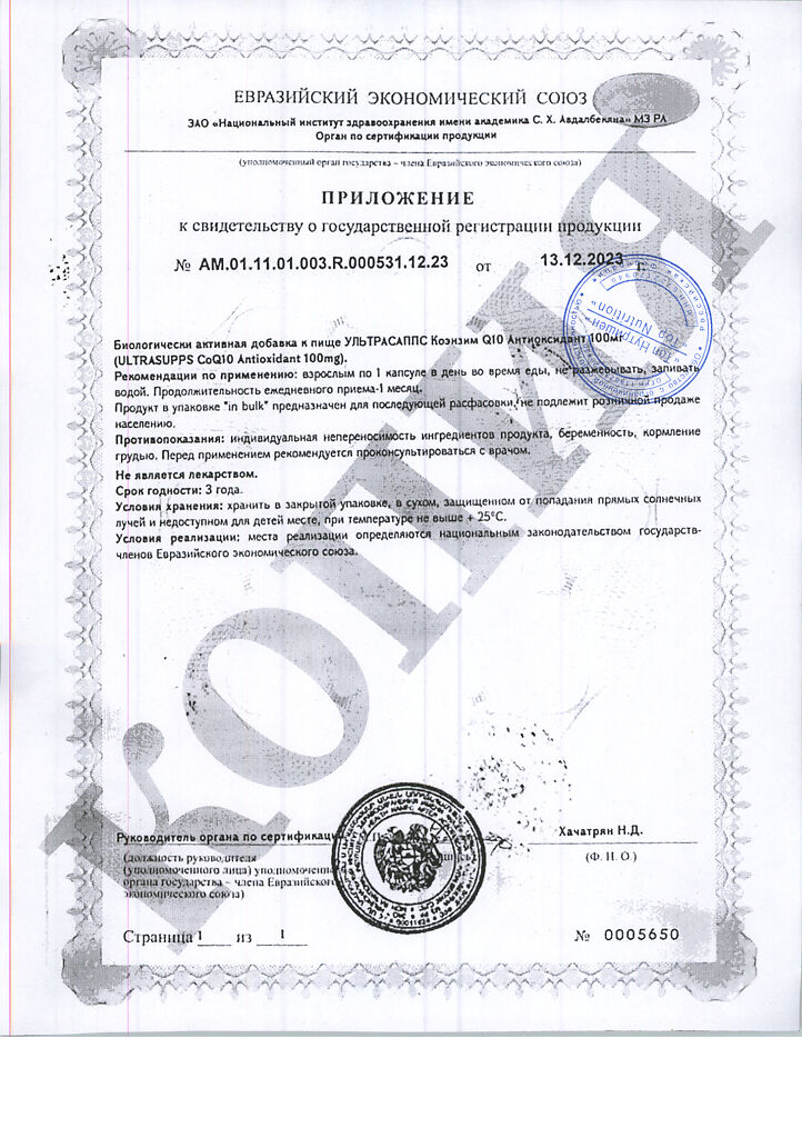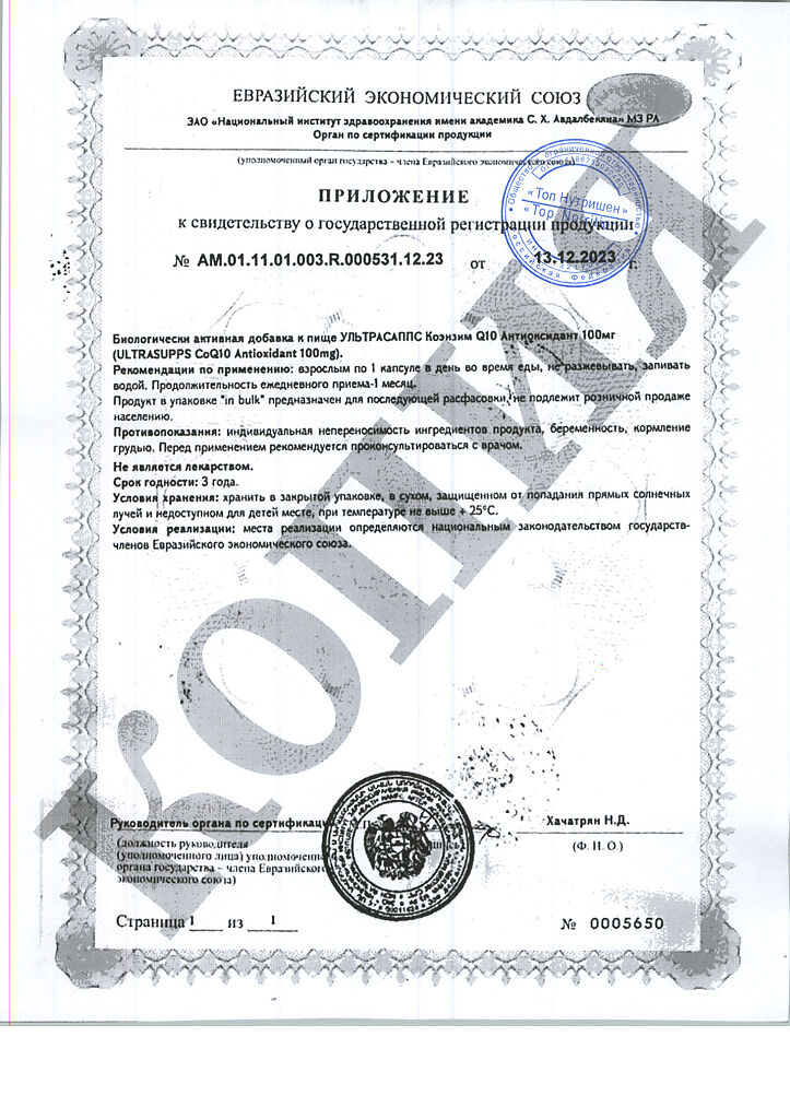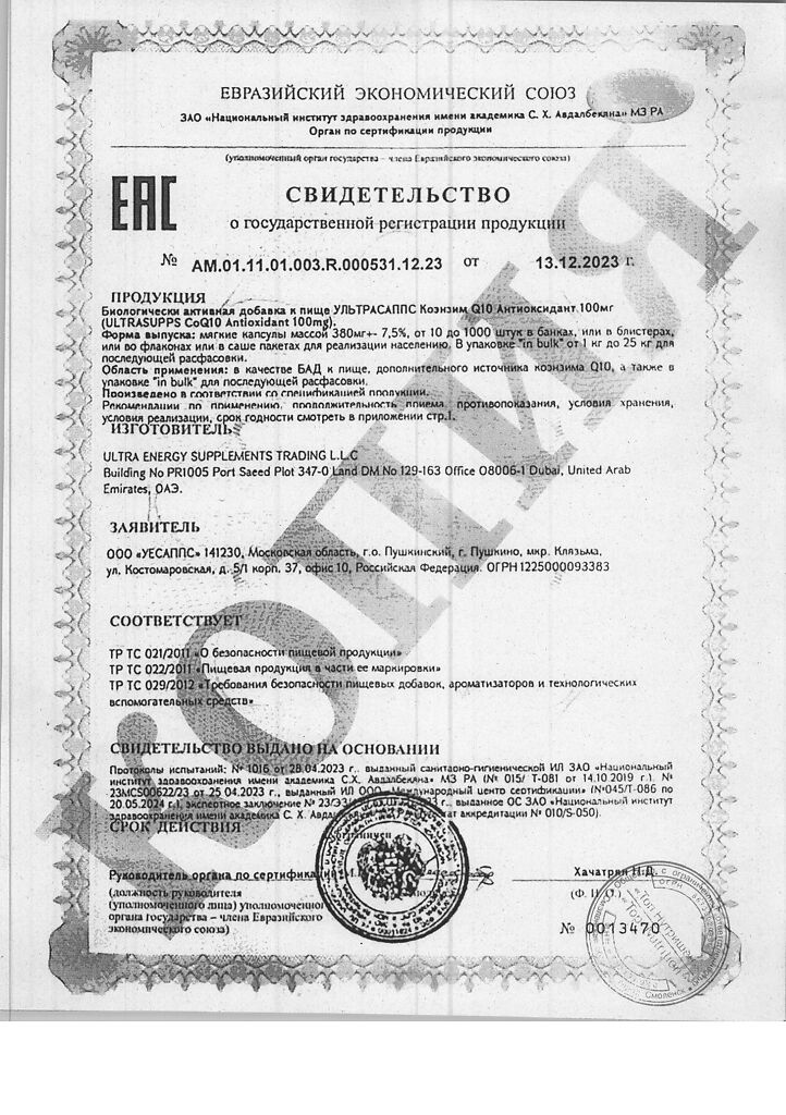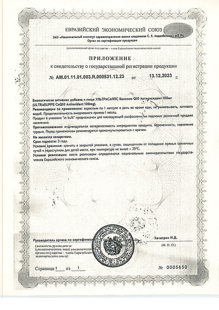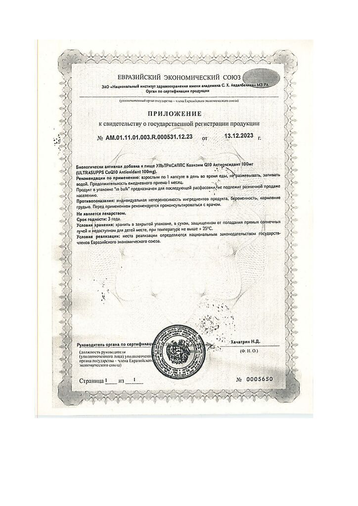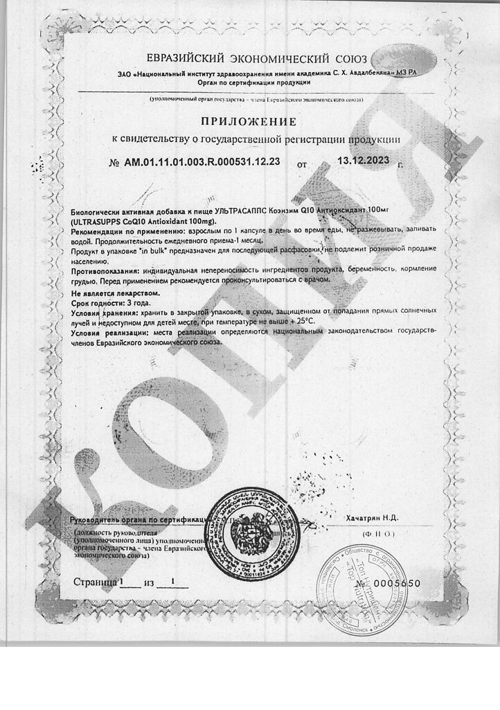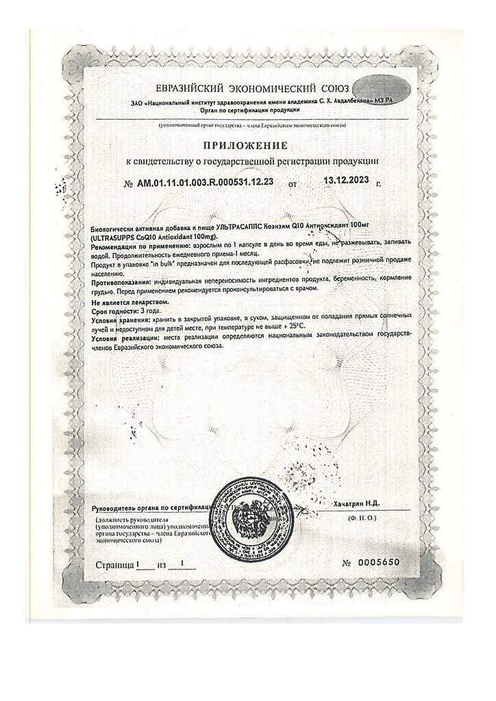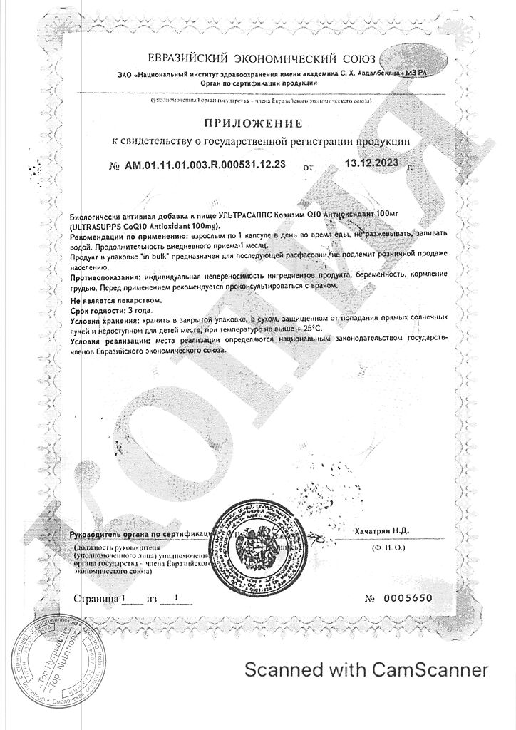 Документы Ультрасаппс Коэнзим Q10 Антиоксидант 100 мг / Ultrasupps Coenzyme Q10 Antioxidant 100 mg мягкие капсулы массой 380 мг 60 шт