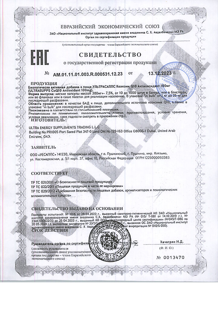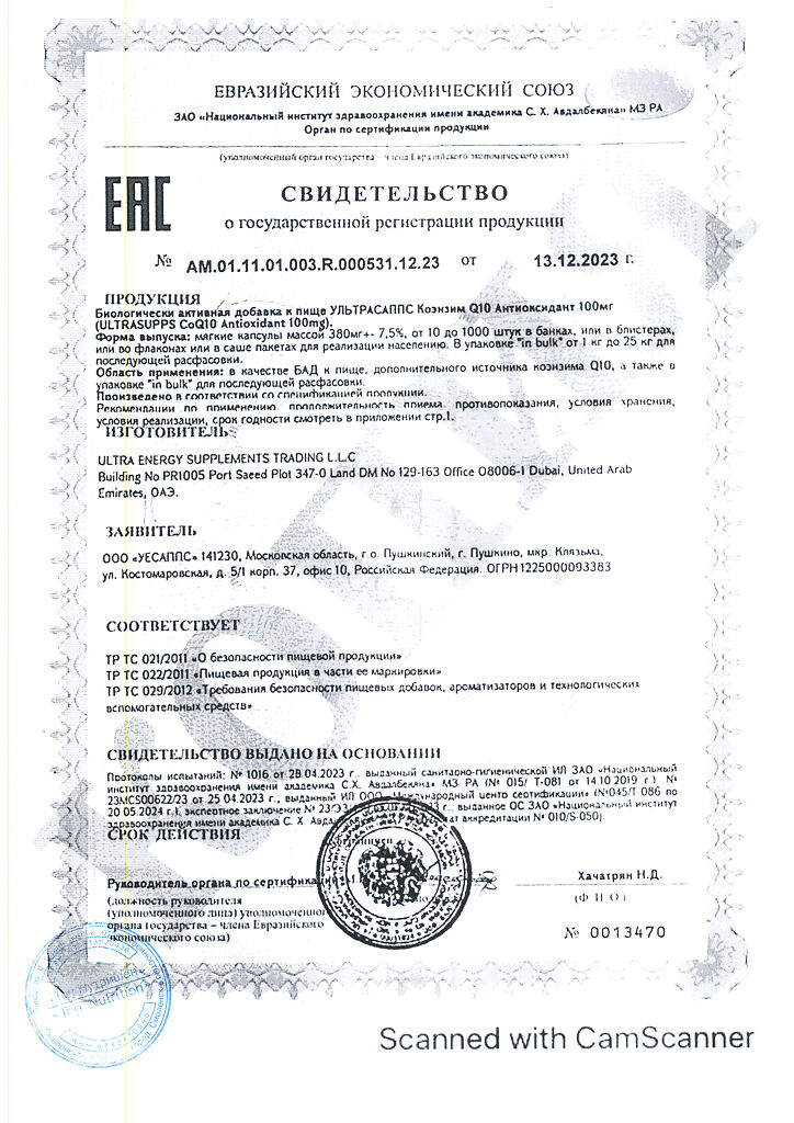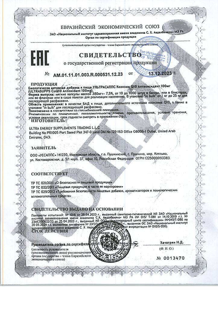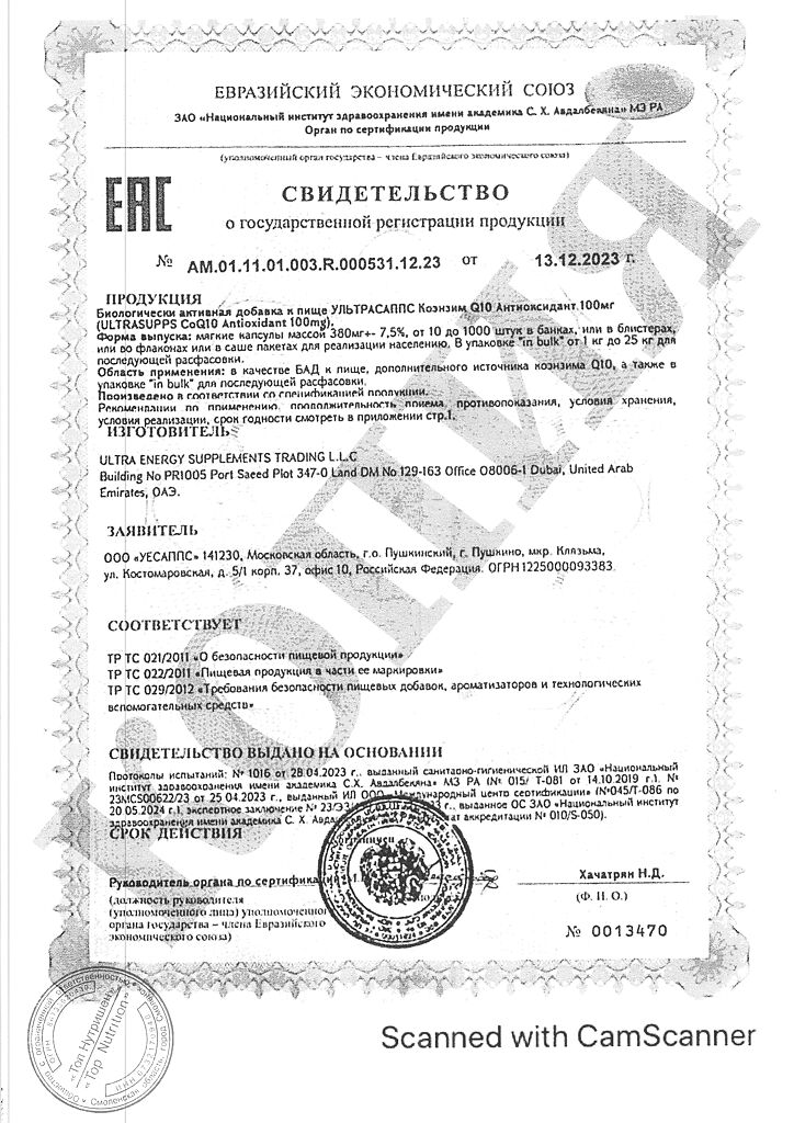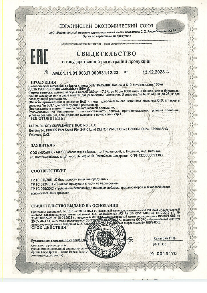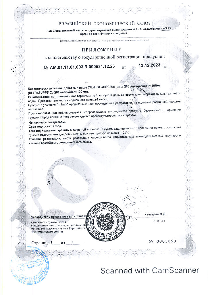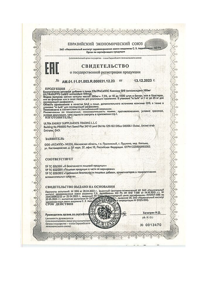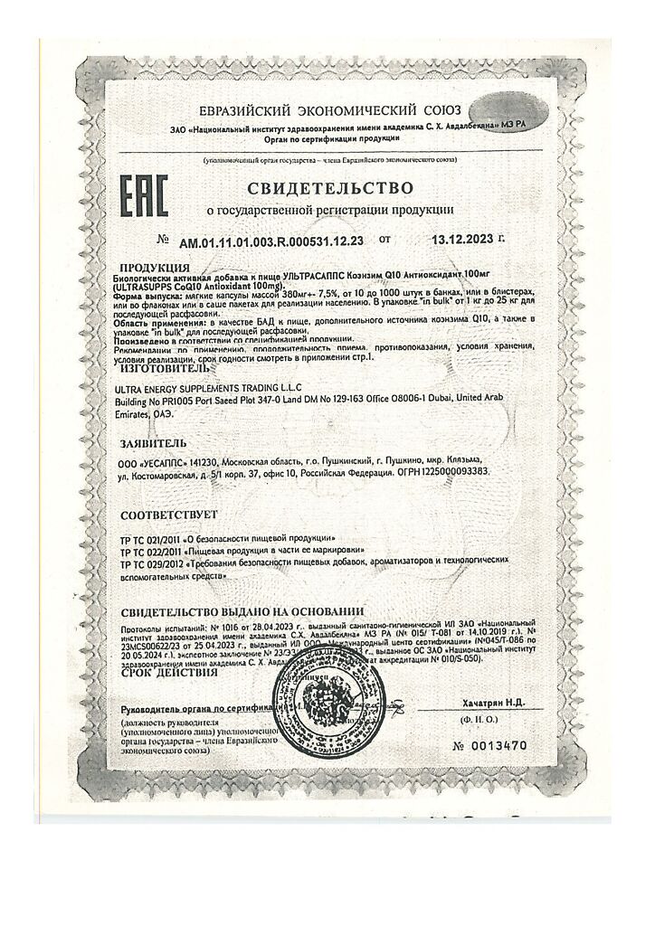 Документы Ультрасаппс Коэнзим Q10 Антиоксидант 100 мг / Ultrasupps Coenzyme Q10 Antioxidant 100 mg мягкие капсулы массой 380 мг 60 шт