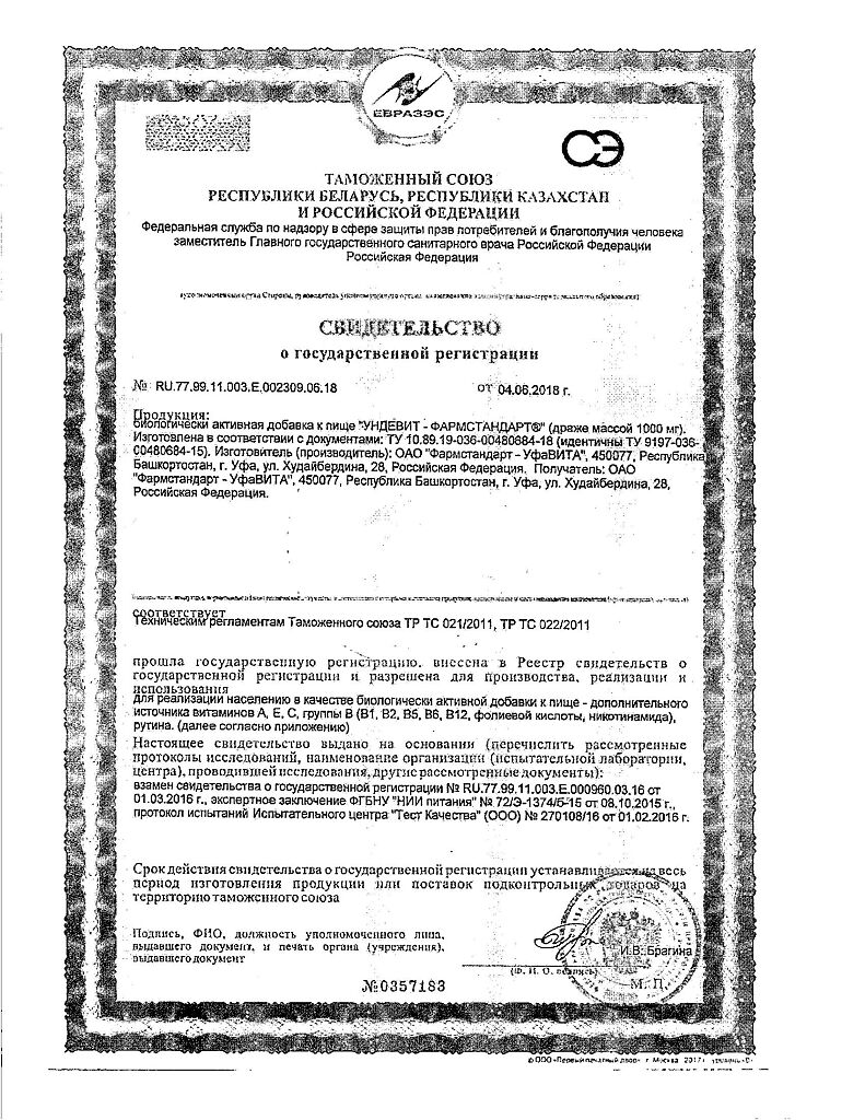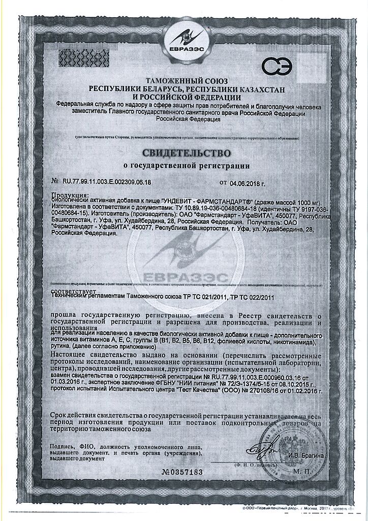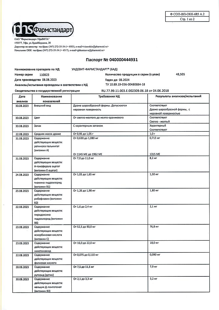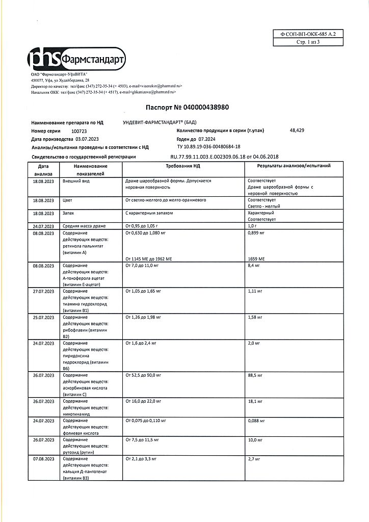 Ундевит-Фармстандарт драже массой 1000 мг БАД 50 шт