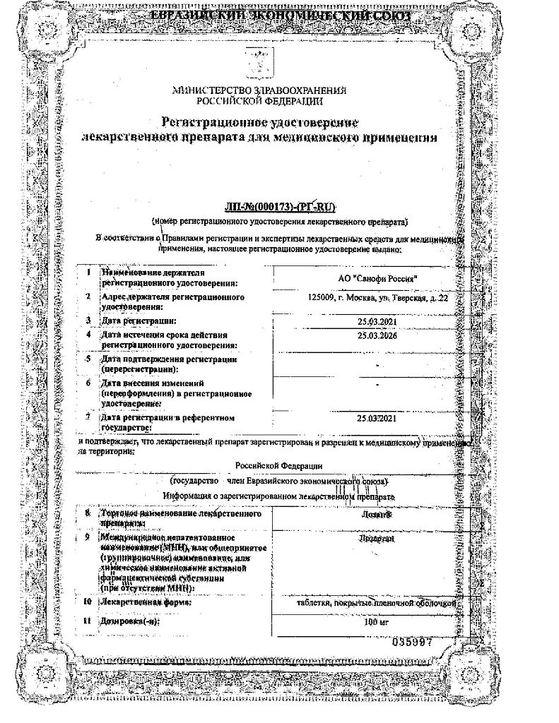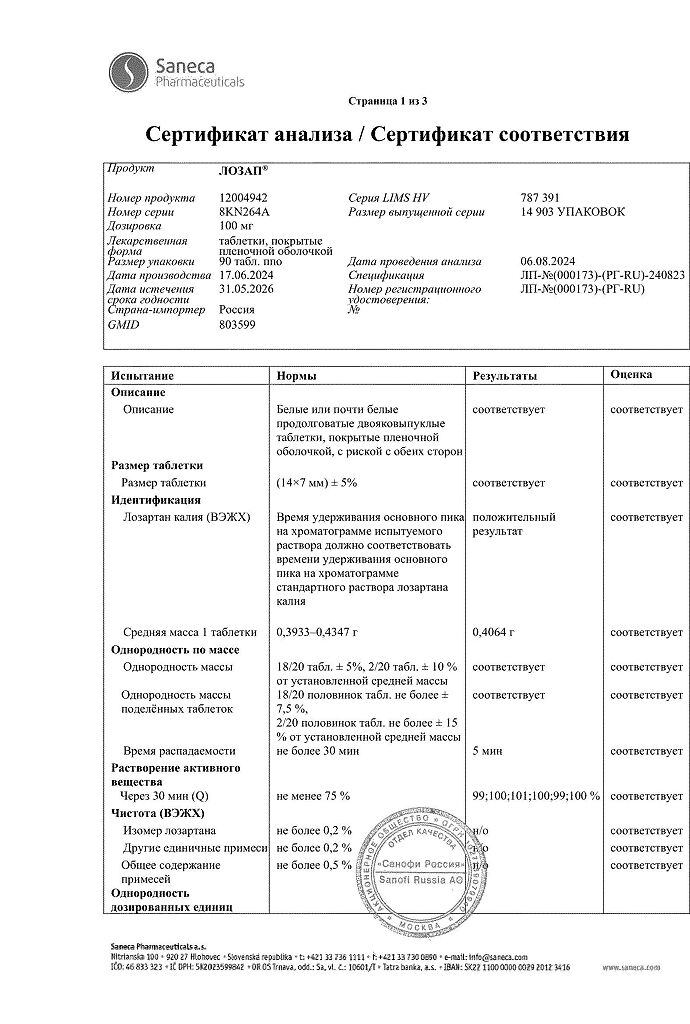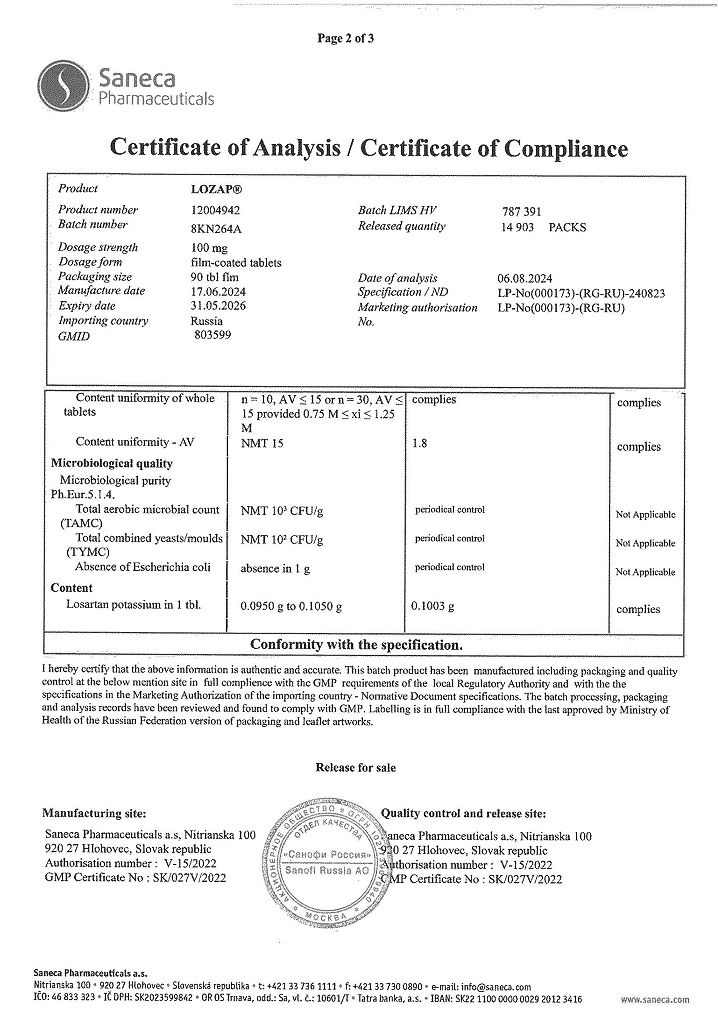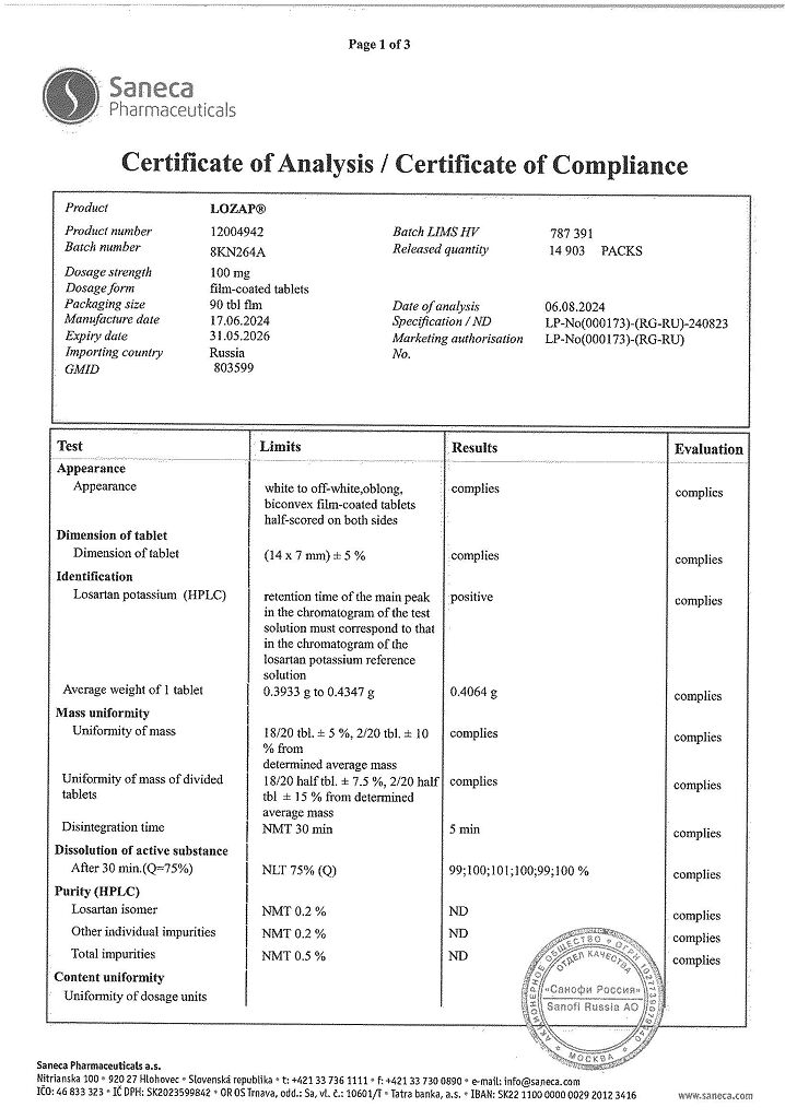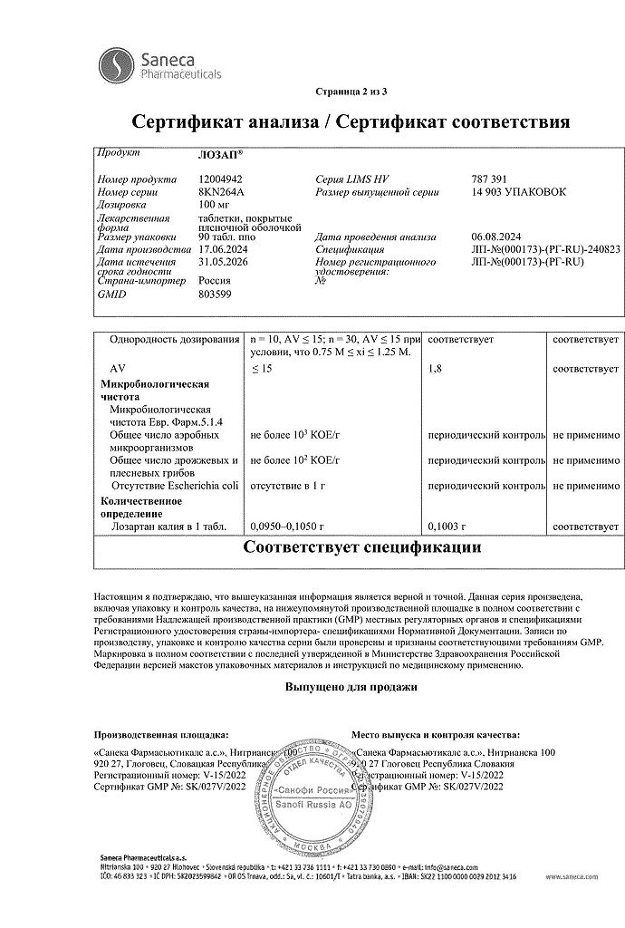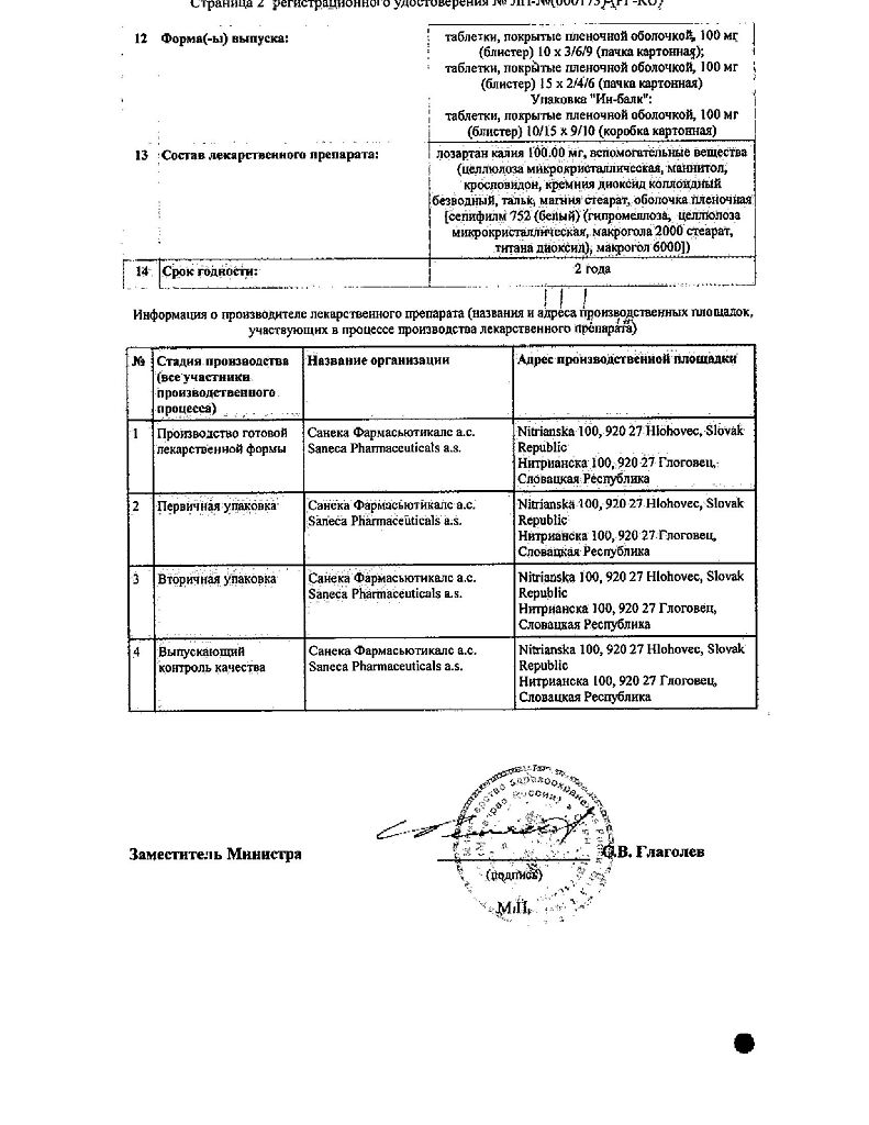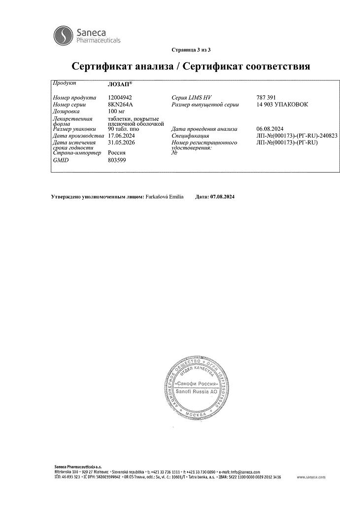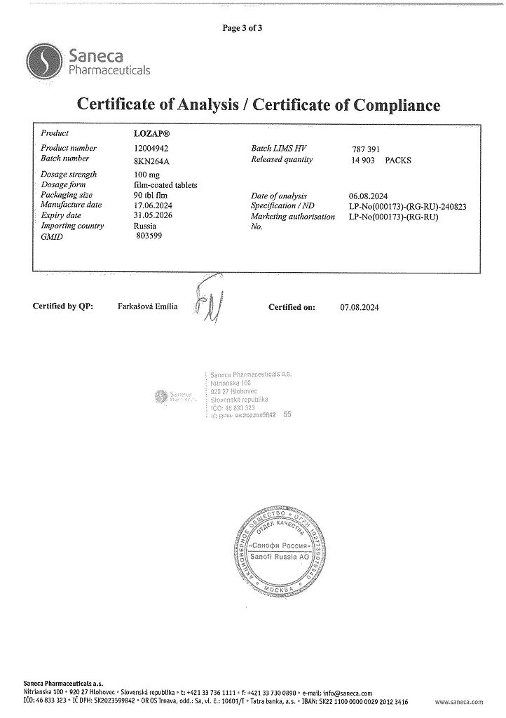 Документы Лозап таблетки покрыт.плен.об. 100 мг 90 шт