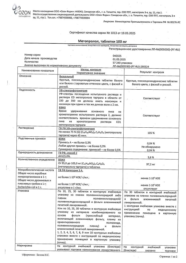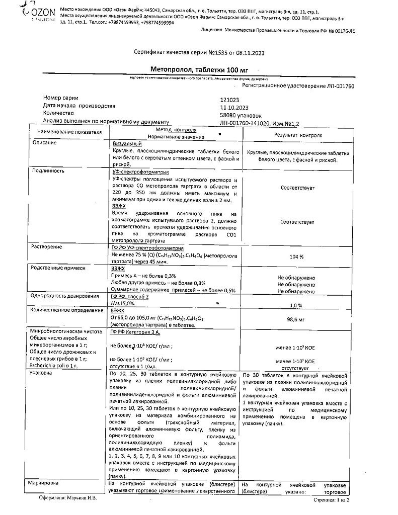 Действующее вещество:метопролола тартрат - 100,0 мг.
