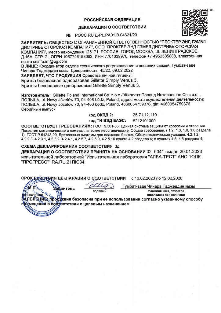 Документы Gillette Venus 3 Simply станки женские одноразовые 4 шт