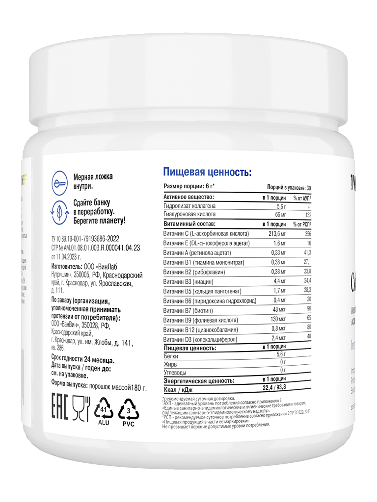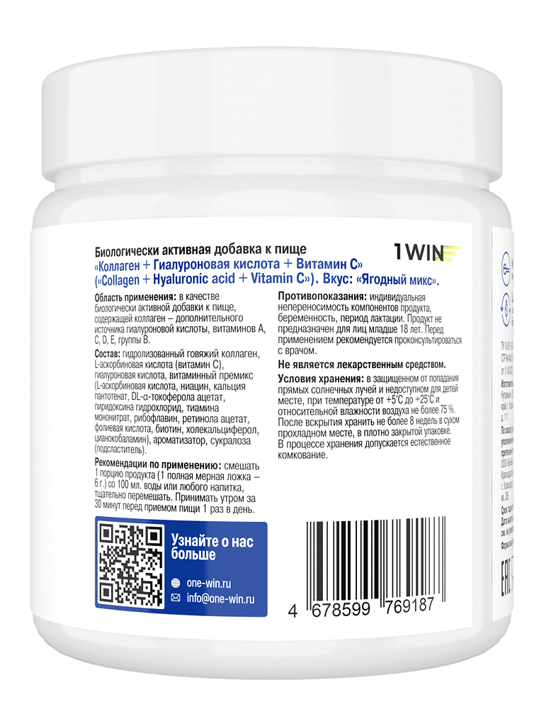 • 📒 Подробная инструкция по применению 1WIN Коллаген + гиалуроновая кислота + витамин С / Collagen + hyaluronic acid + vitamin C Ягодный микс порошок банка 180 г 30 порций