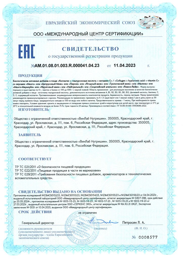 Документы 1WIN Коллаген + гиалуроновая кислота + витамин С / Collagen + hyaluronic acid + vitamin C Ягодный микс порошок банка 180 г 30 порций