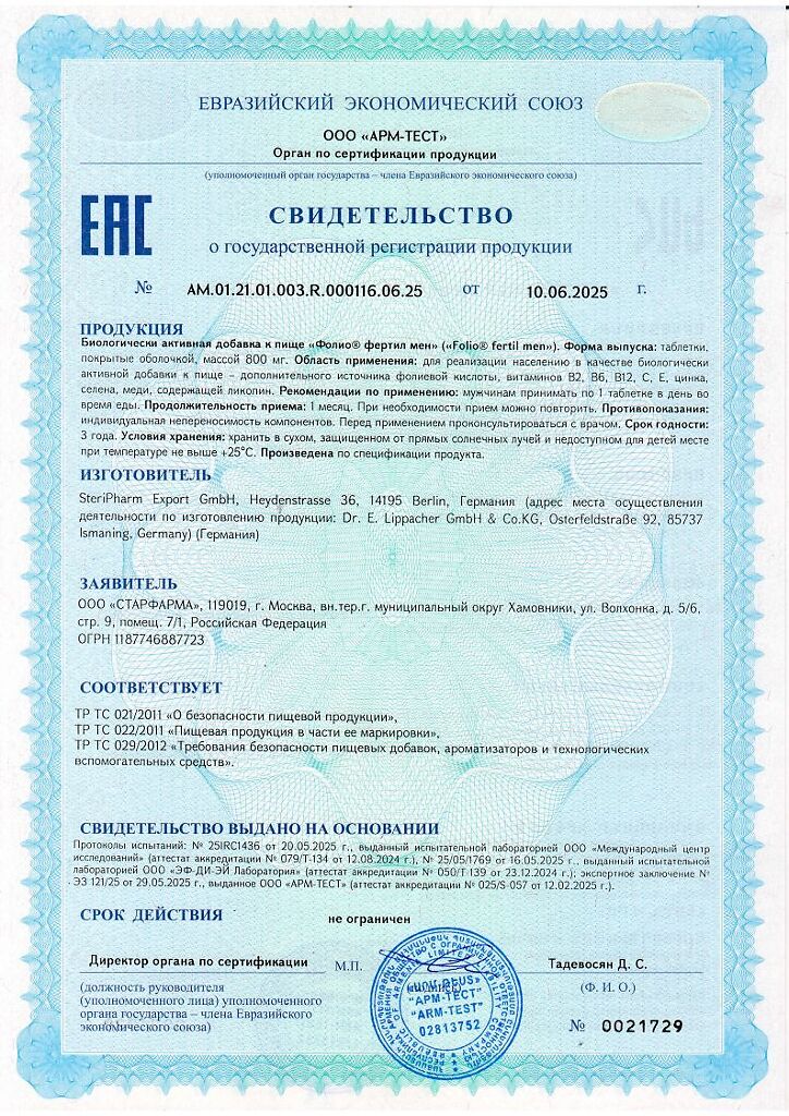 Документы Фолио фертил мен/Folio fertil men таблетки покрыт.об. массой 800 мг 30 шт