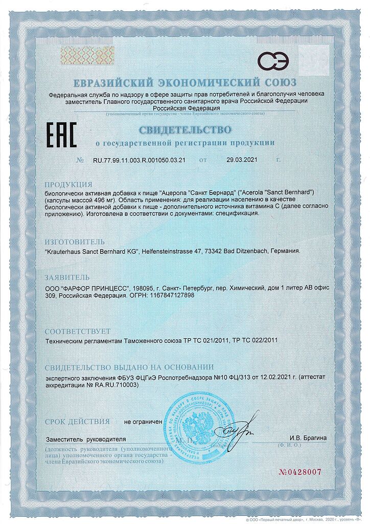 Документы Санкт Бернард Ацерола/Acerola Sanct Bernhardt капсулы массой 496 мг 300 шт