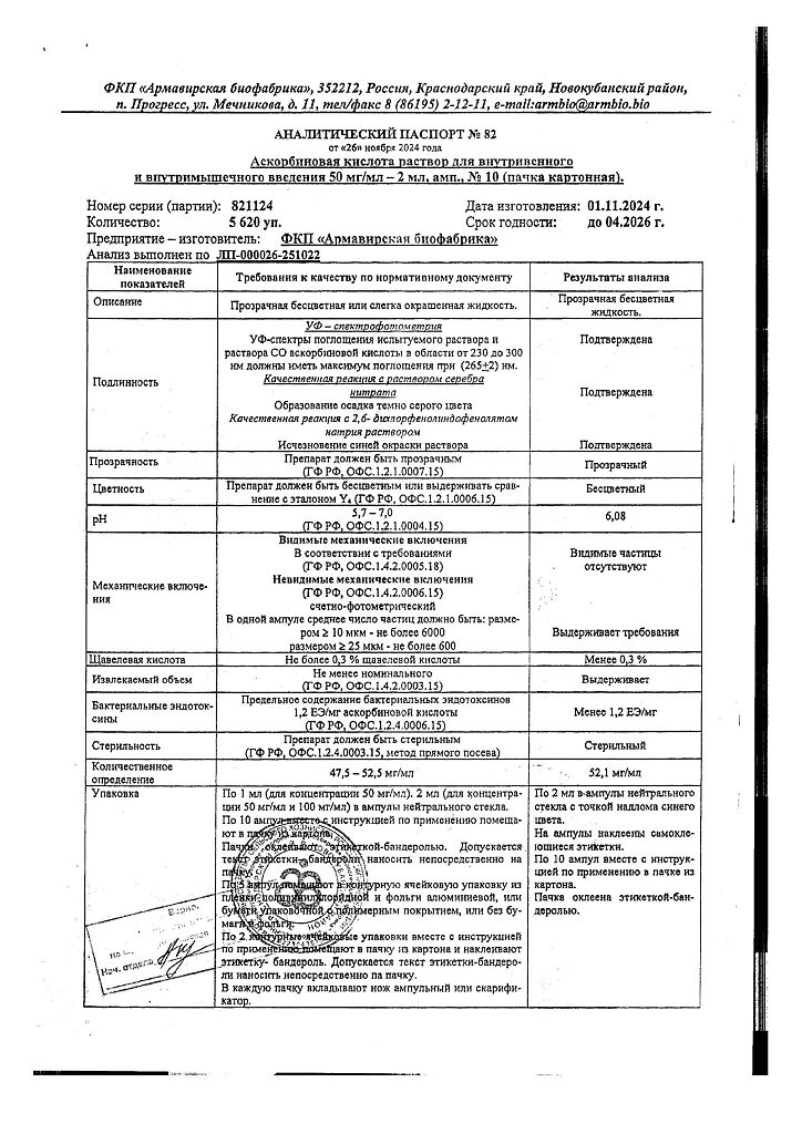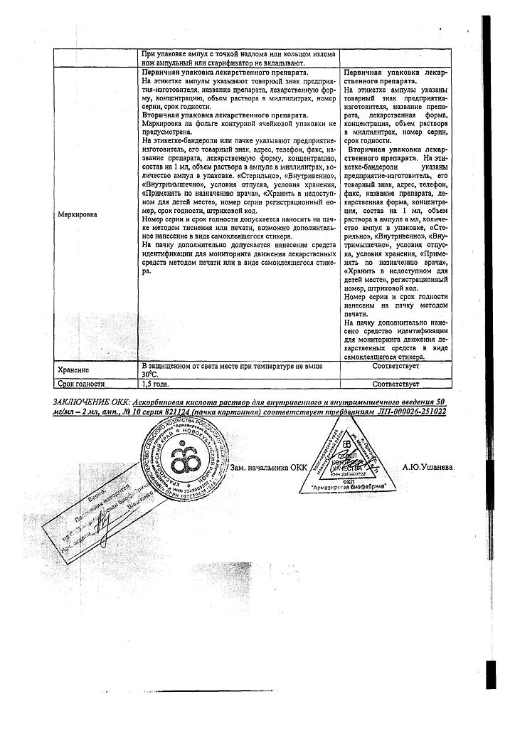 Документы Аскорбиновая кислота раствор для в/в и в/м введ. 50 мг/мл 2 мл ампулы 10 шт