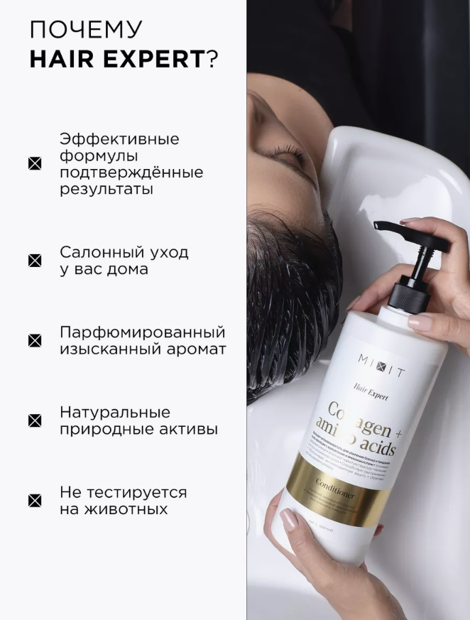 • 📒 Подробная инструкция по применению Mixit Hair Expert Бальзам-ополаскиватель с коллагеном и аминокислотами Conditioner Collagen & Amino Acids 1000 мл
