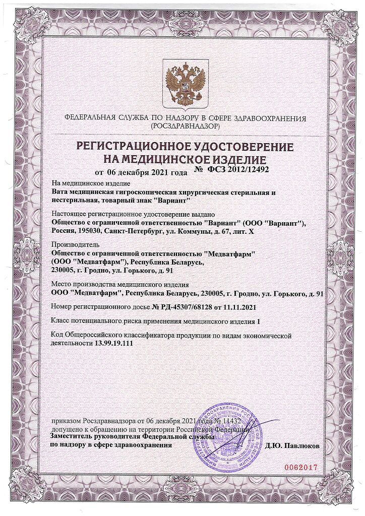 Документы Вата медицинская гигроскопическая хирургическая Вариант стерильная 100 г 1 шт