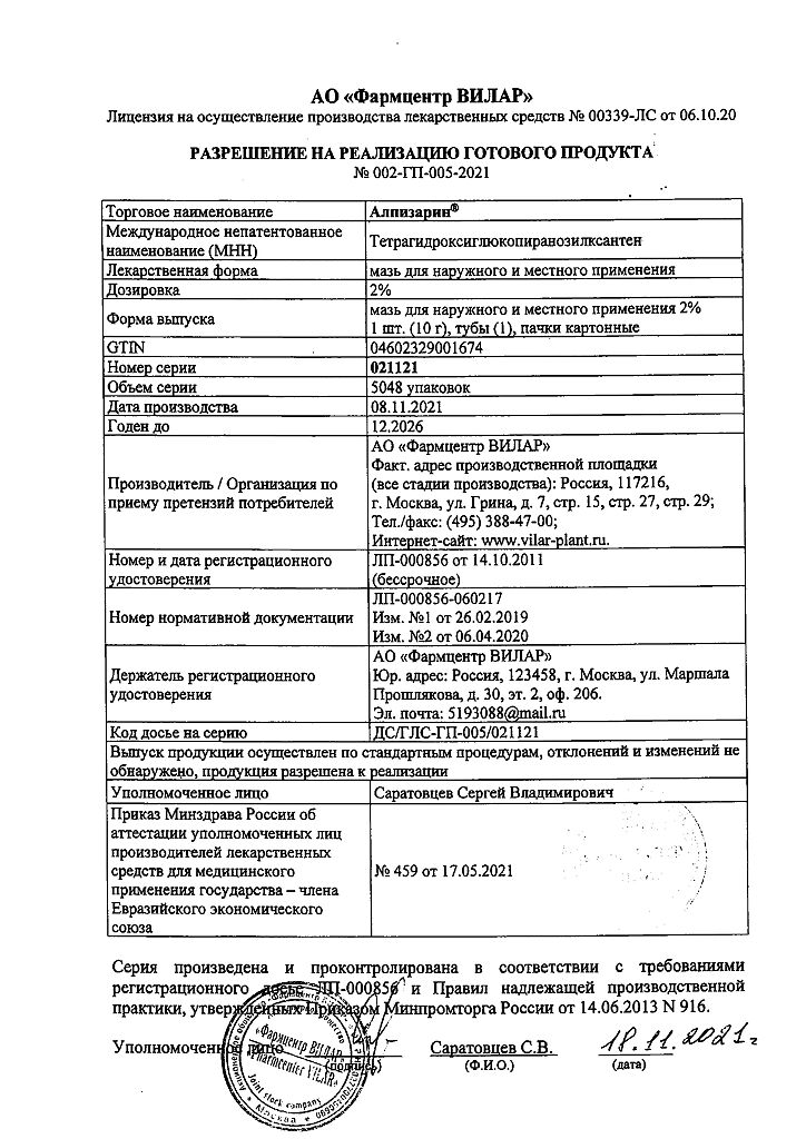 Алпизарин мазь для наружного и местного применения 5 % 10 г 1 шт