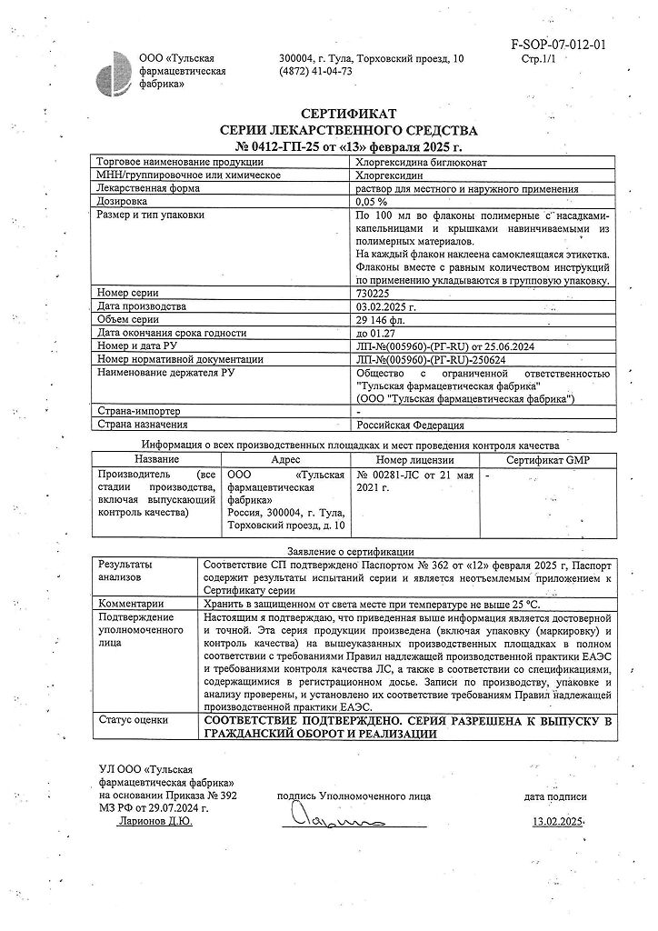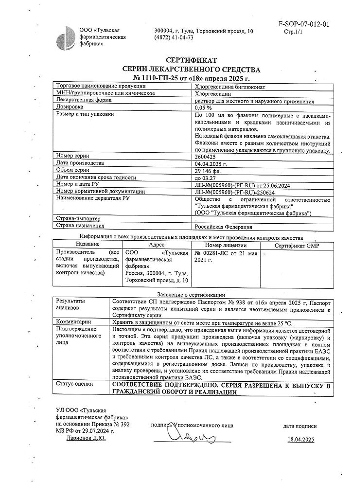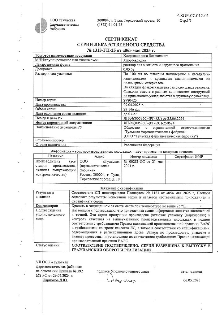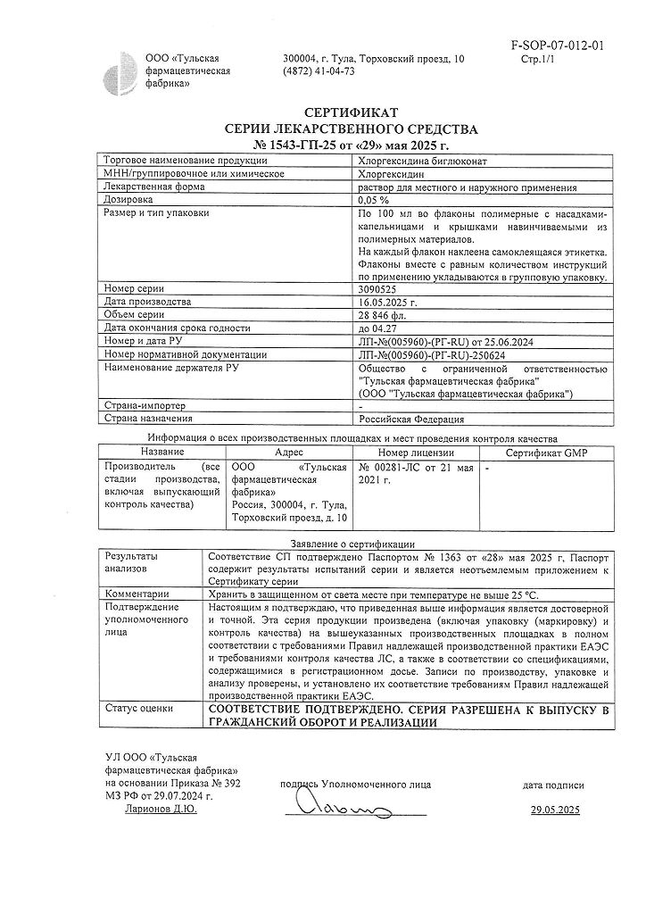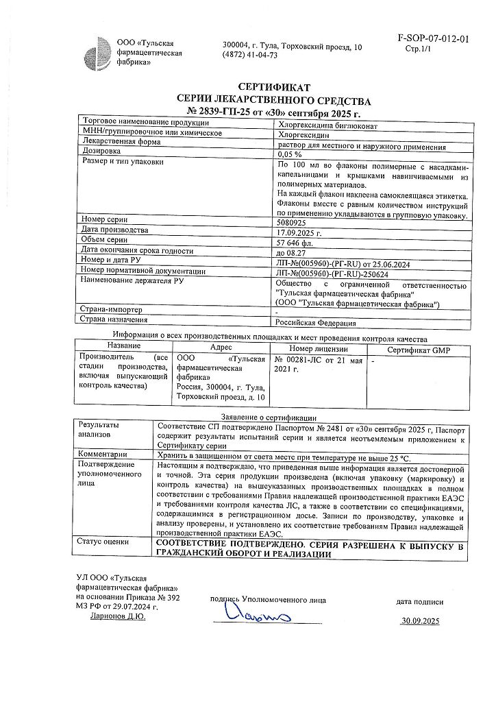 Хлоргексидина биглюконат раствор для местного и наружного применения 0,05 % 100 мл 1 шт: 78 отзывов покупателей и фармацевтов