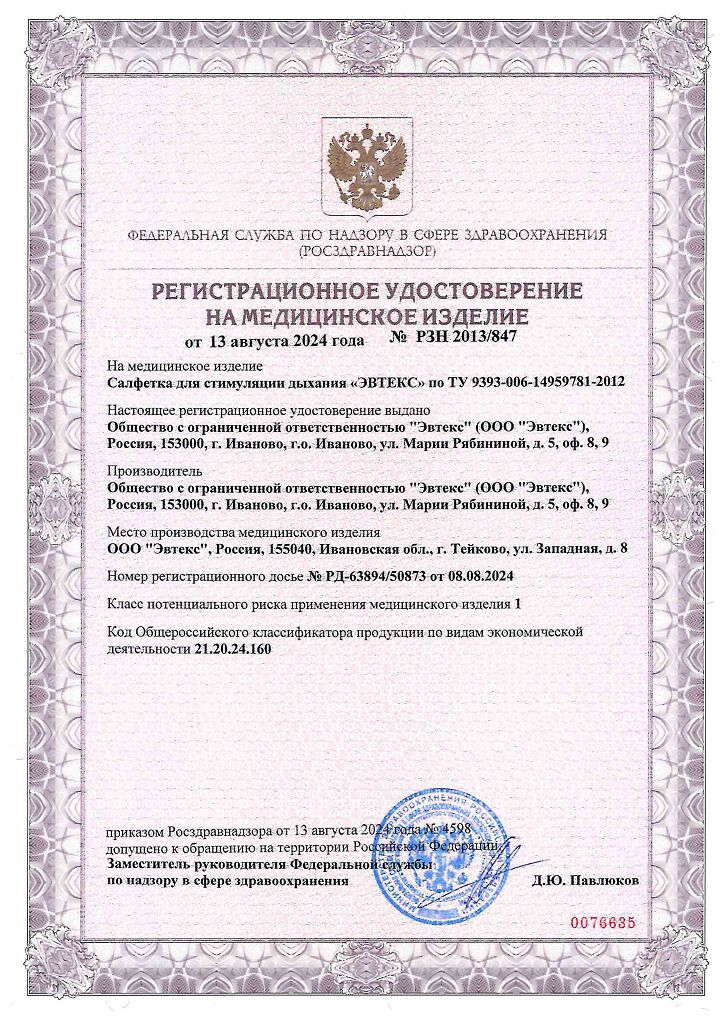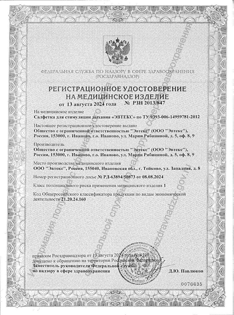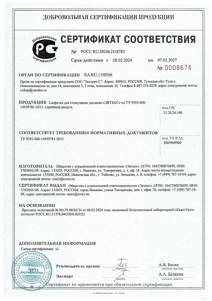 Документы Салфетка для стимуляции дыхания Эвтекс 3 см х 6 см 1 шт