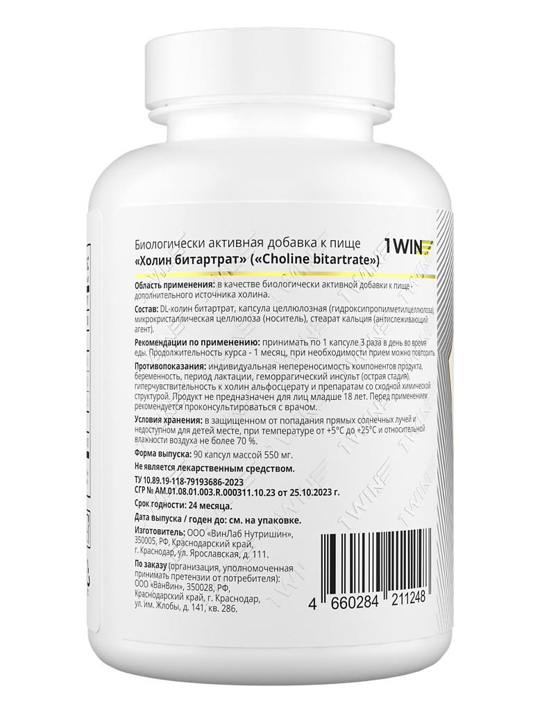 1WIN Холин битартрат / Choline bitartrate капсулы массой 550 мг 90 шт