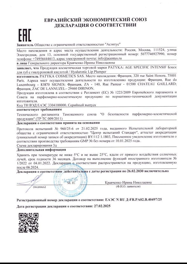 Документы Патика/Patyka Age-Specific Intensif Блеск для губ с гиалуроновой кислотой 7 мл 1 шт