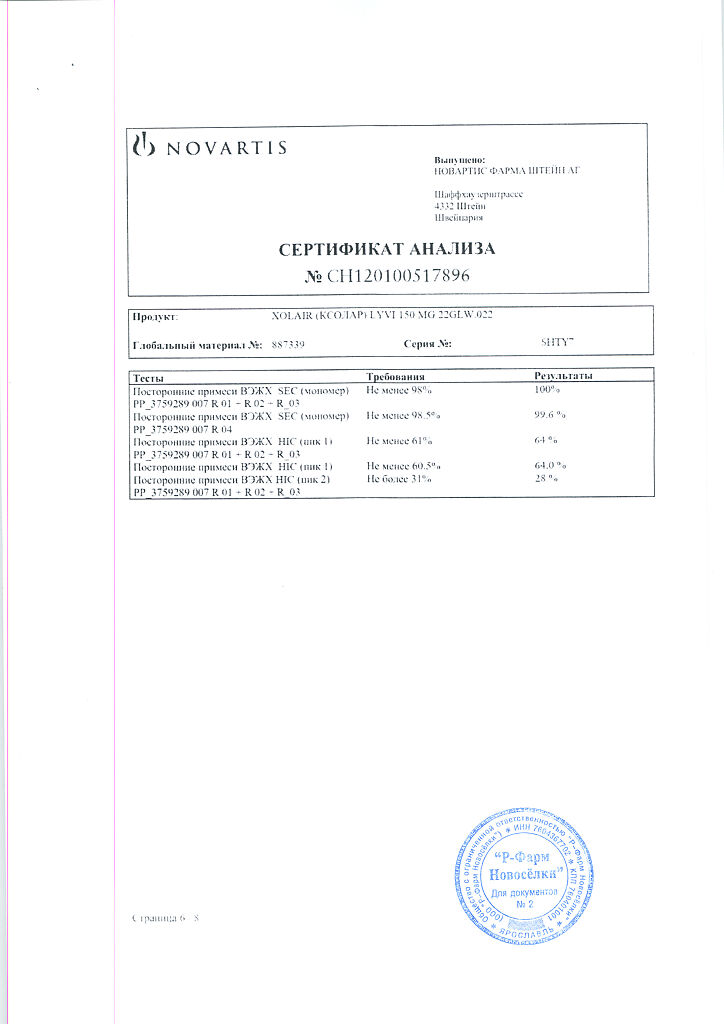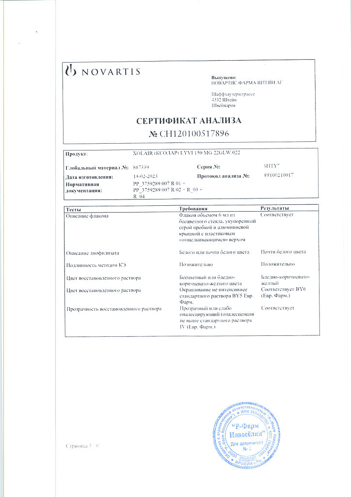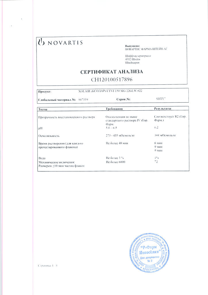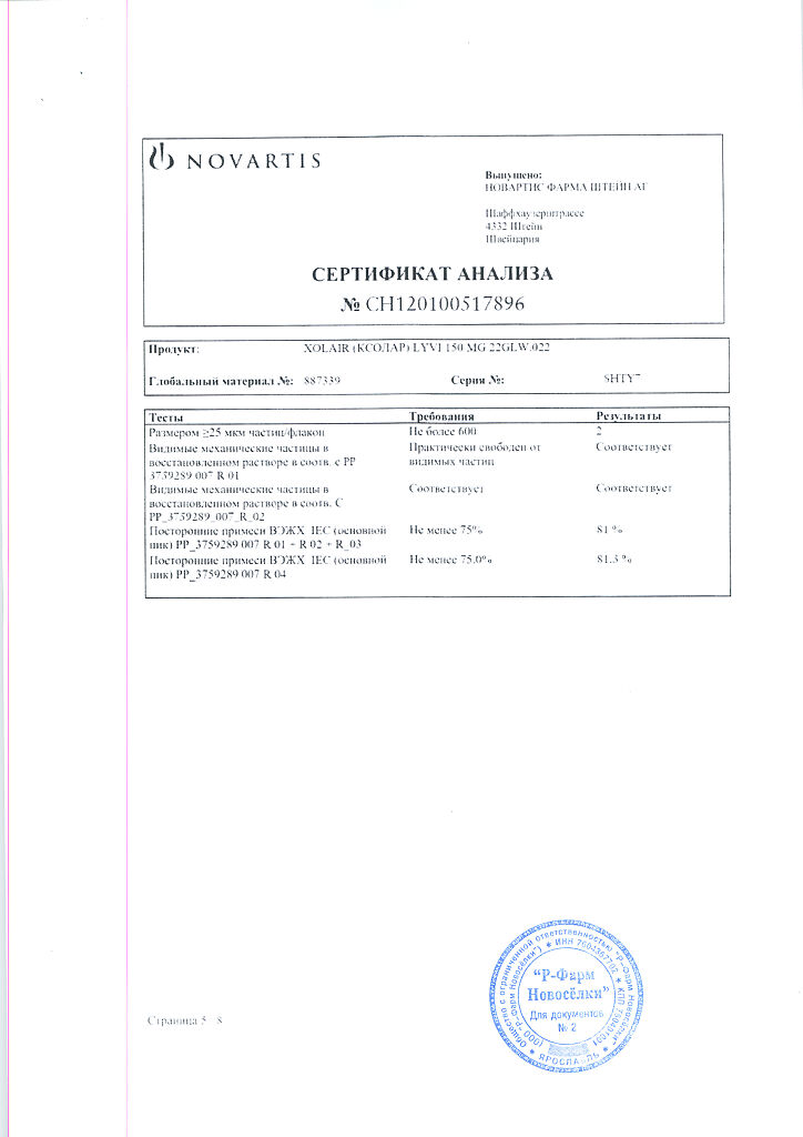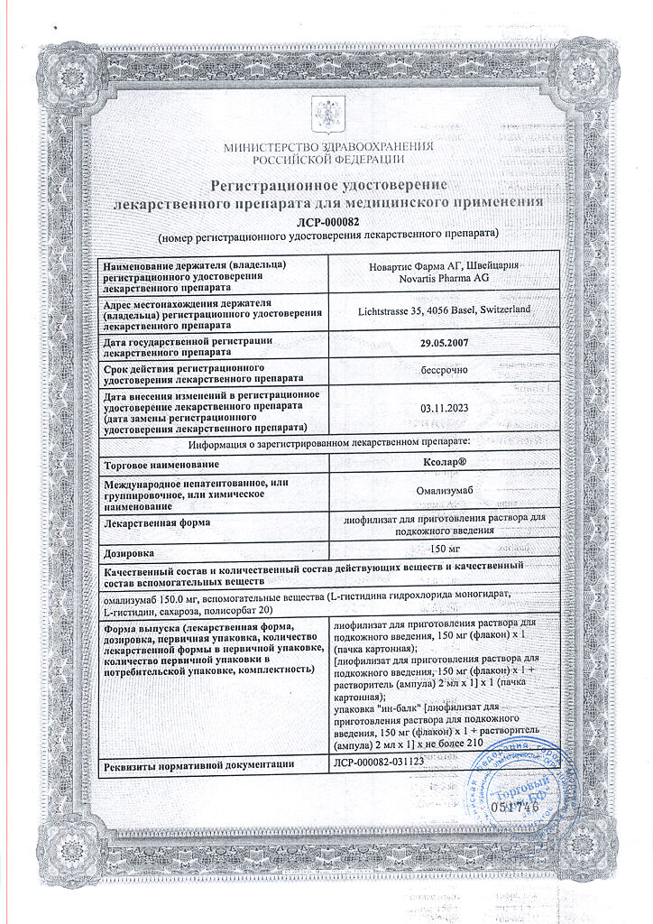 Документы Ксолар лиофилизат д/приг раствора для п/к введ 150 мг фл 1 шт