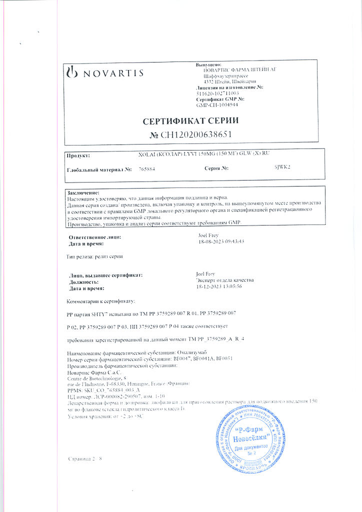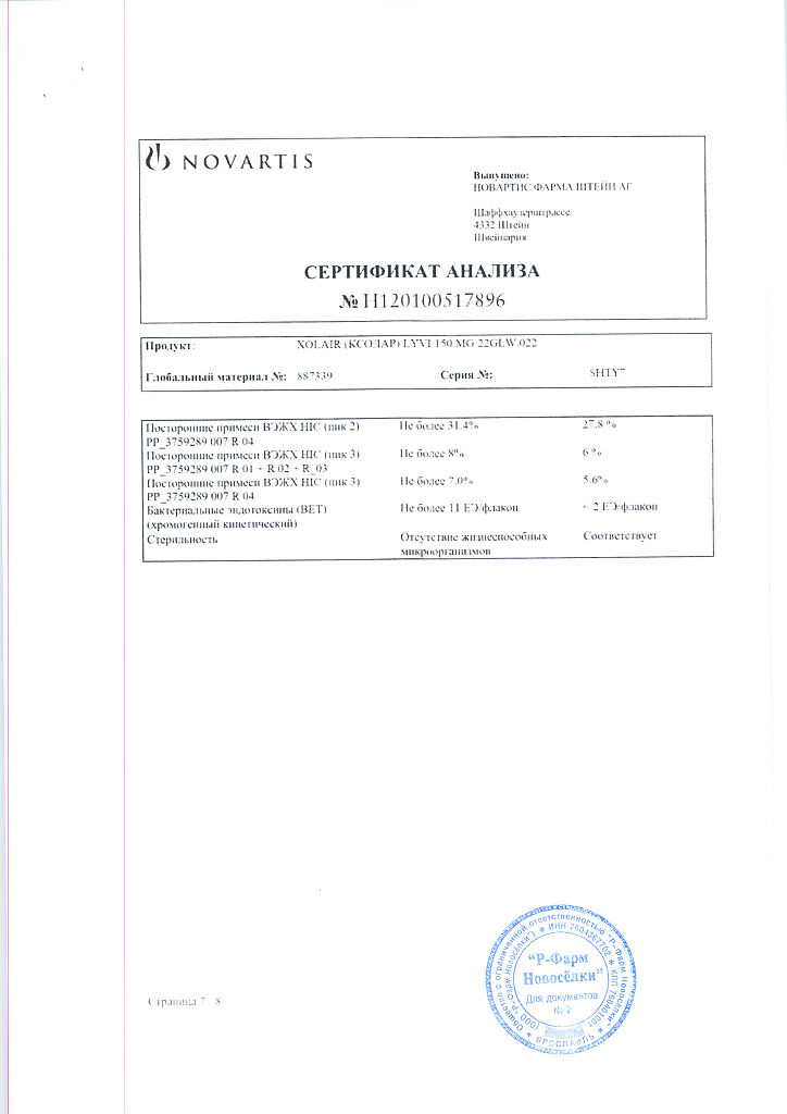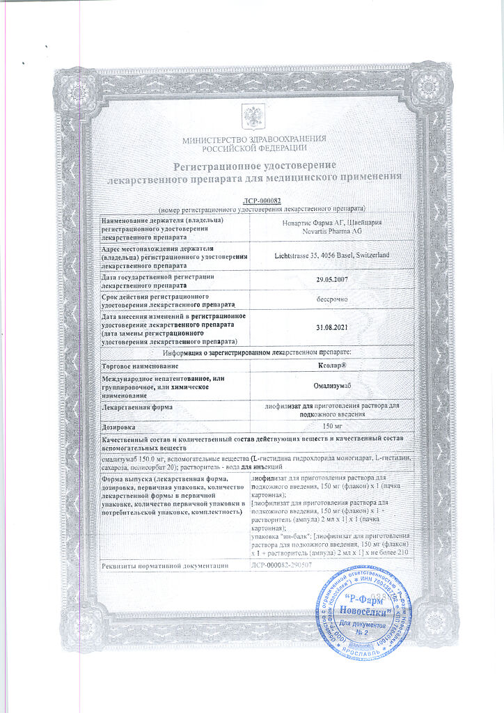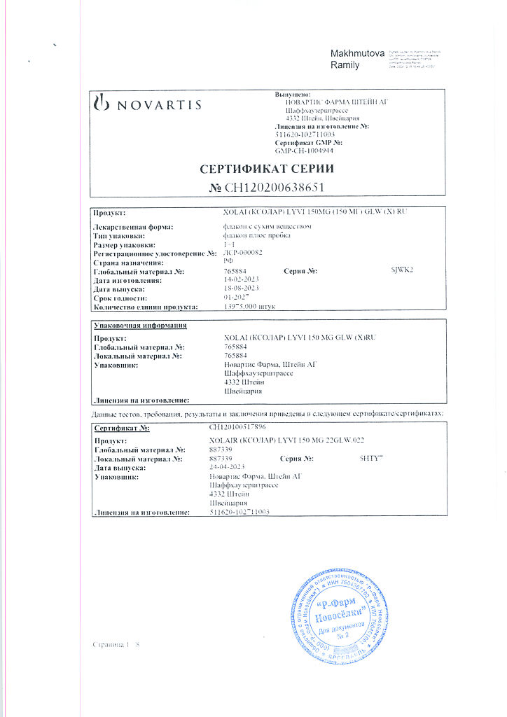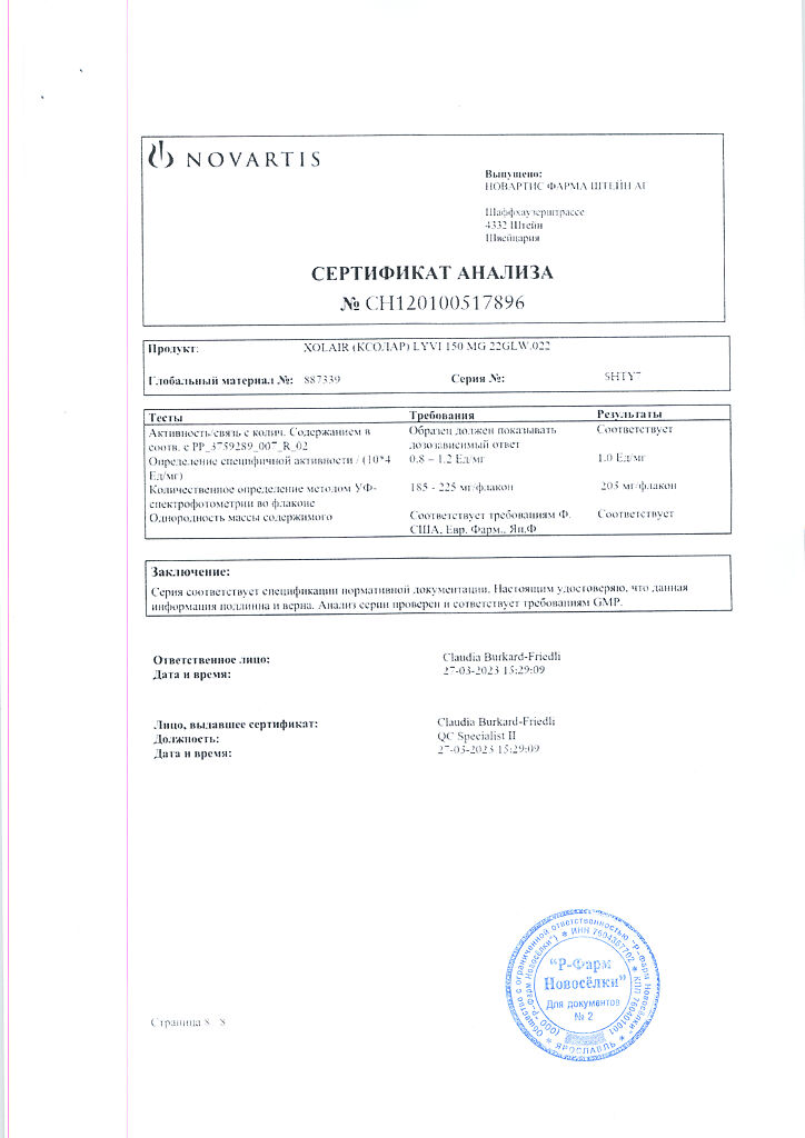 Документы Ксолар лиофилизат д/приг раствора для п/к введ 150 мг фл 1 шт