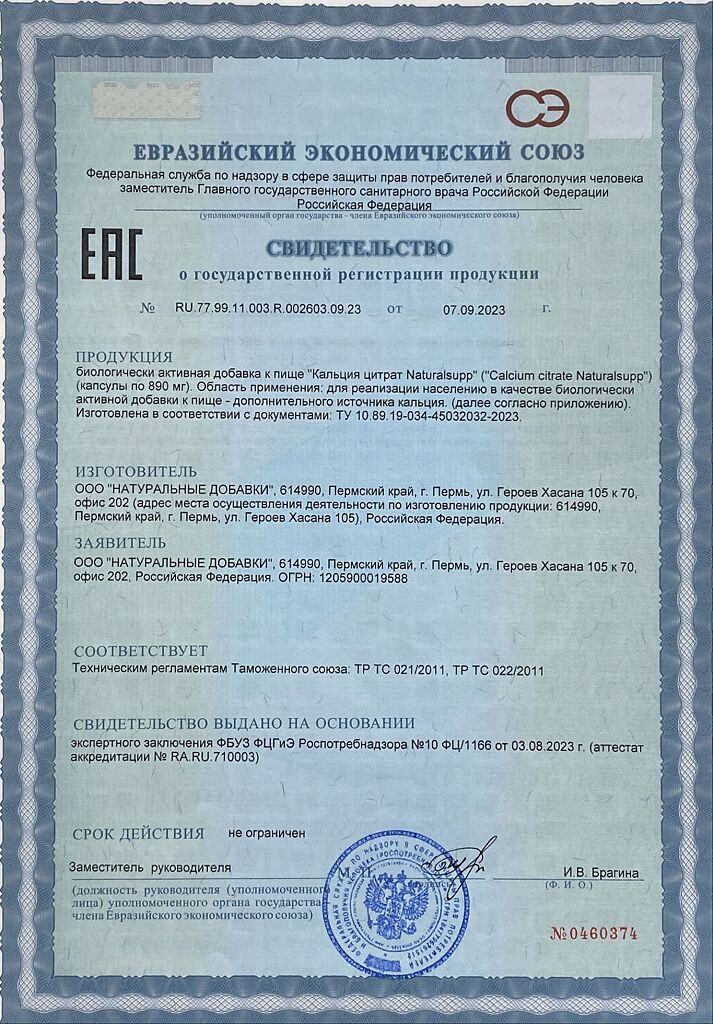 Документы NaturalSupp Кальций цитрат/Calcium citrate Naturalsupp капсулы по 890 мг 60 шт