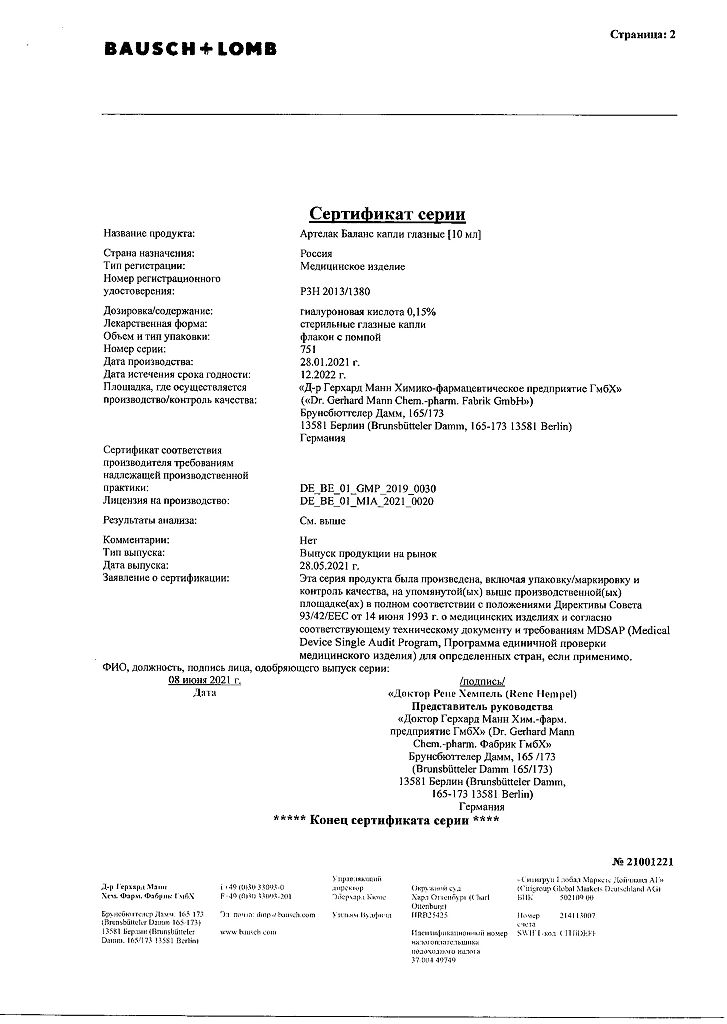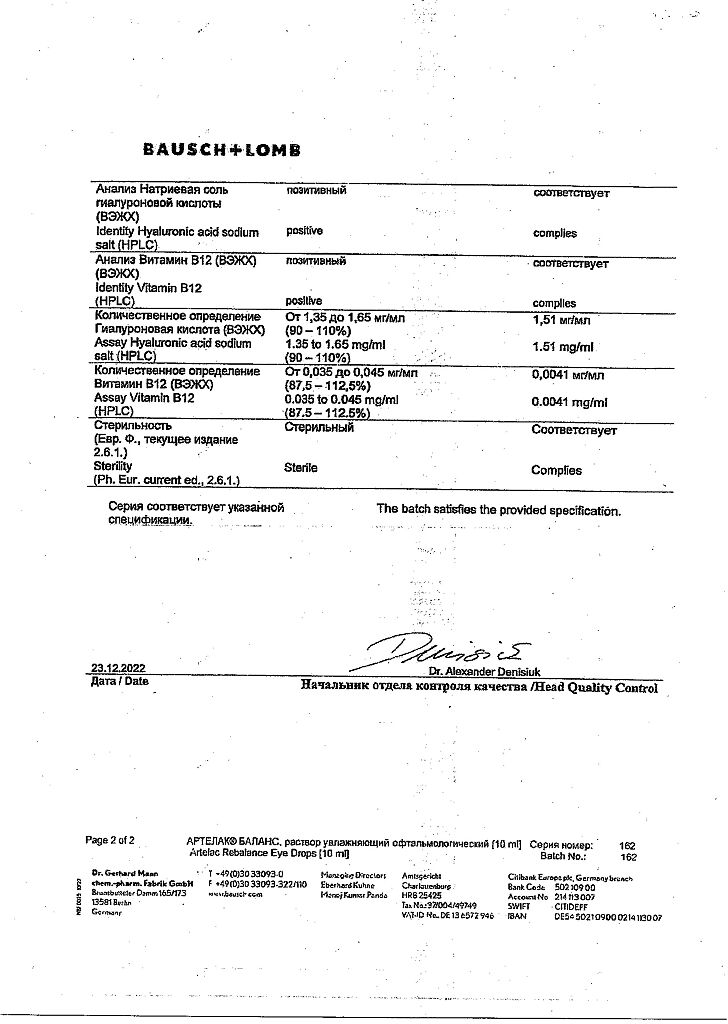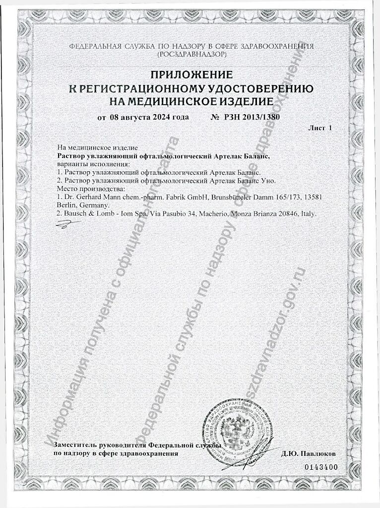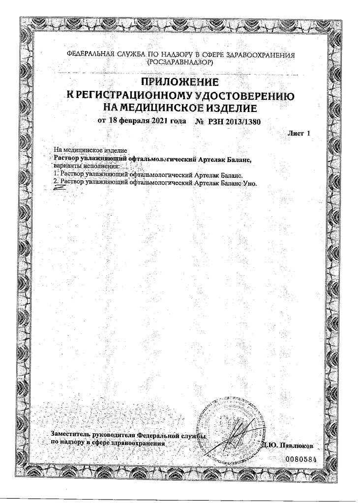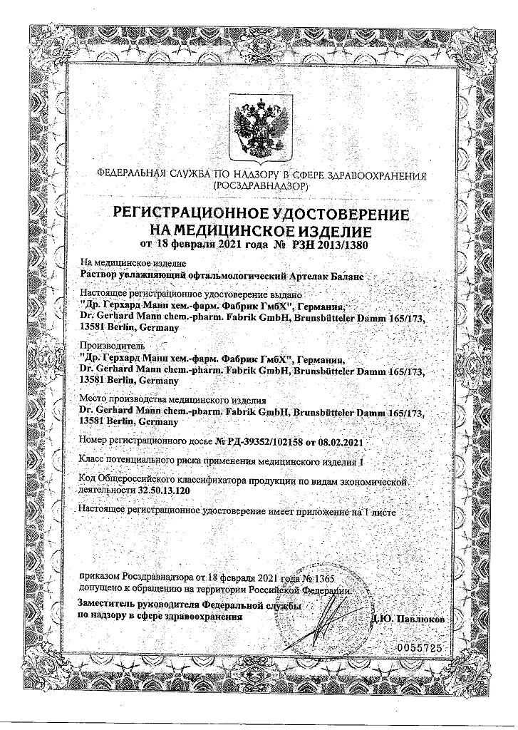 Документы Артелак Баланс раствор офтальмологический увлажняющий 10 мл 1 шт