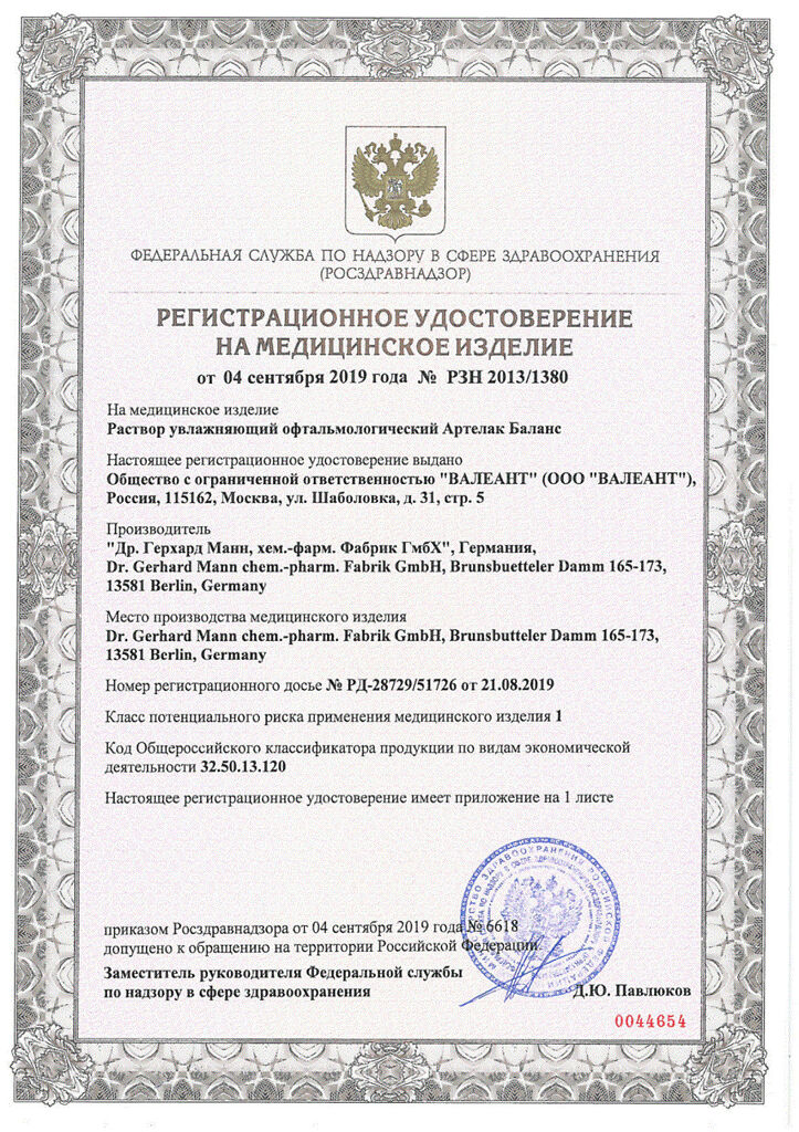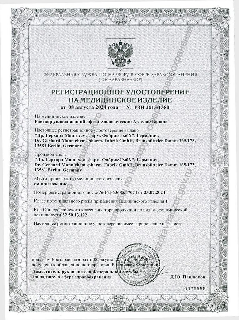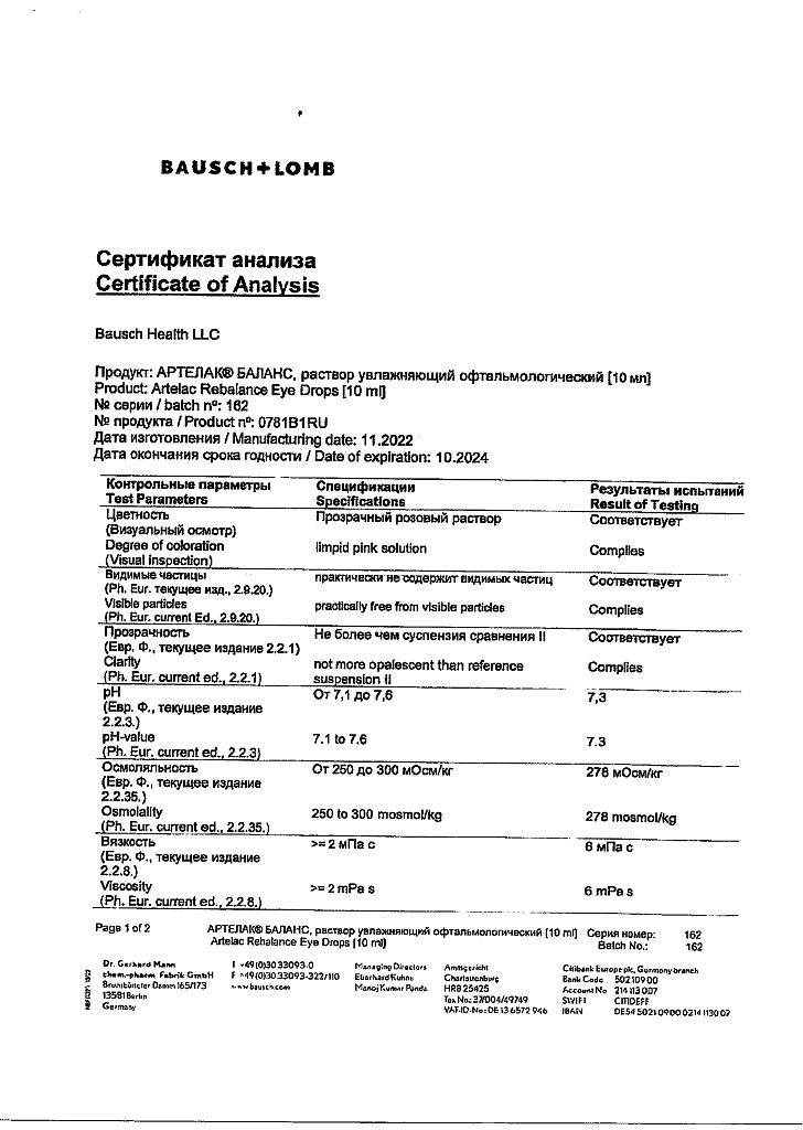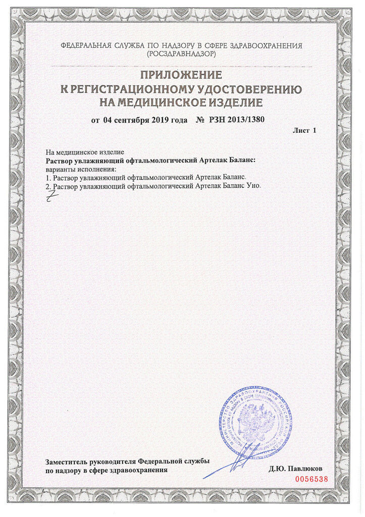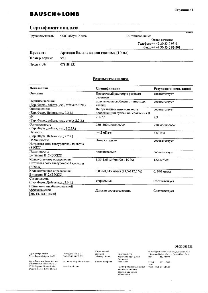 Документы Артелак Баланс раствор офтальмологический увлажняющий 10 мл 1 шт