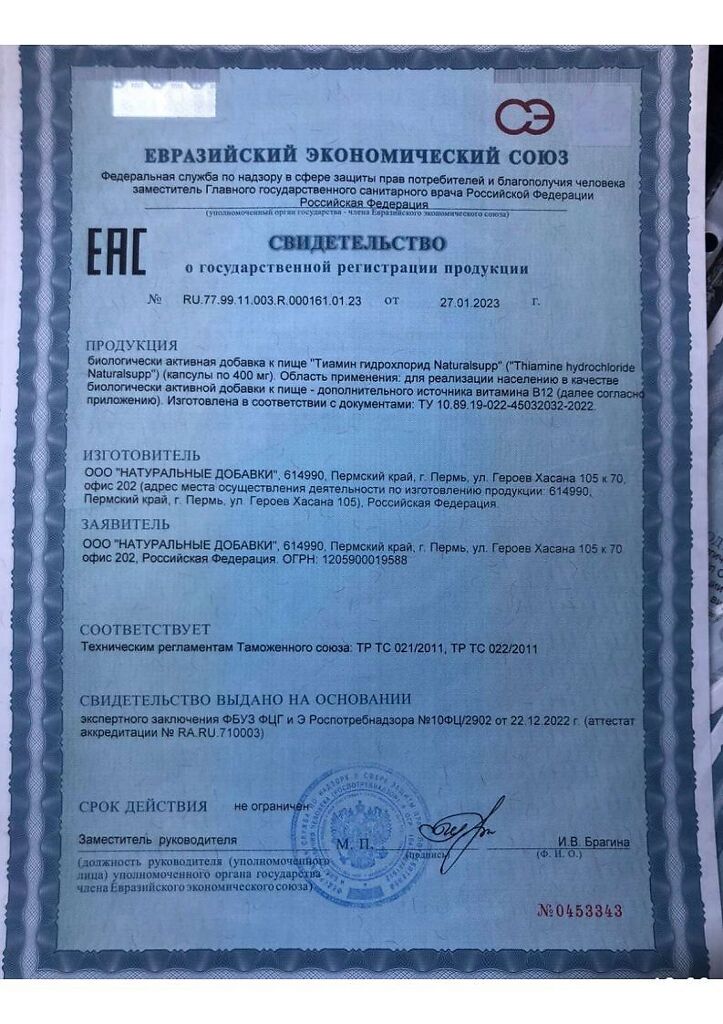 Документы NaturalSupp Тиамин/Thiamine hydrochloride Naturalsupp капсулы по 400 мг 60 шт