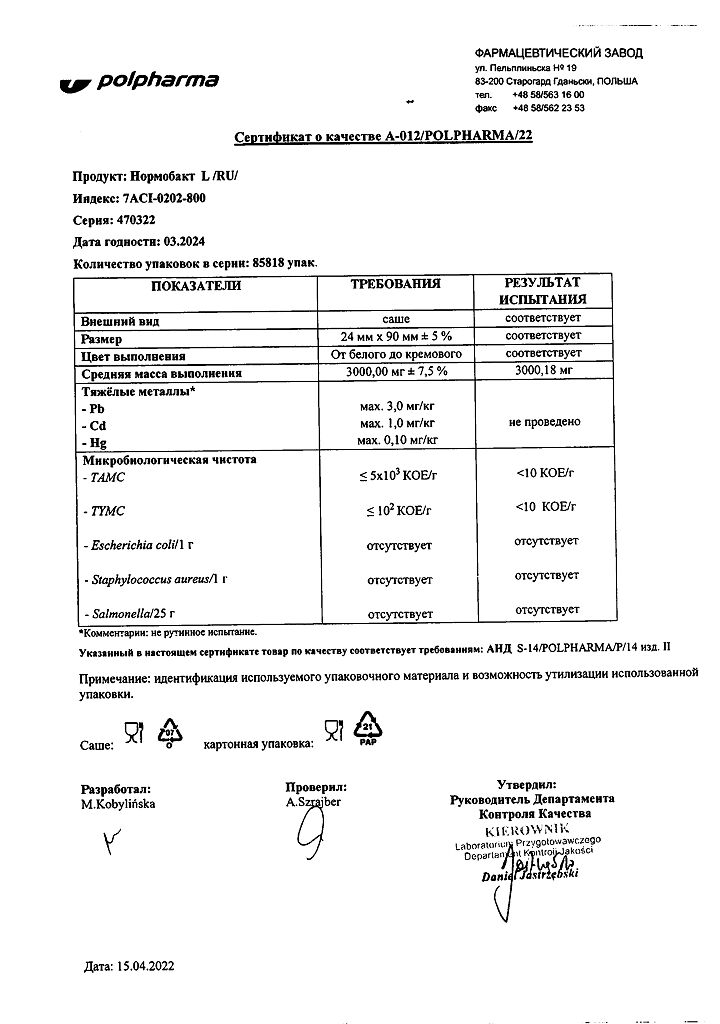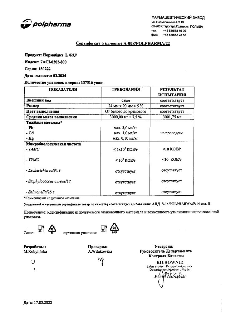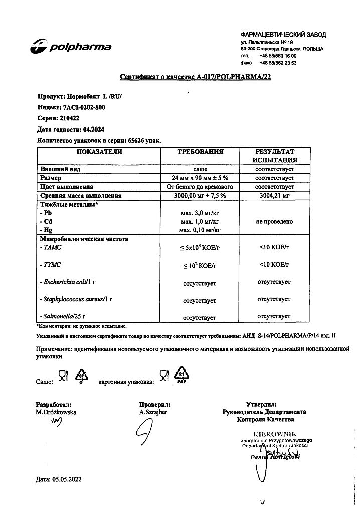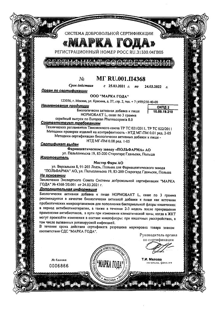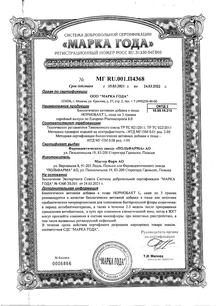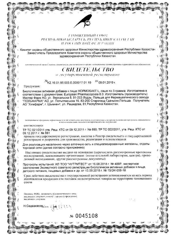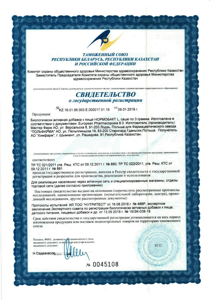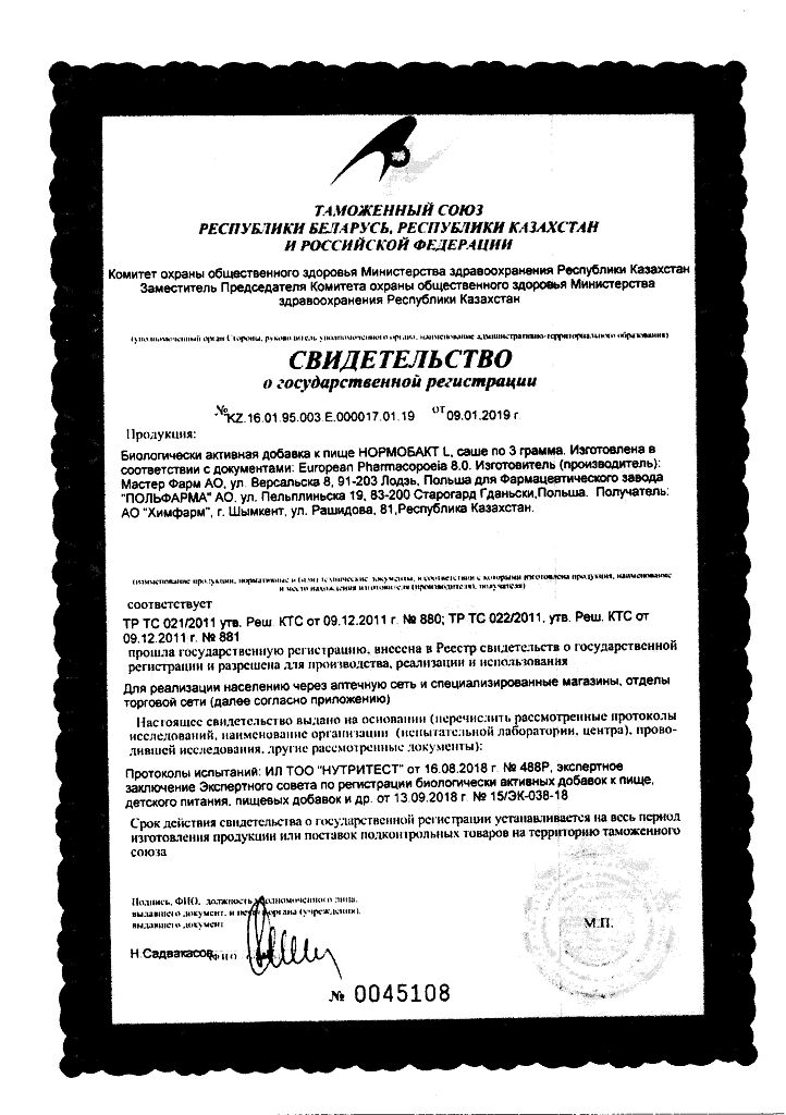 • Срок годности Нормобакт L - 2 года