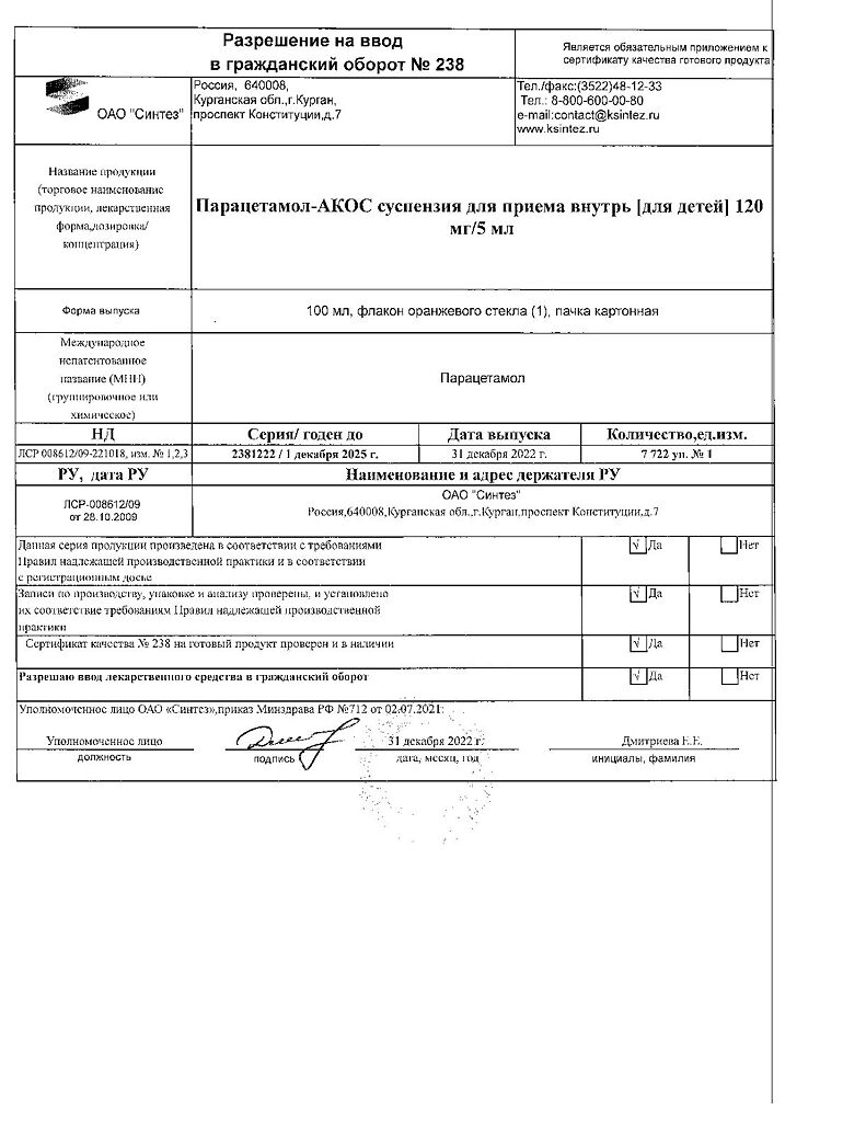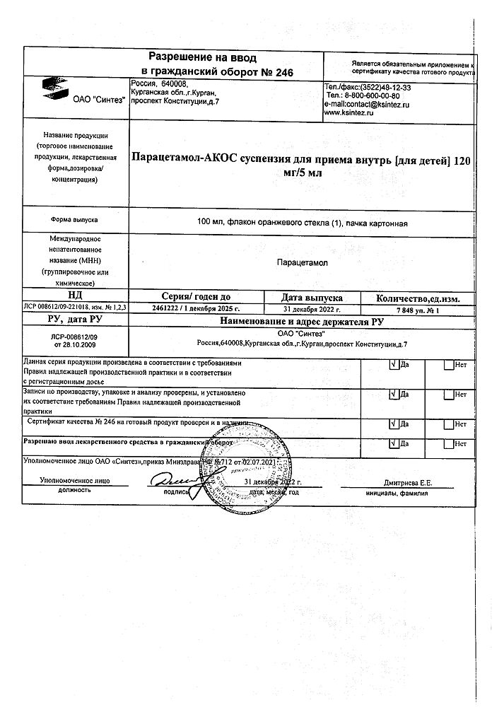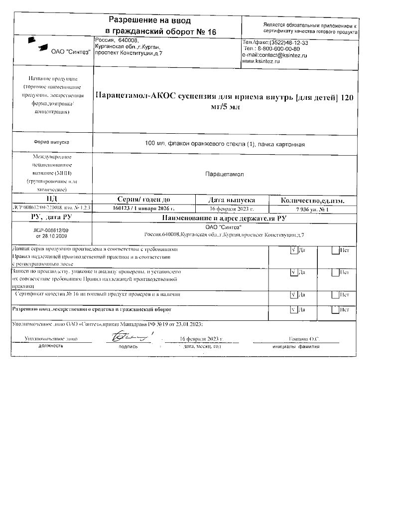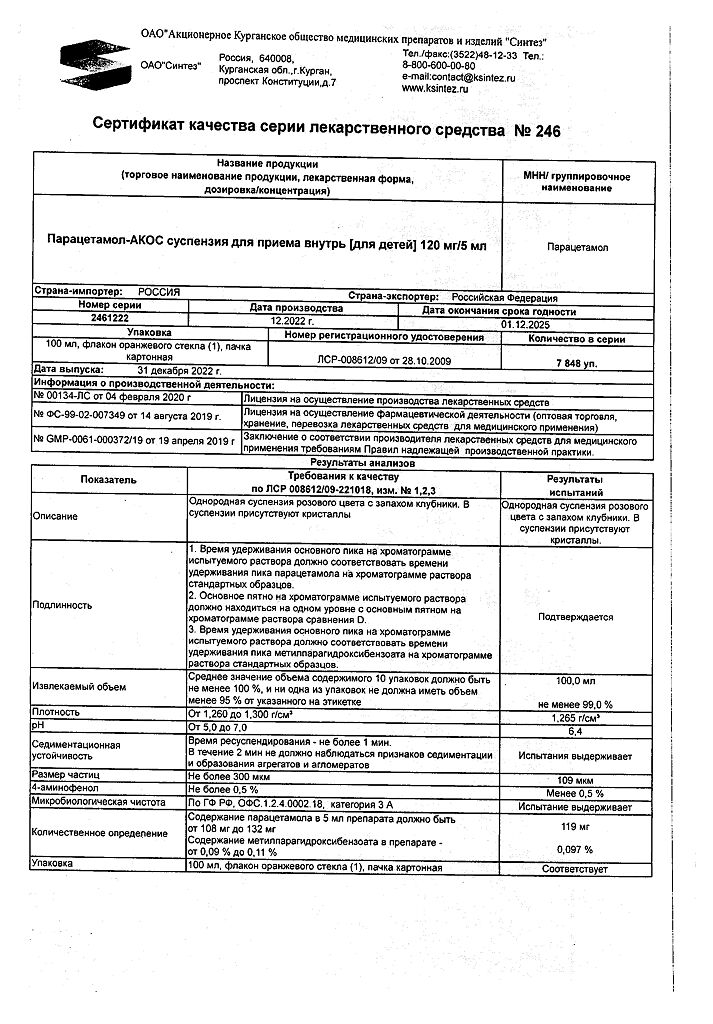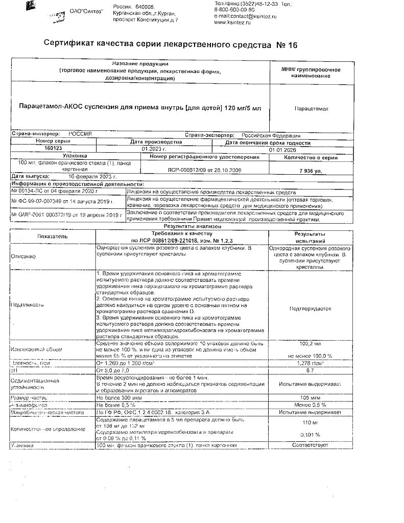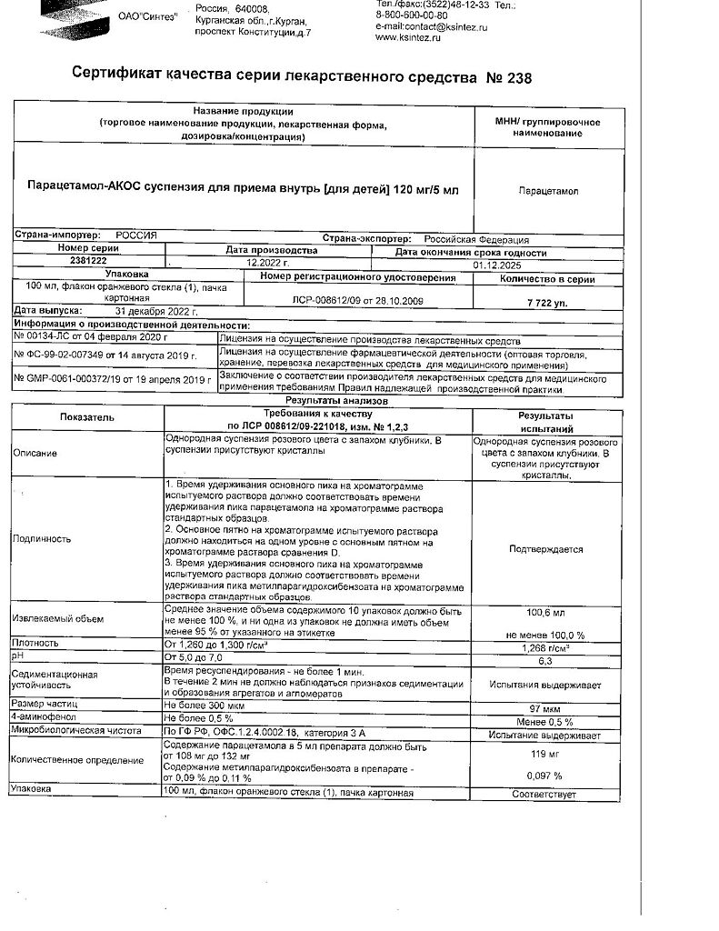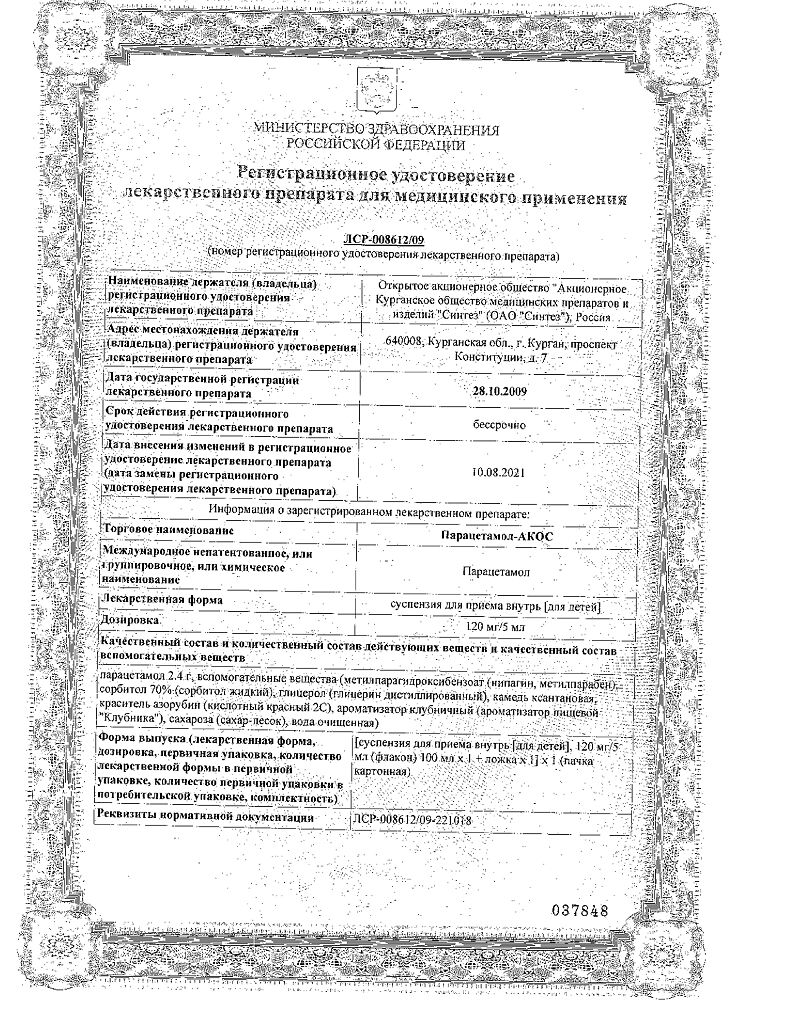 Документы Парацетамол-АКОС для детей суспензия для приема внутрь 120 мг/5 мл 100 мл 1 шт