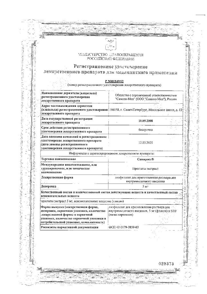 Сампрост способствует уменьшению отека, лейкоцитарной инфильтрации и тромбоза венул предстательной железы, нормализирует секреторную функцию эпителиальных клеток, увеличивает количество лецитиновых зерен в секрете ацинусов, стимулирует мышечный тонус мочевого пузыря.