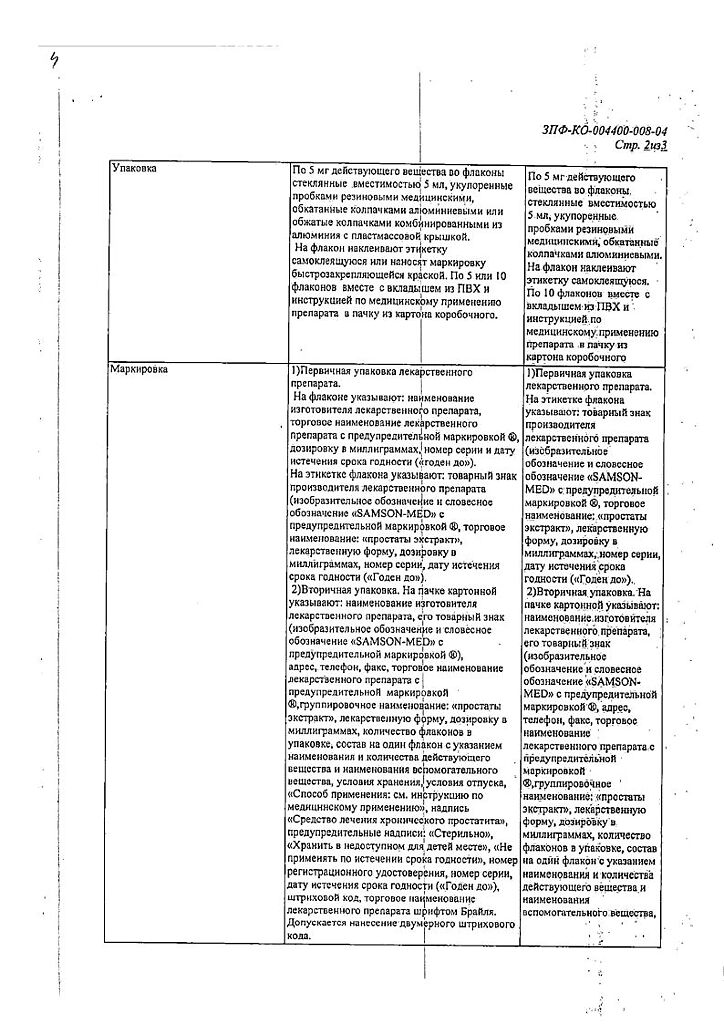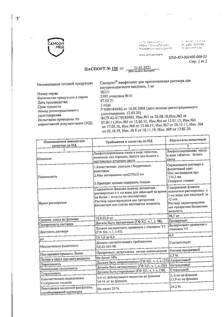 Сампрост вводят внутримышечно по 5-10 мг 1 раз/сутки в течение 5-10 дней.