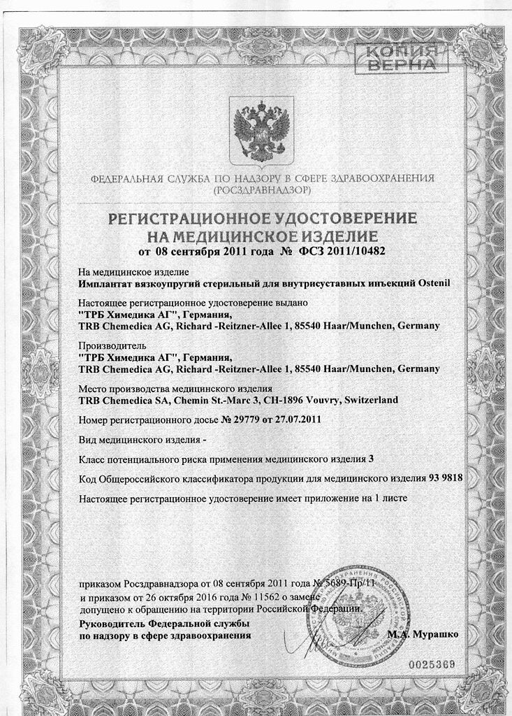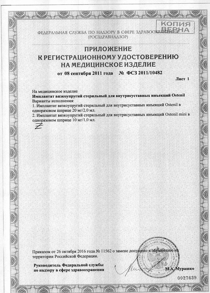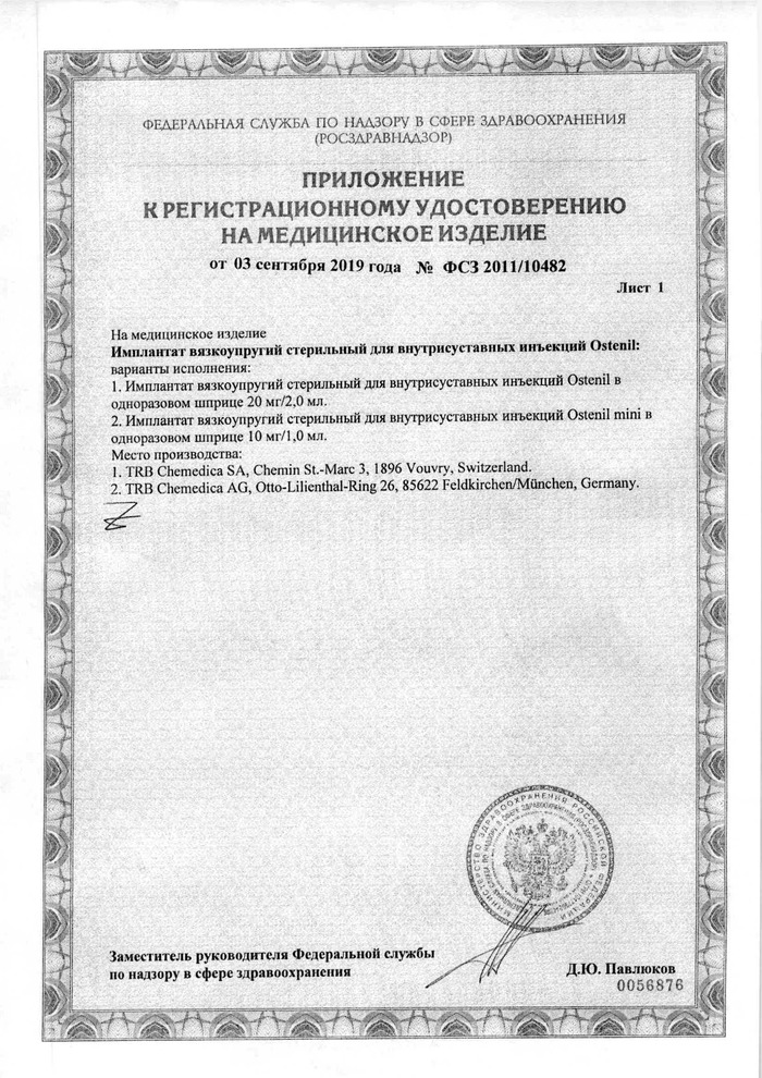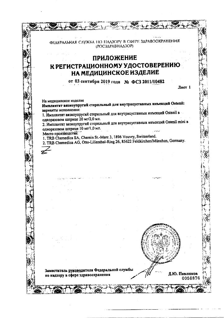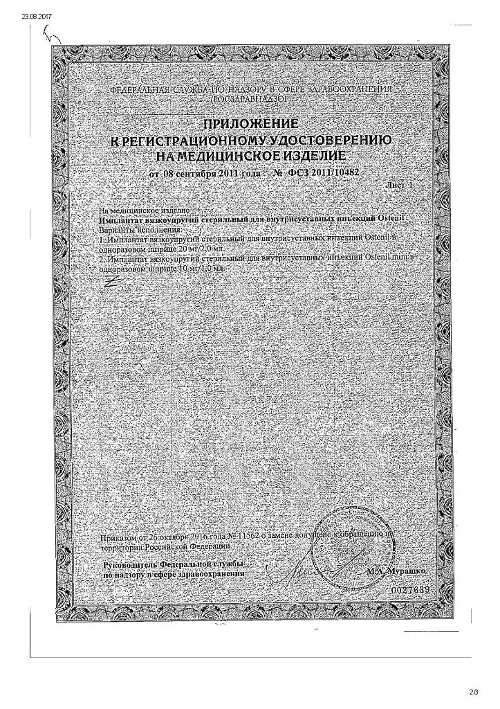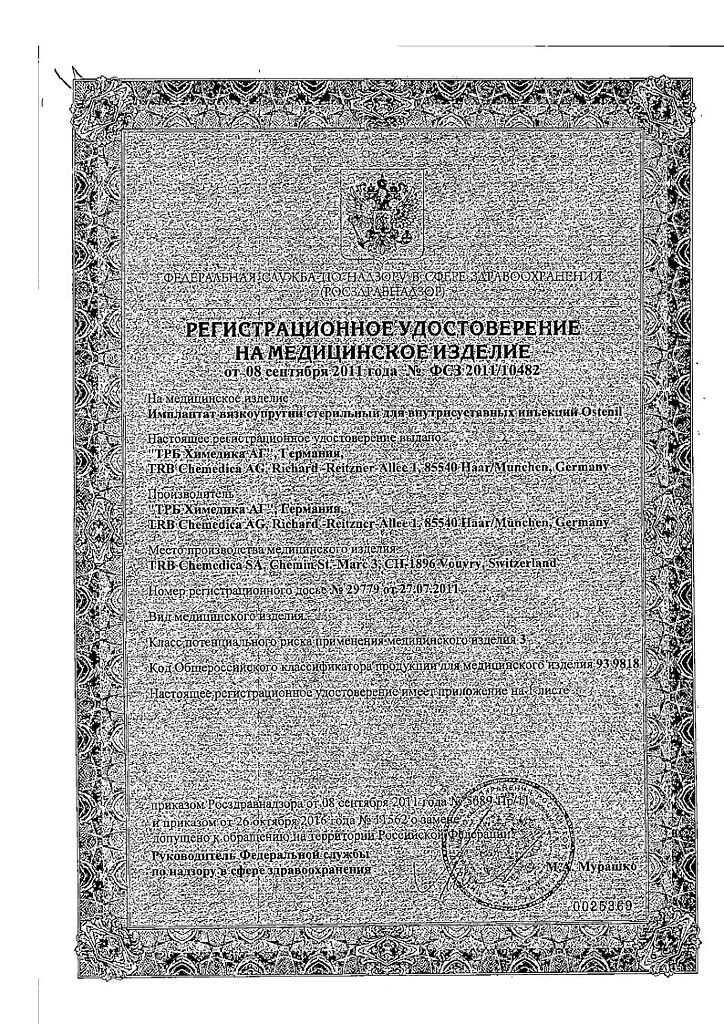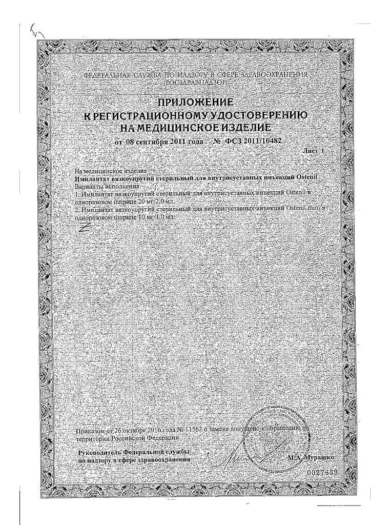 Документы Остенил средство для внутрисуставного введения 20 мг/2 мл шприц 1 шт