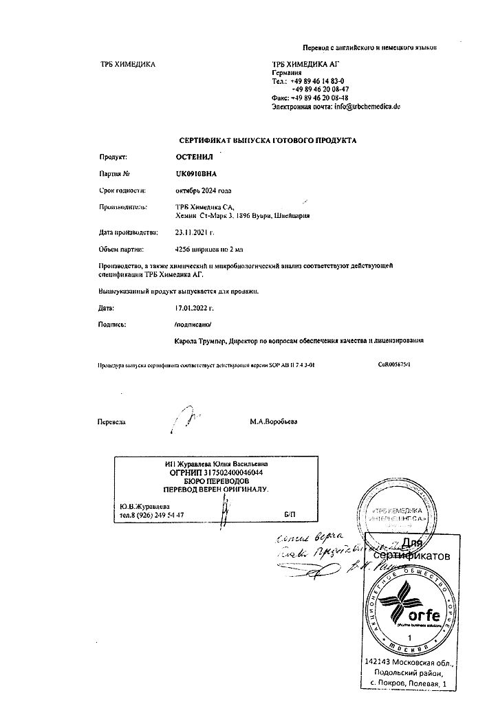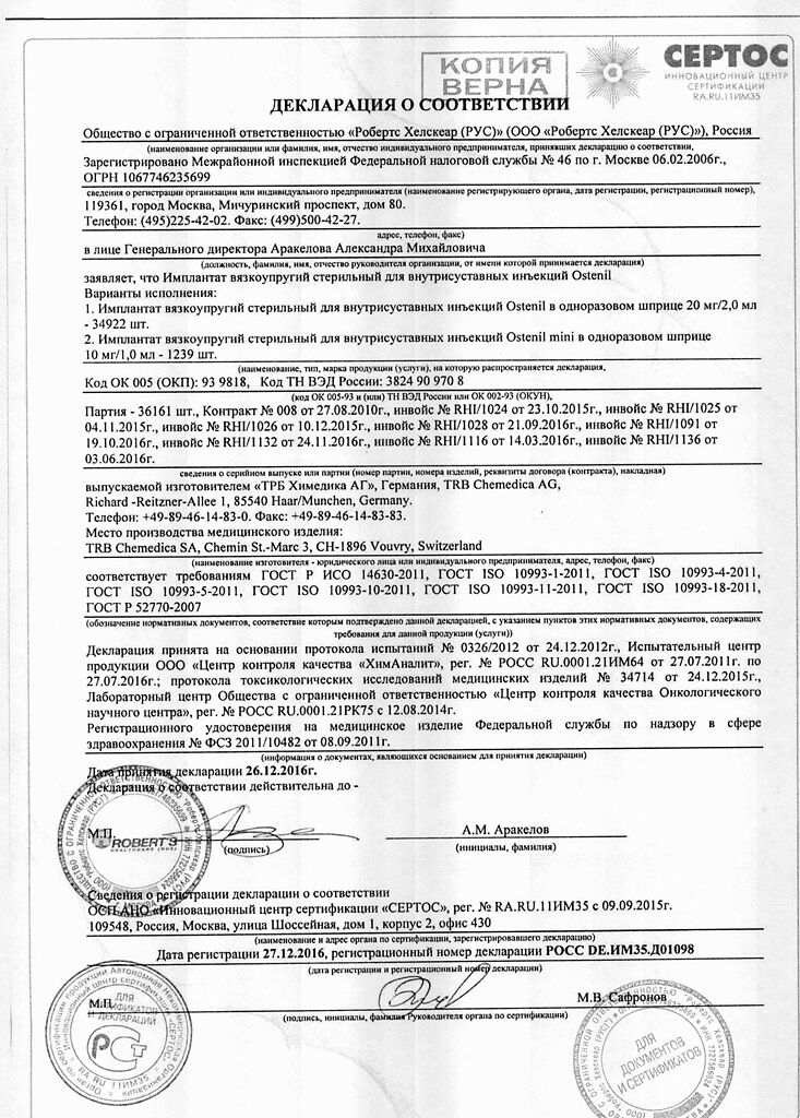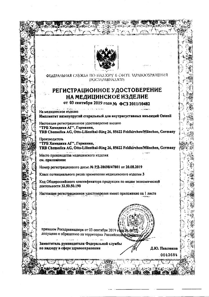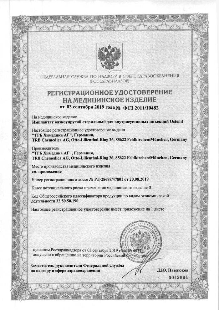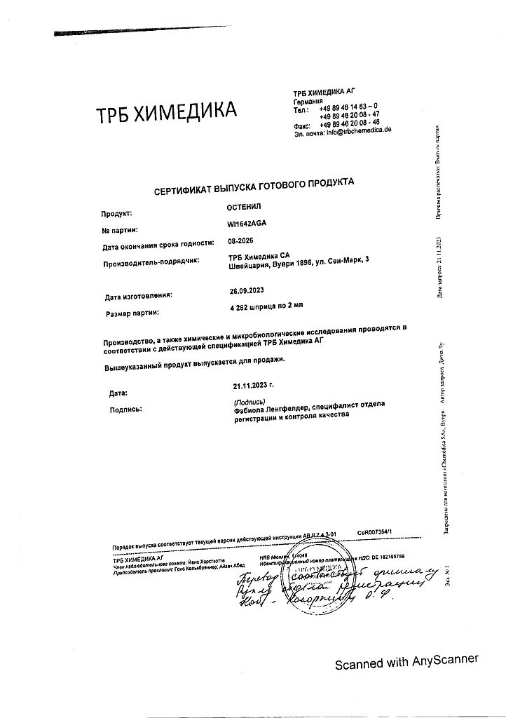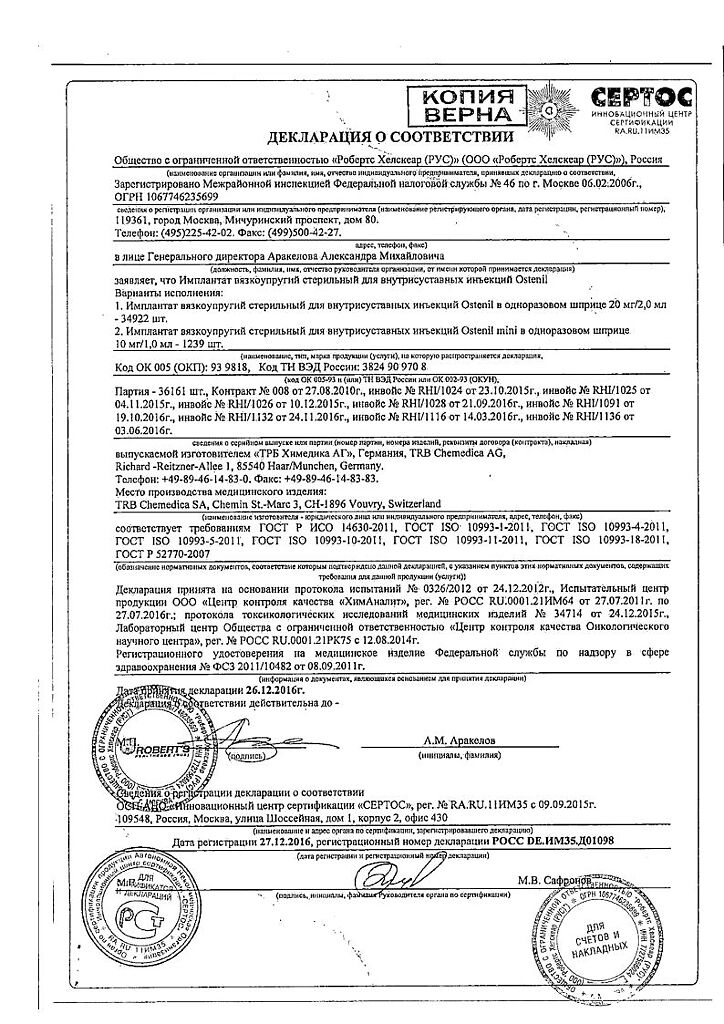 Документы Остенил средство для внутрисуставного введения 20 мг/2 мл шприц 1 шт