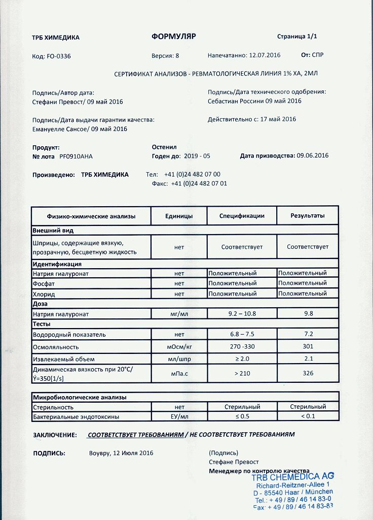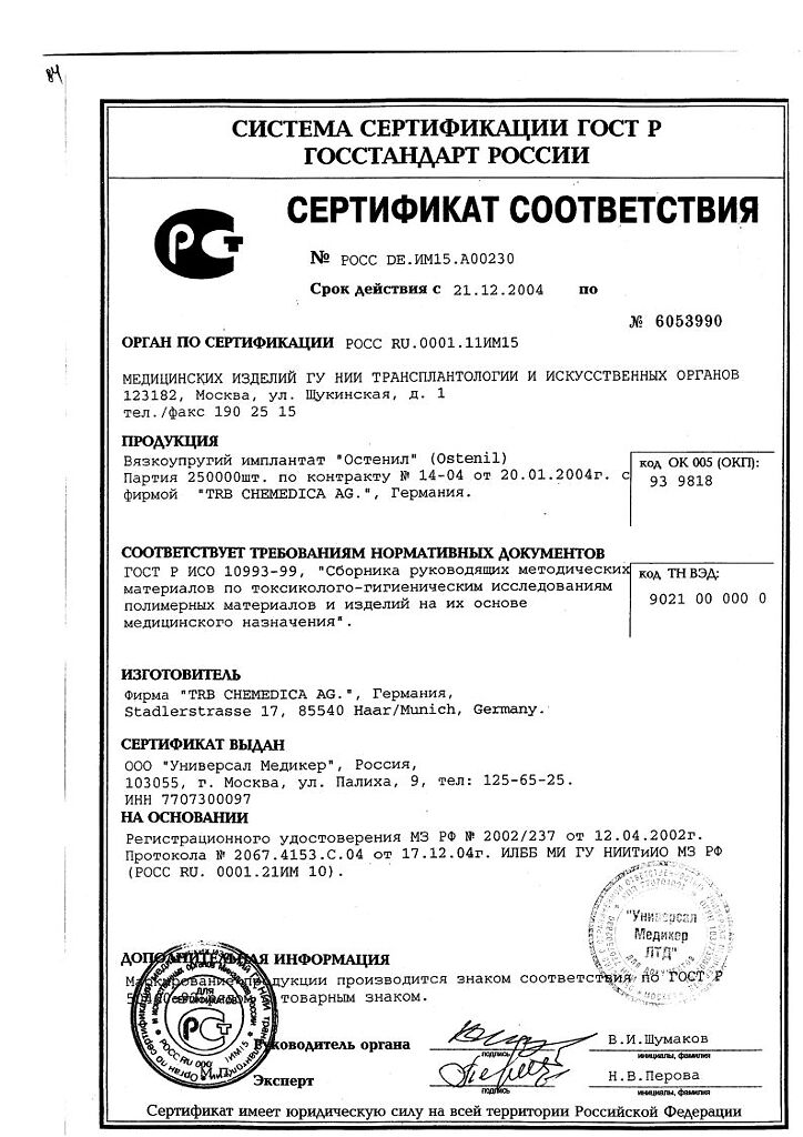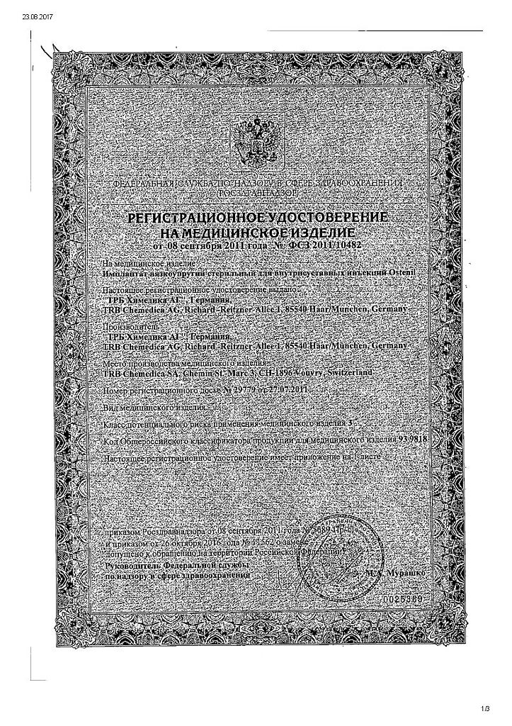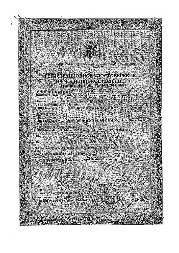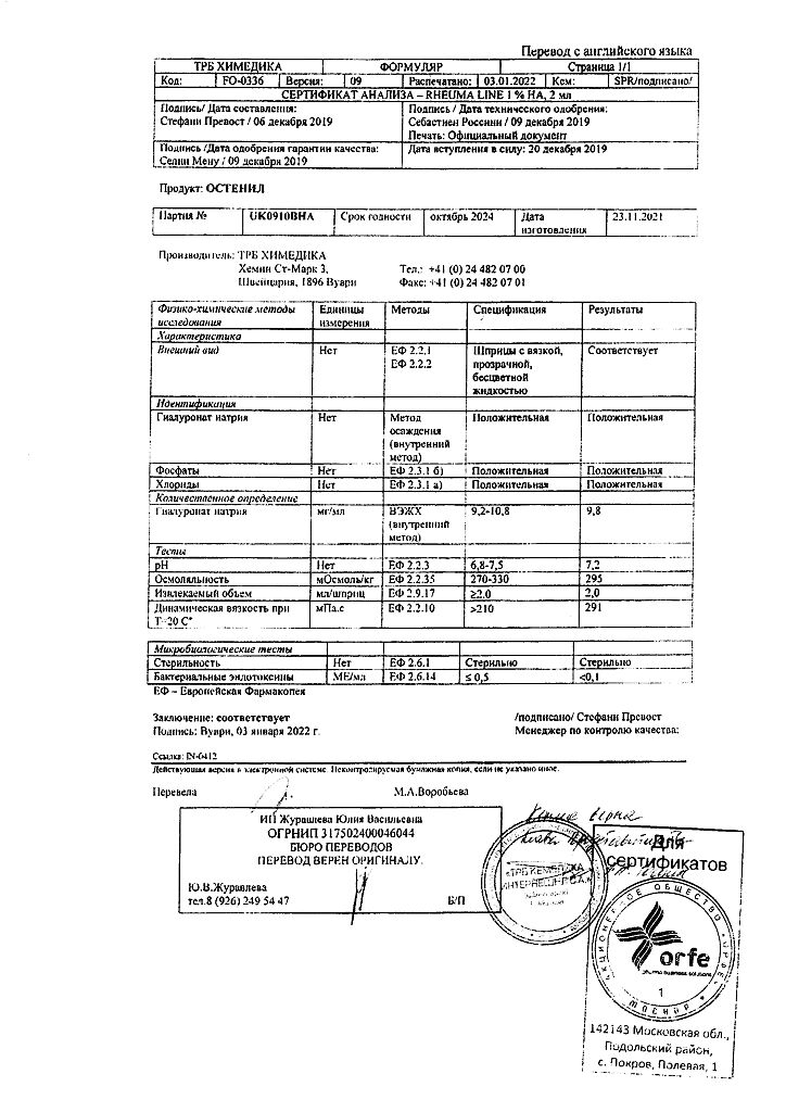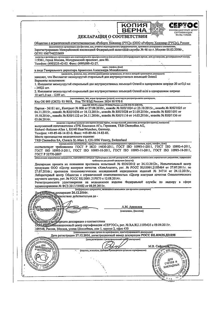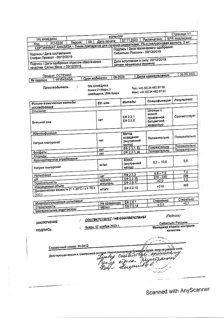 Документы Остенил средство для внутрисуставного введения 20 мг/2 мл шприц 1 шт