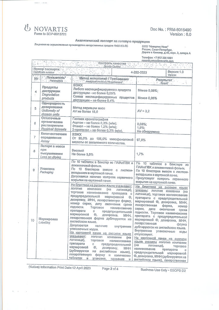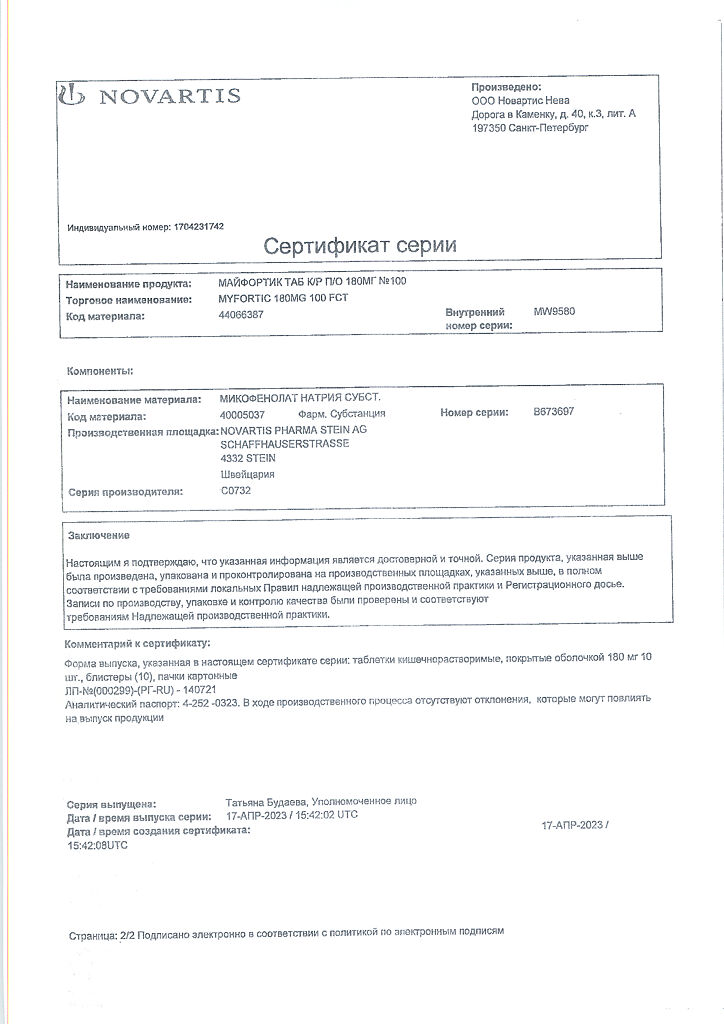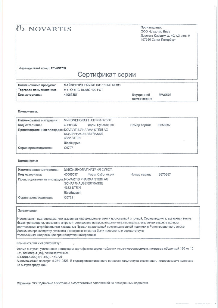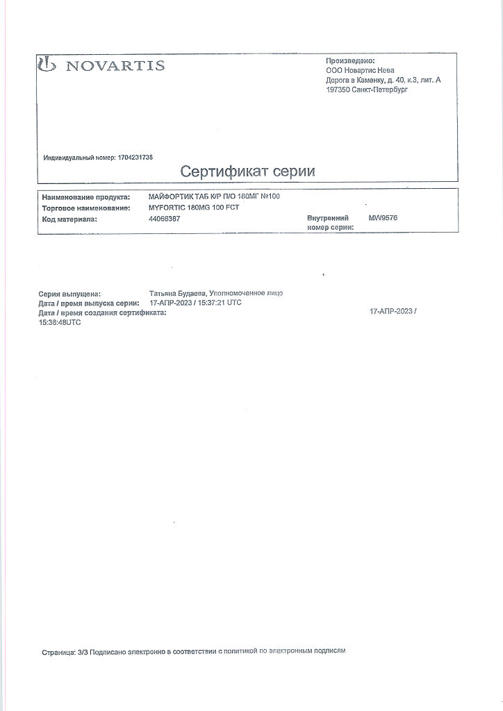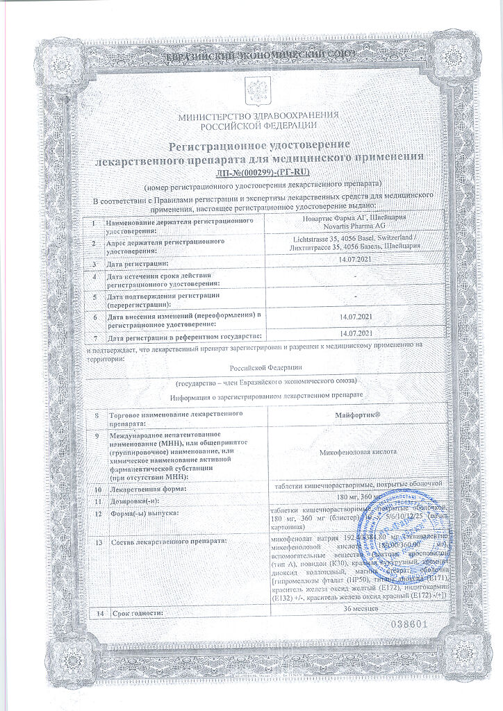 Документы Майфортик таблетки кишечнорастворимые покрыт.об. 180 мг 100 шт