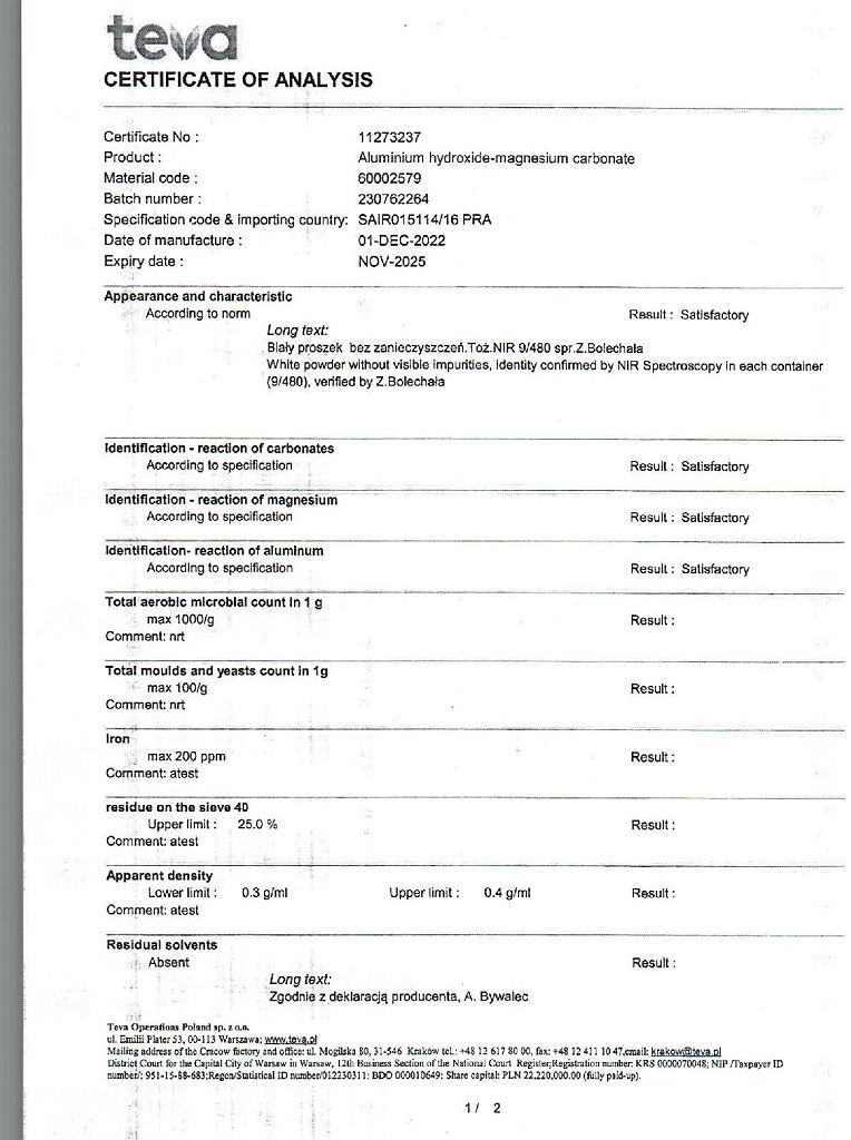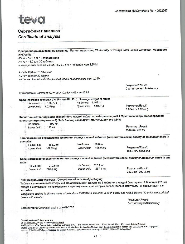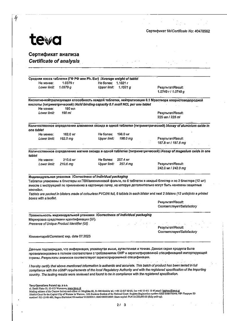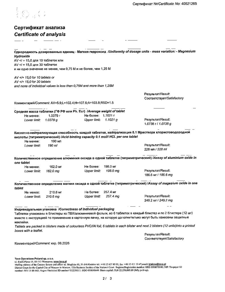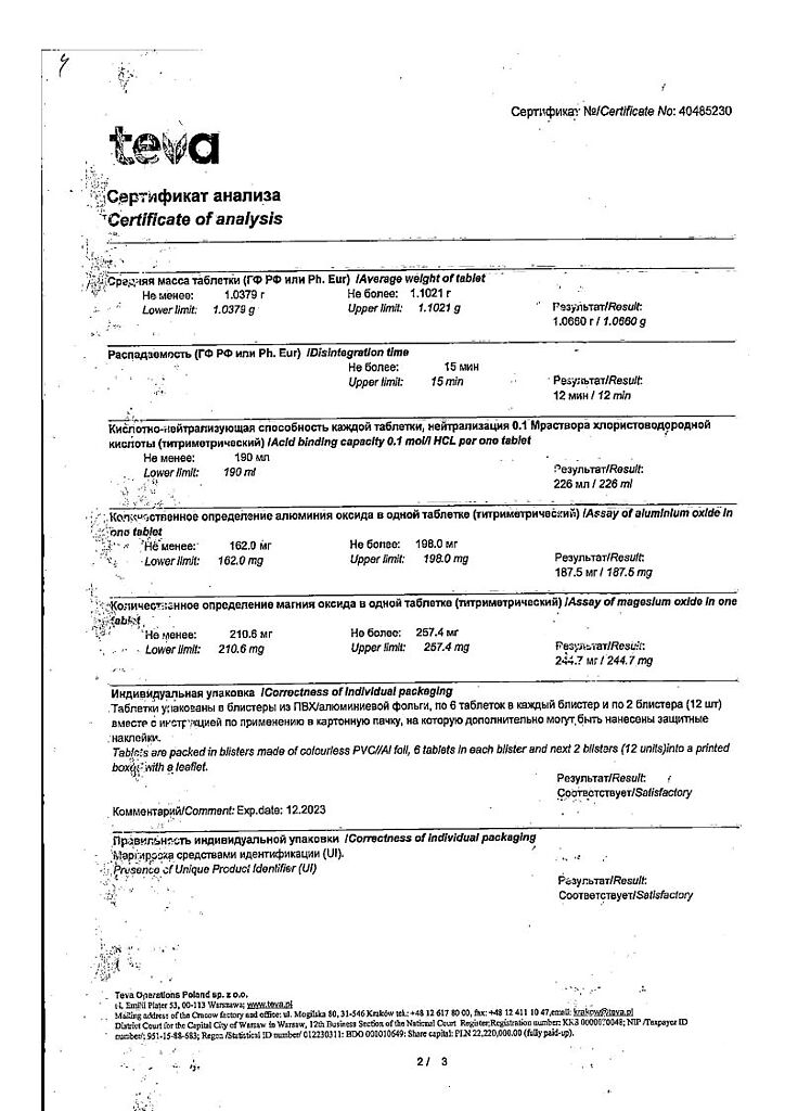 Действующее вещество: Алюминия гидроксид-магния карбонат, магния гидроксид