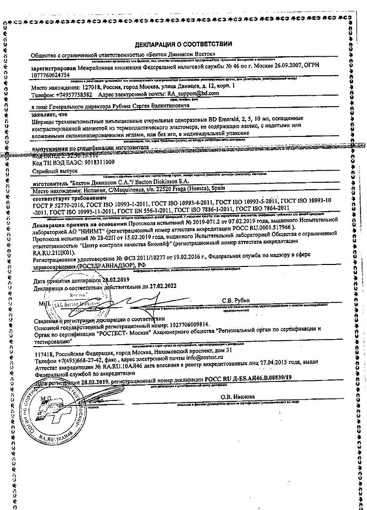 Шприц BD Emerald™ соответствует международным стандартам ISO: имеет сертификат СЕ что свидетельствует о безопасности продукта для потребителя и его соответствии экологическим нормам, а также о том, что продукт может продаваться во всех странах на территории Евросоюза без дополнительной сертификации.