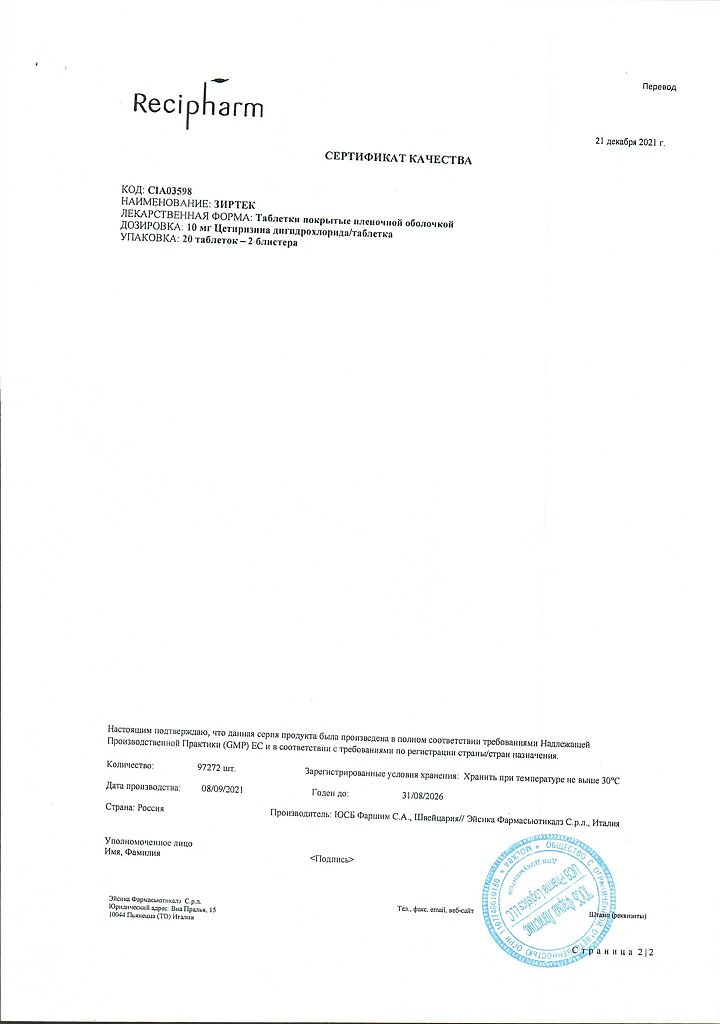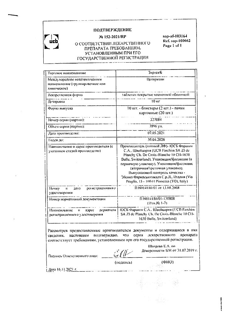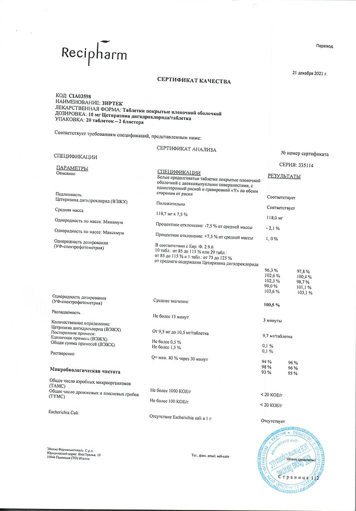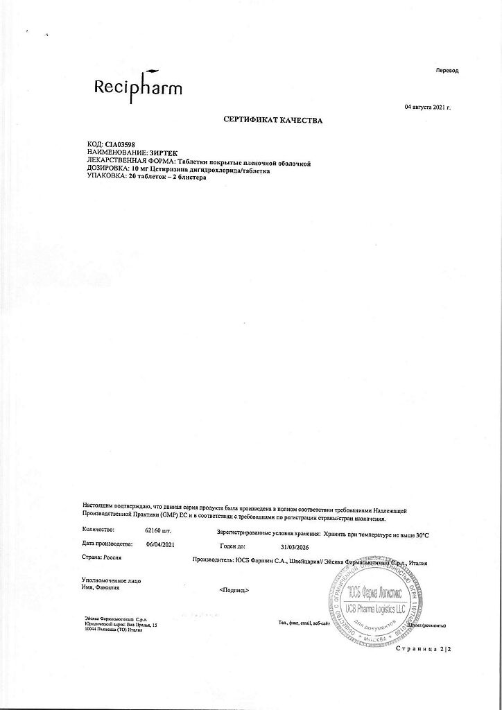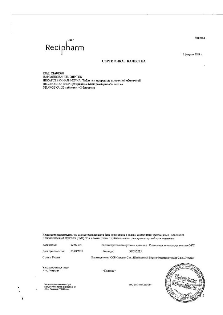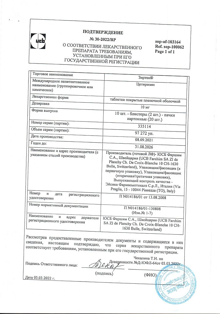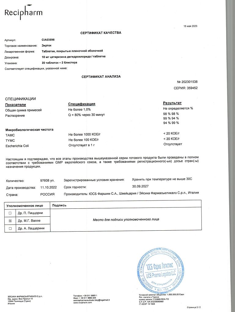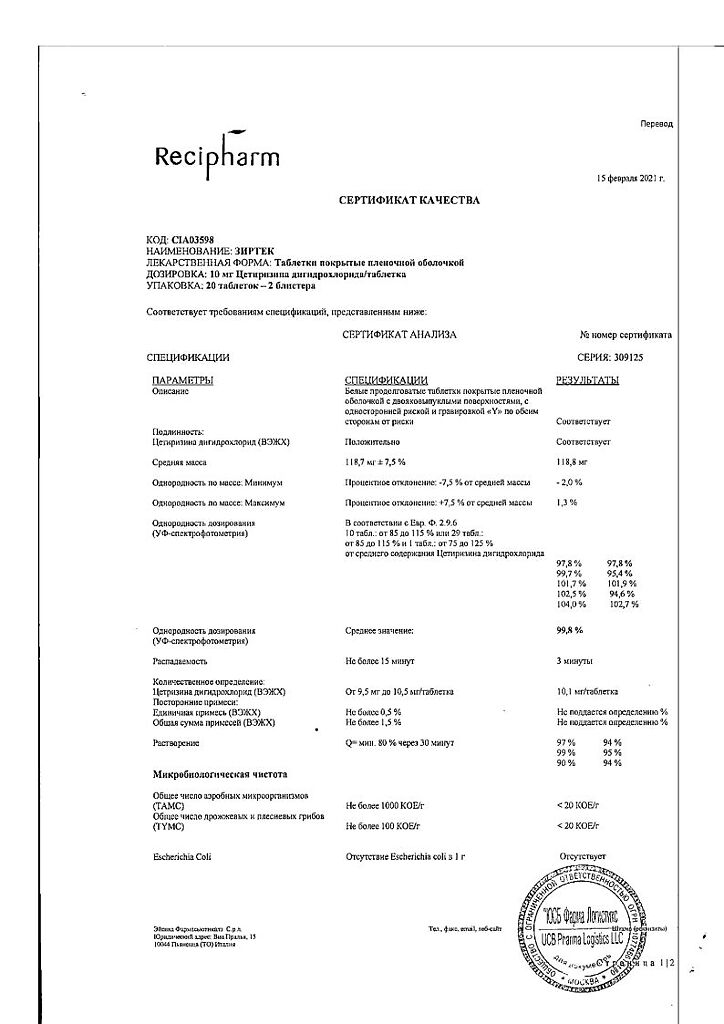 Действующее вещество: Цетиризин