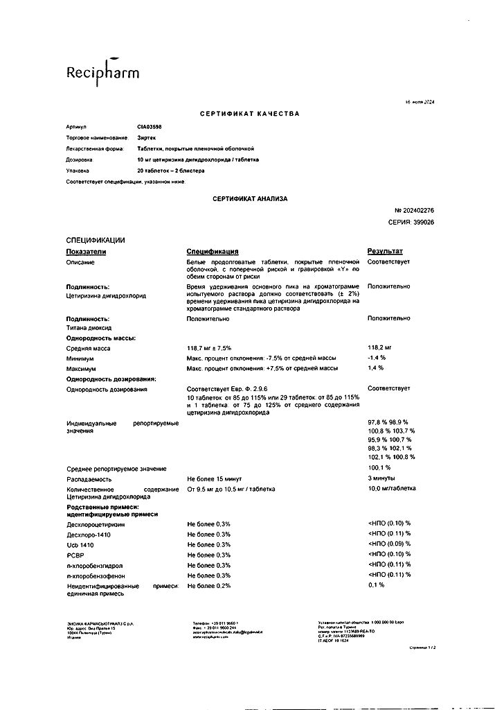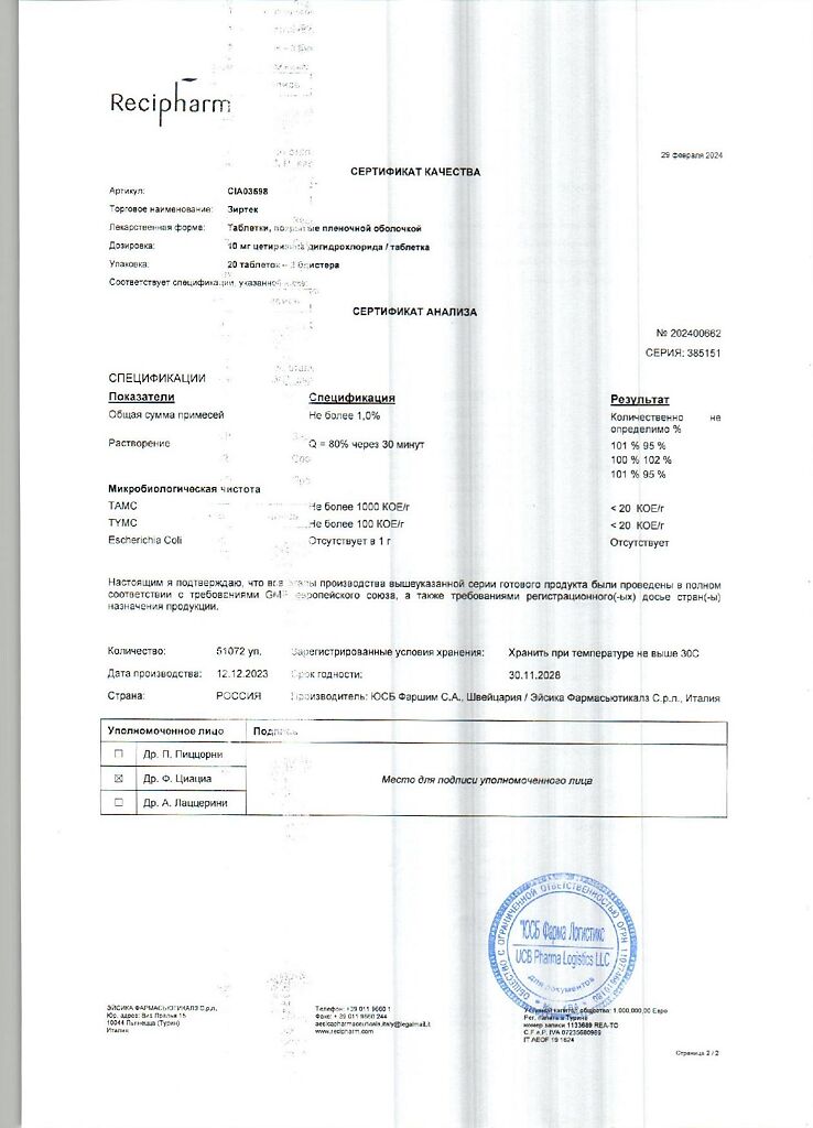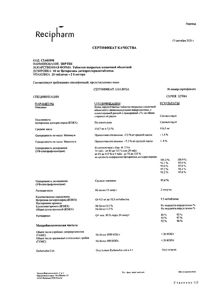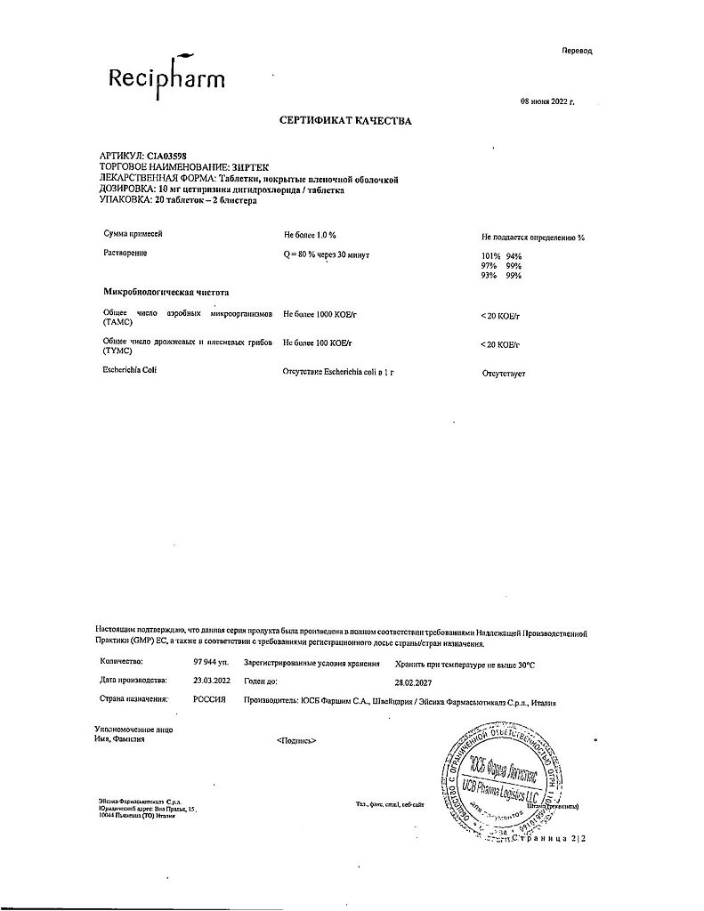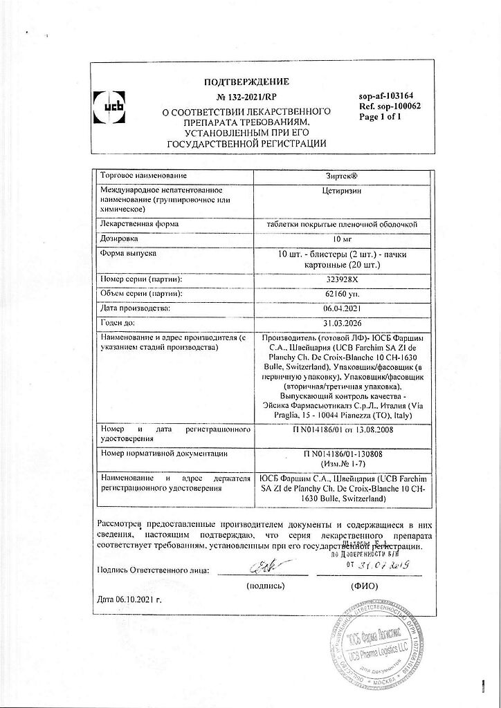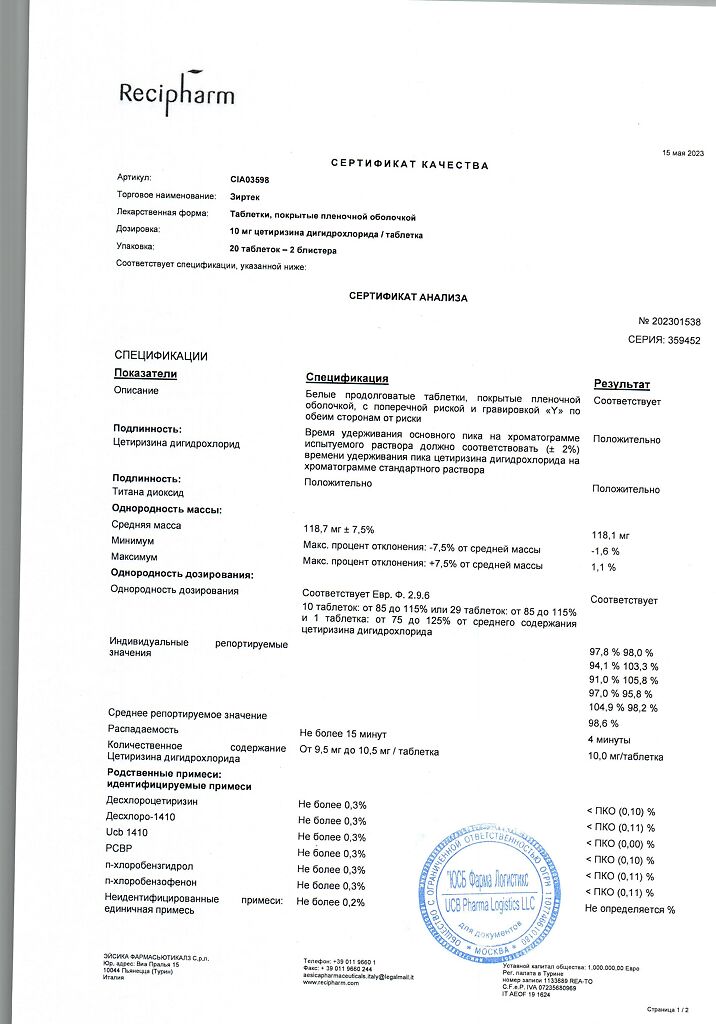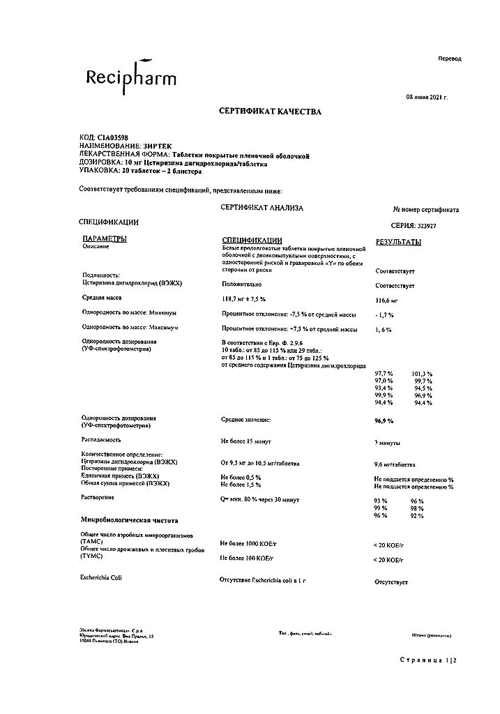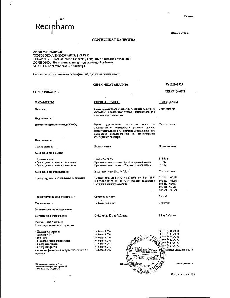 Действующее вещество: Цетиризин